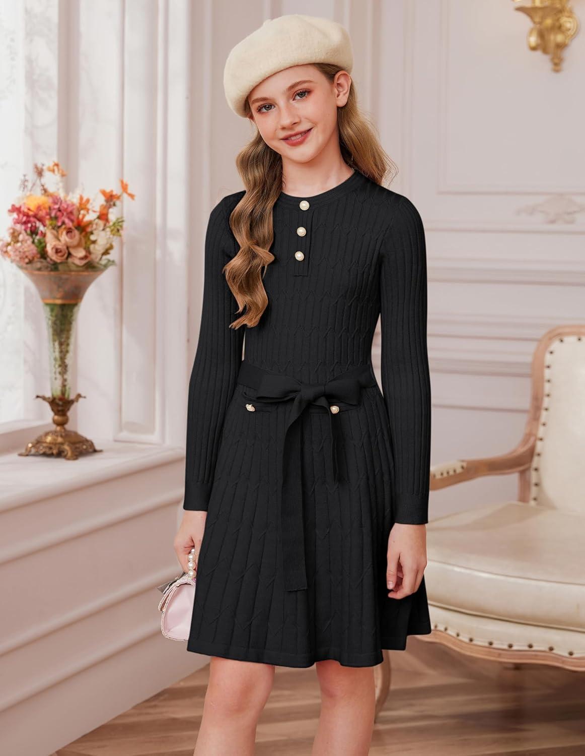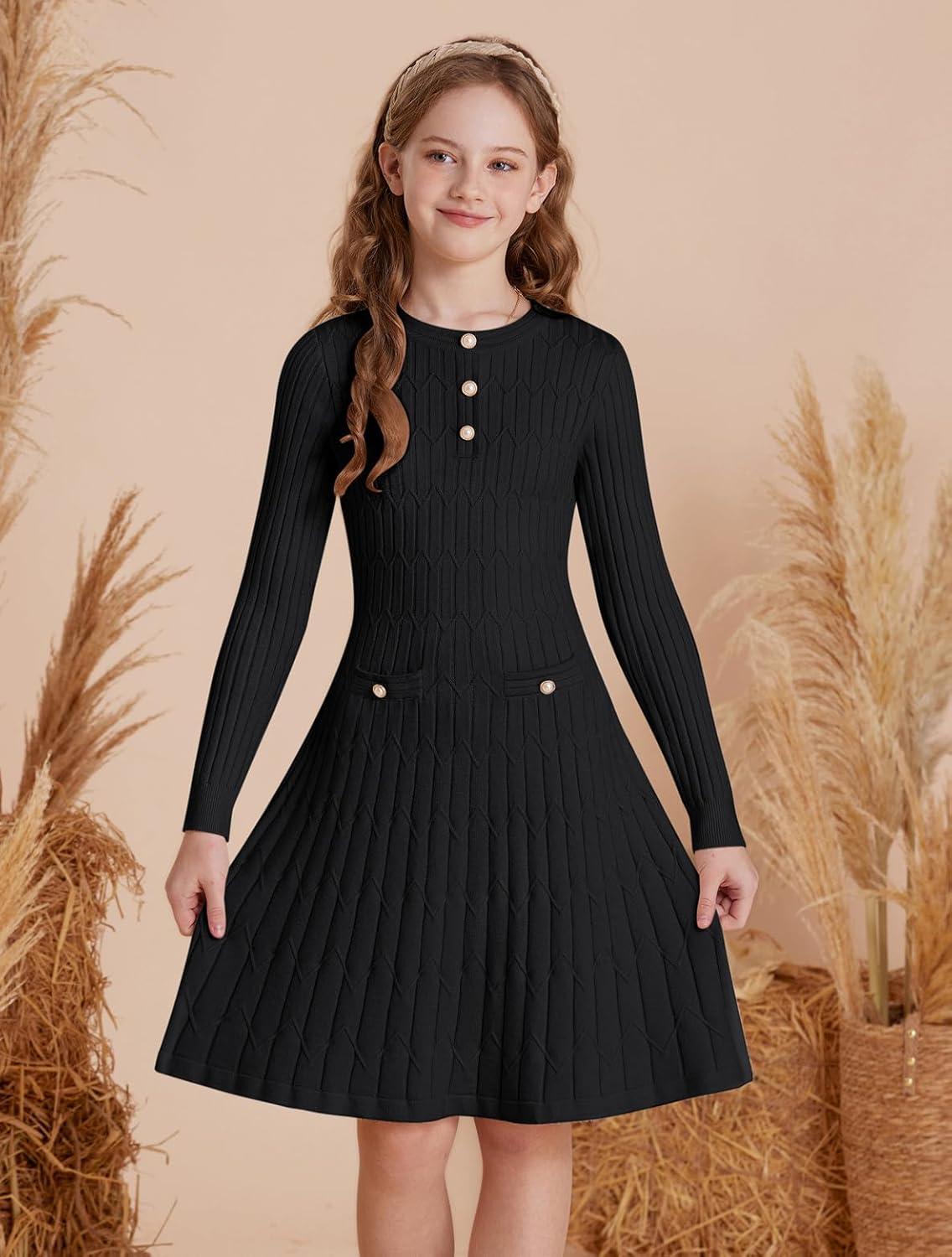 GRACE KARIN Girls Dress Fall Winter Sweater Long Sleeve Cable Knit Button Casual Dresses for Teen Girl 6-14Y(Black)