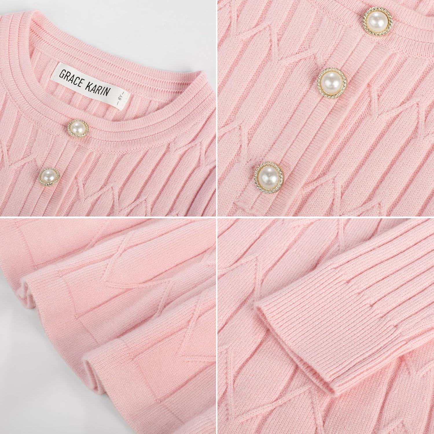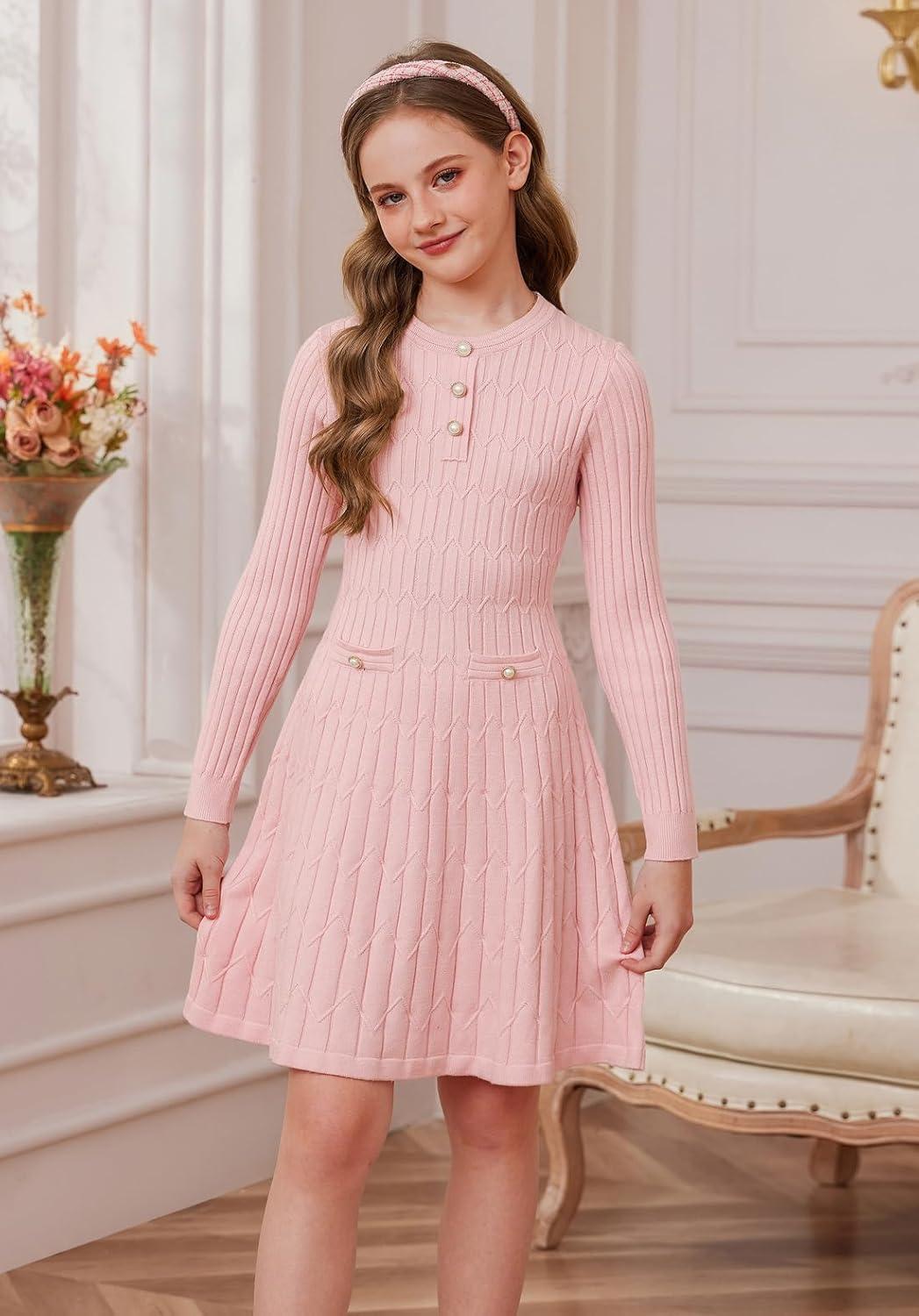 GRACE KARIN Girls Dress Fall Winter Sweater Long Sleeve Cable Knit Button Casual Dresses for Teen Girl 6-14Y(Pink)