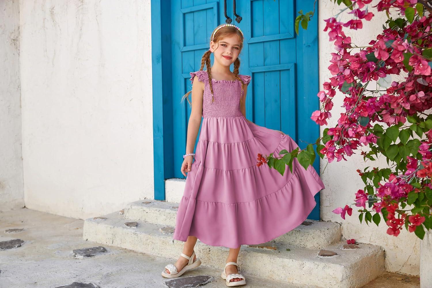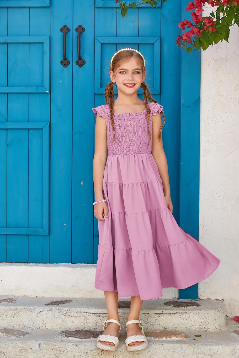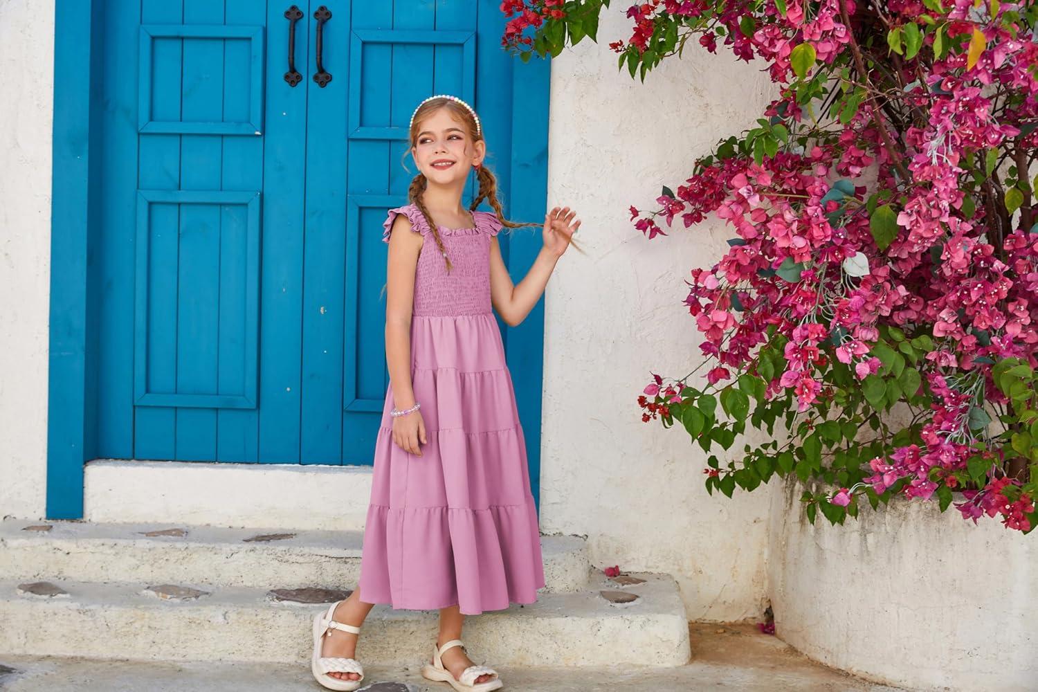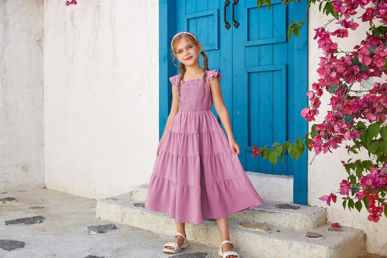 GRACE KARIN Girls Dress Summer Tie Back Party Dress Ruffle Sleeve Smoke Tiered Special Occasions Maxi Tween Dresses Size 5-14(Grey Purple)