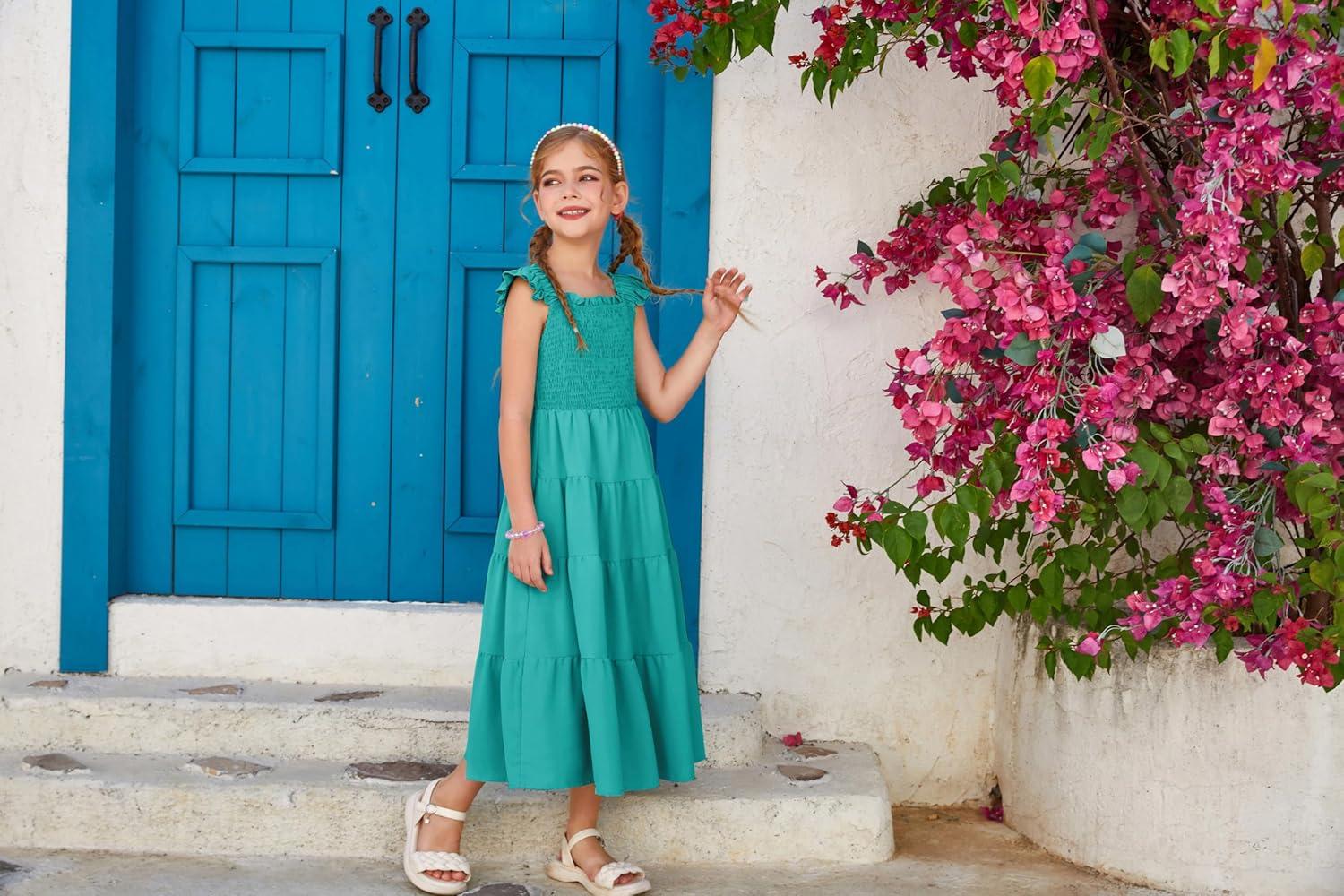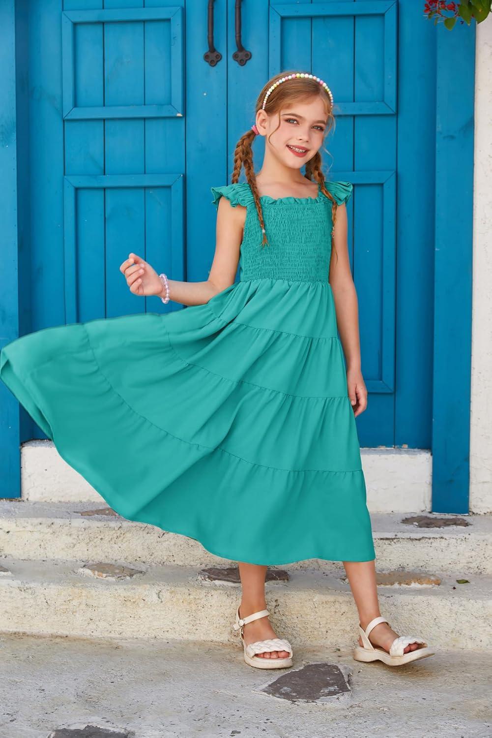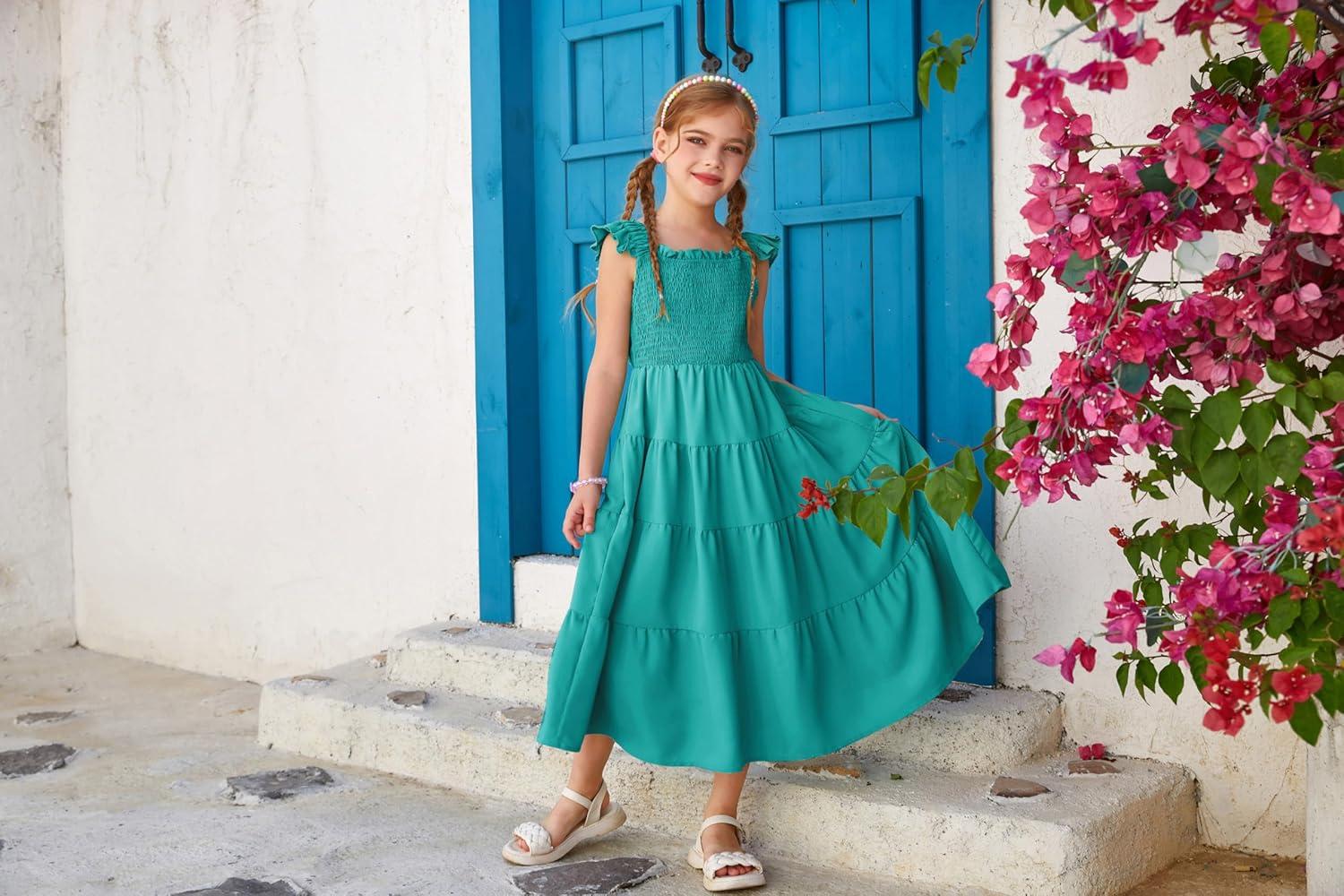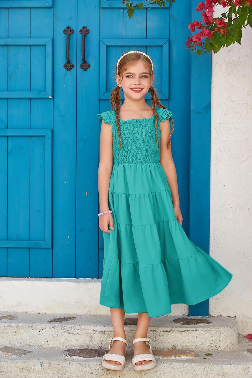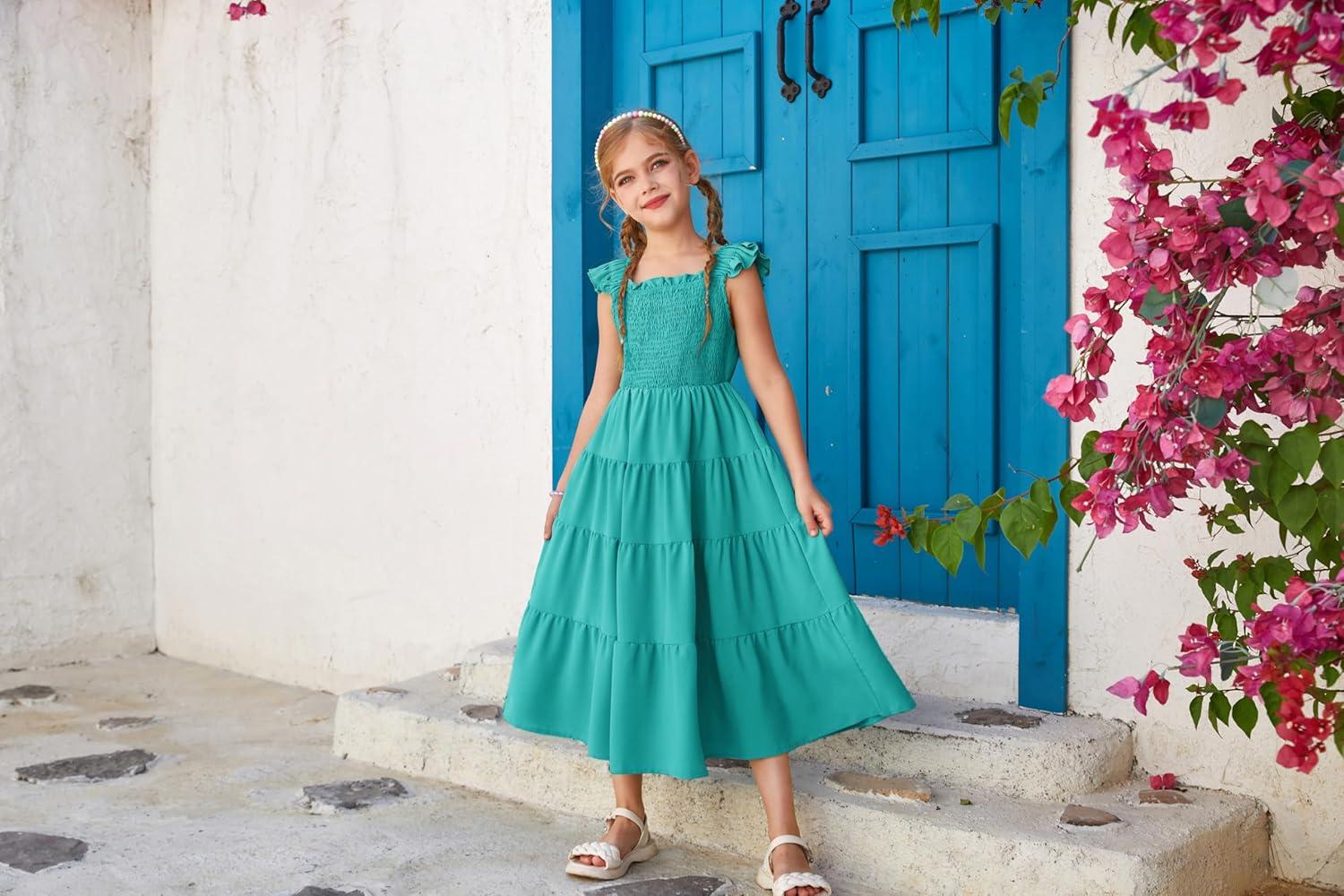GRACE KARIN Girls Dress Summer Tie Back Party Dress Ruffle Sleeve Smoke Tiered Special Occasions Maxi Tween Dresses Size 5-14(Lake Blue)