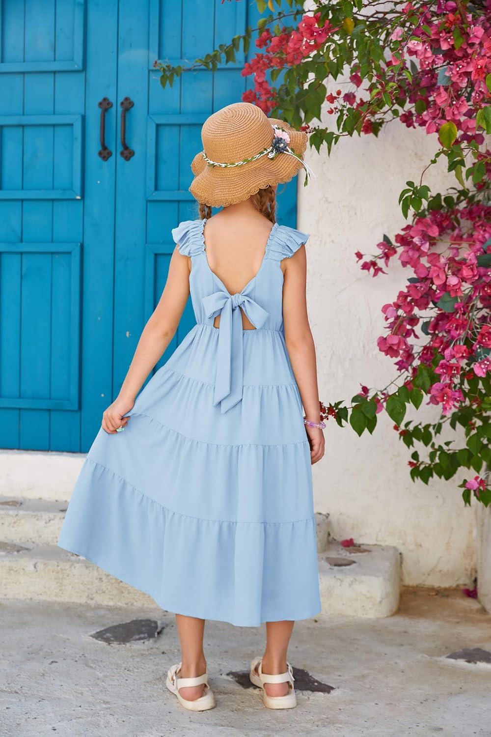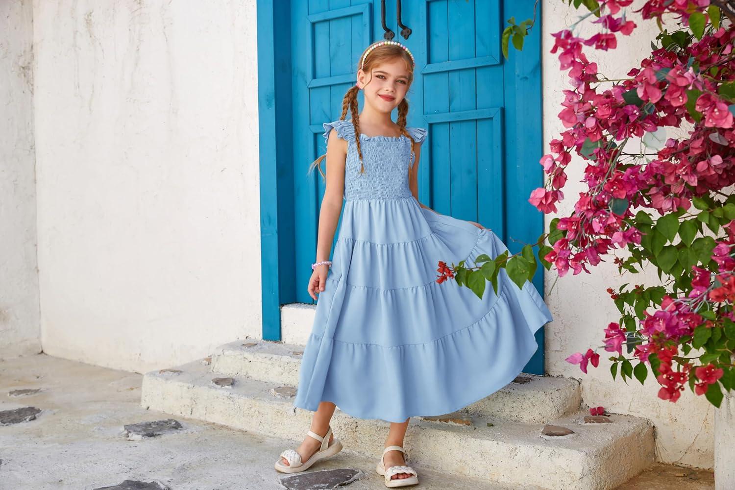 GRACE KARIN Girls Dress Summer Tie Back Party Dress Ruffle Sleeve Smoke Tiered Special Occasions Maxi Tween Dresses Size 5-14(Lake Blue)
