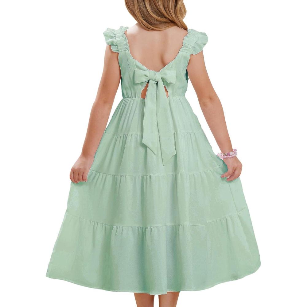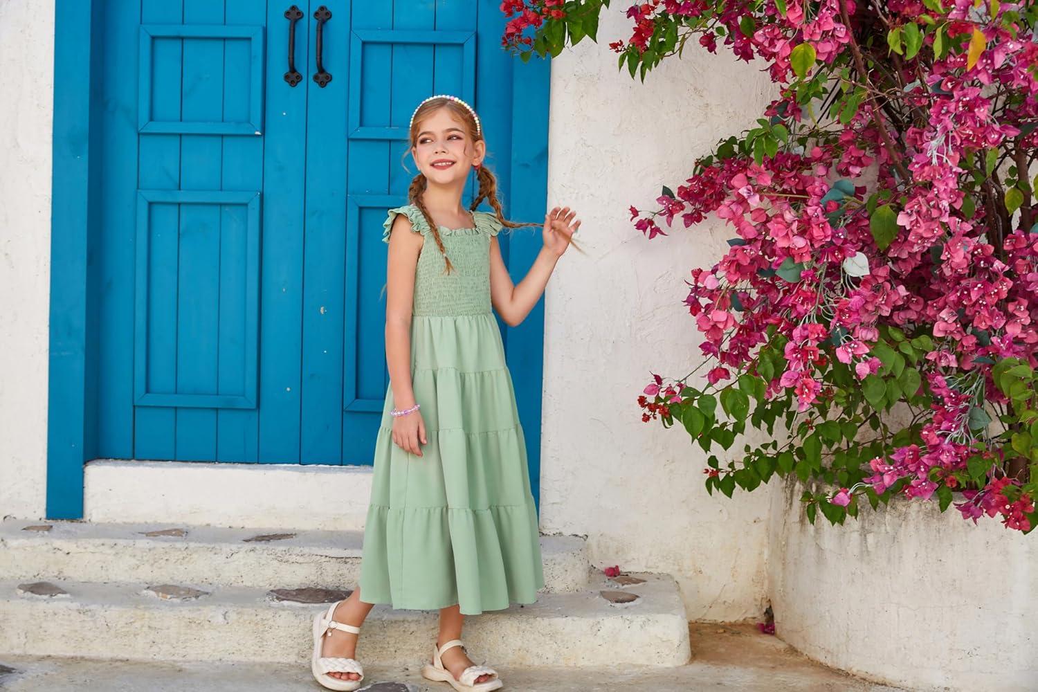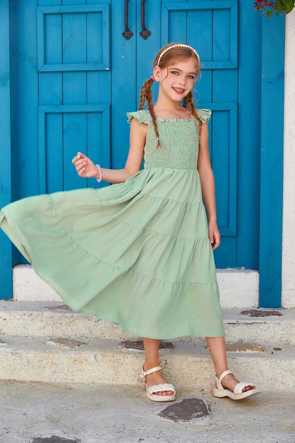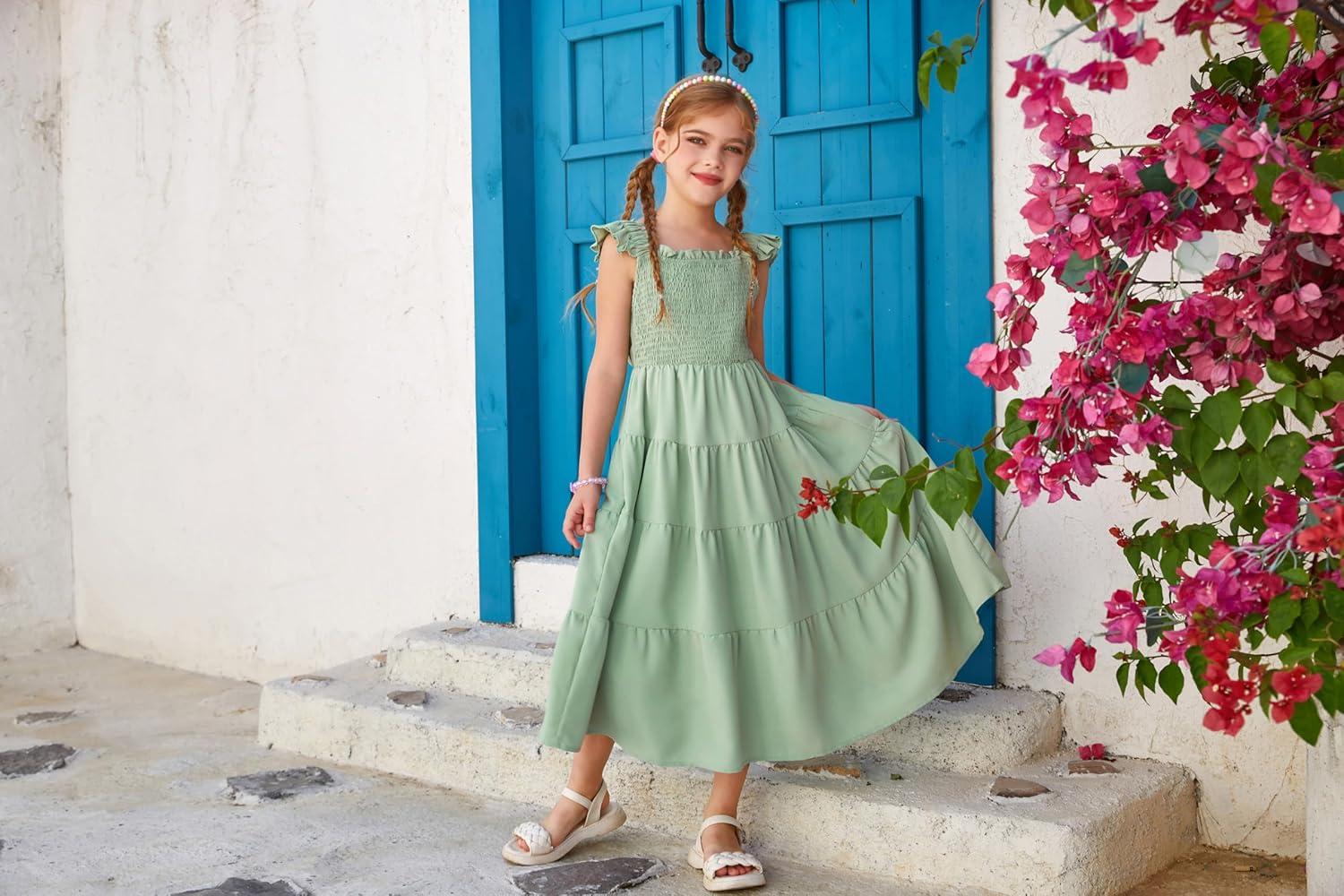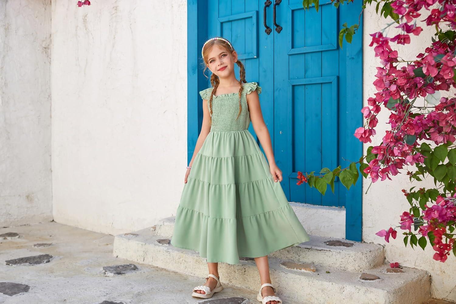 GRACE KARIN Girls Dress Summer Tie Back Party Dress Ruffle Sleeve Smoke Tiered Special Occasions Maxi Tween Dresses Size 5-14(Light Green)