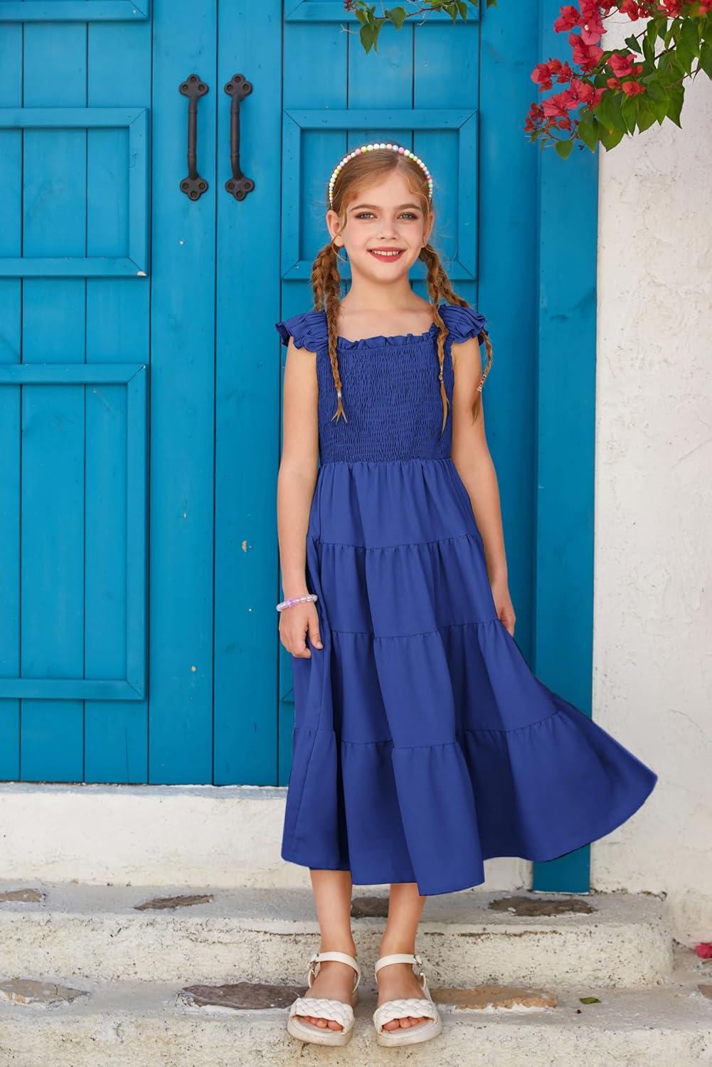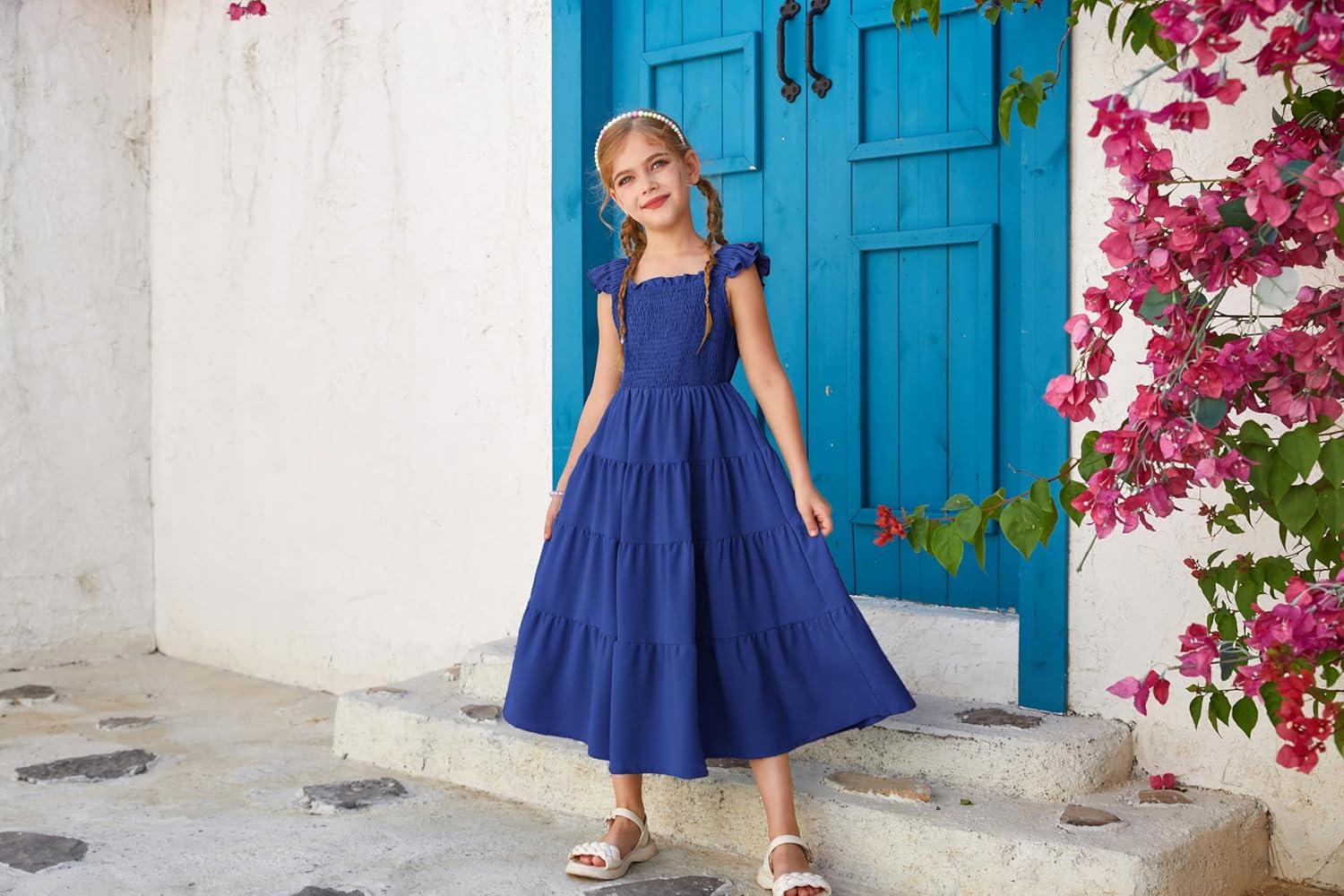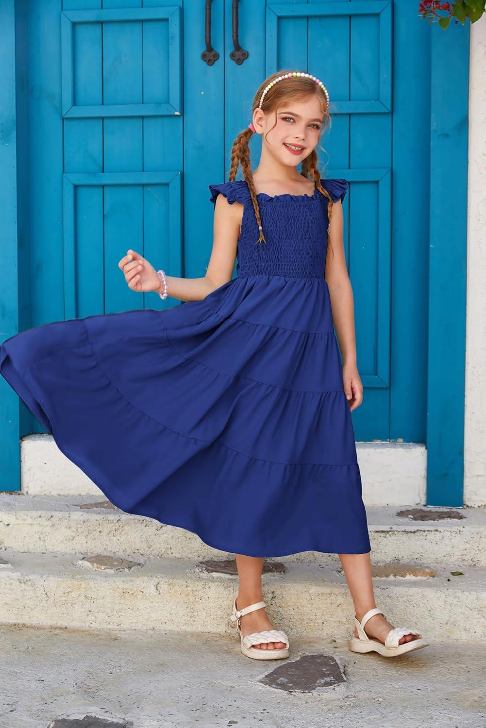 GRACE KARIN Girls Dress Summer Tie Back Party Dress Ruffle Sleeve Smoke Tiered Special Occasions Maxi Tween Dresses Size 5-14(Navy Blue)