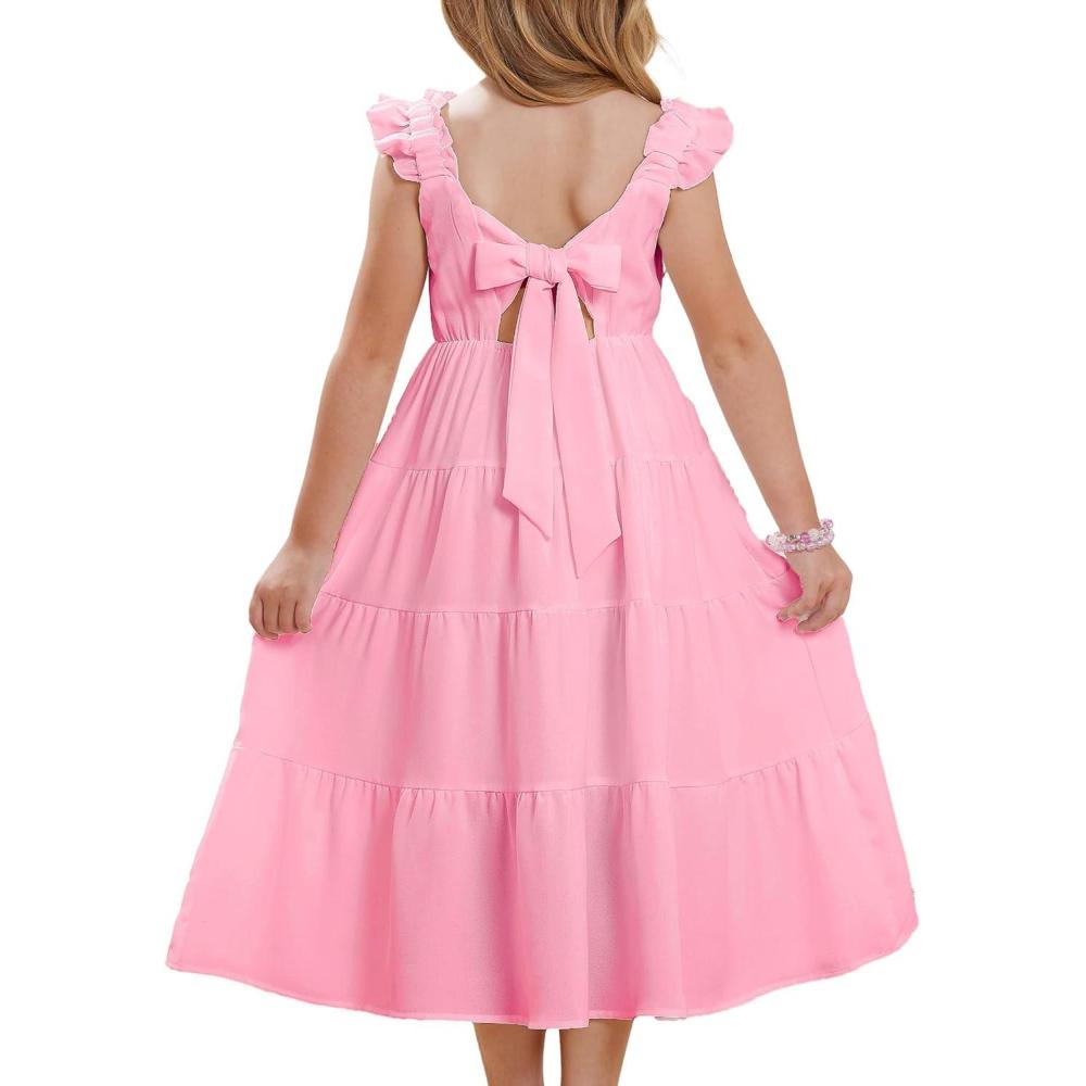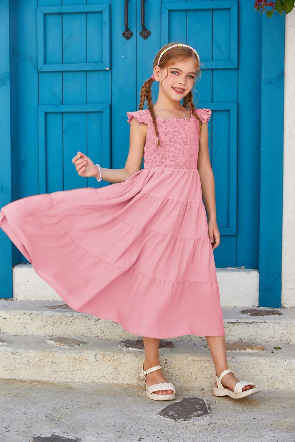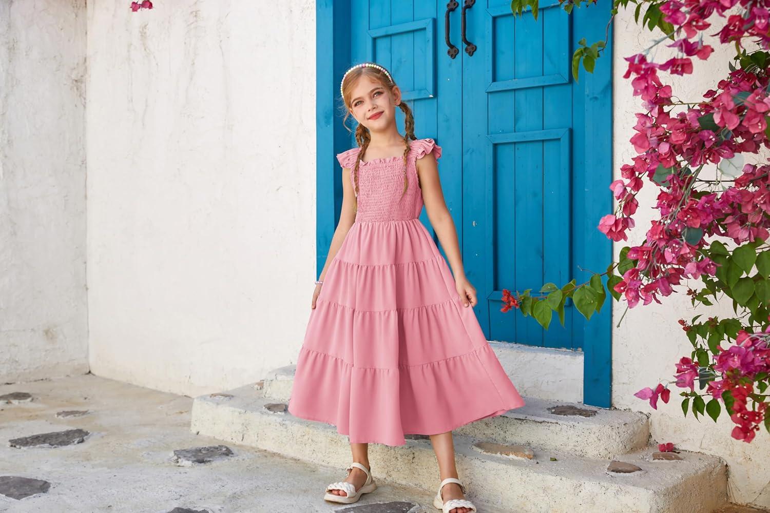 GRACE KARIN Girls Dress Summer Tie Back Party Dress Ruffle Sleeve Smoke Tiered Special Occasions Maxi Tween Dresses Size 5-14(Pink)