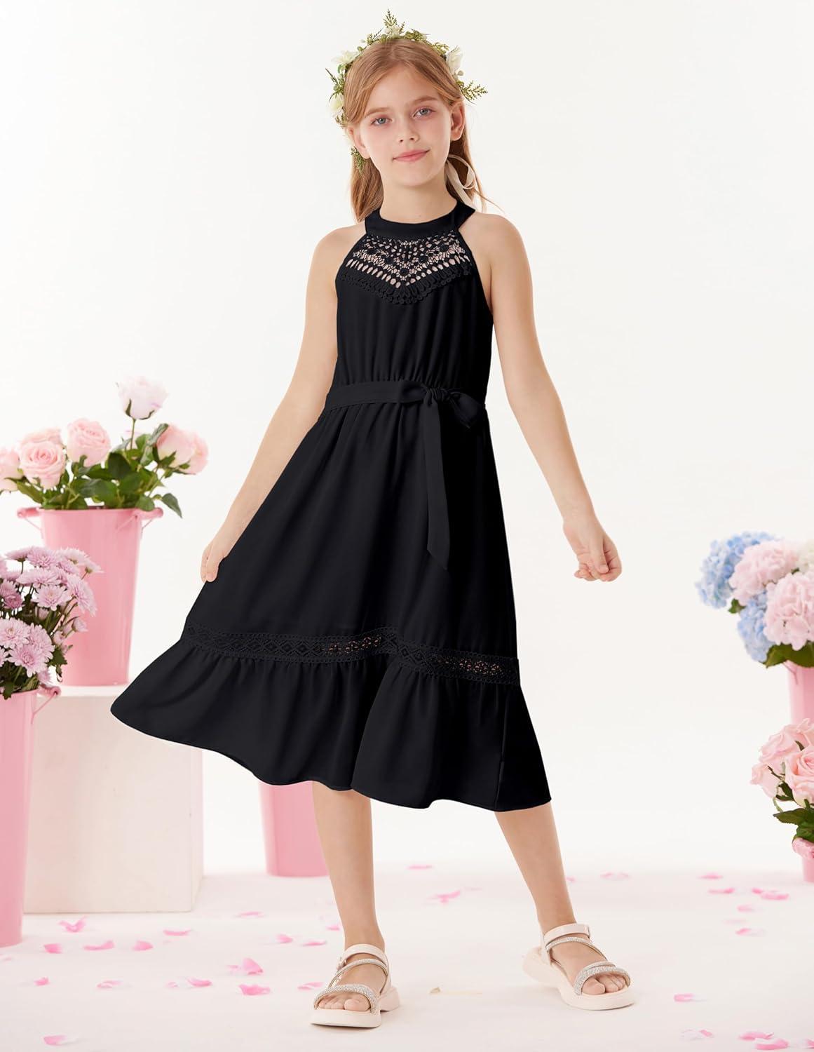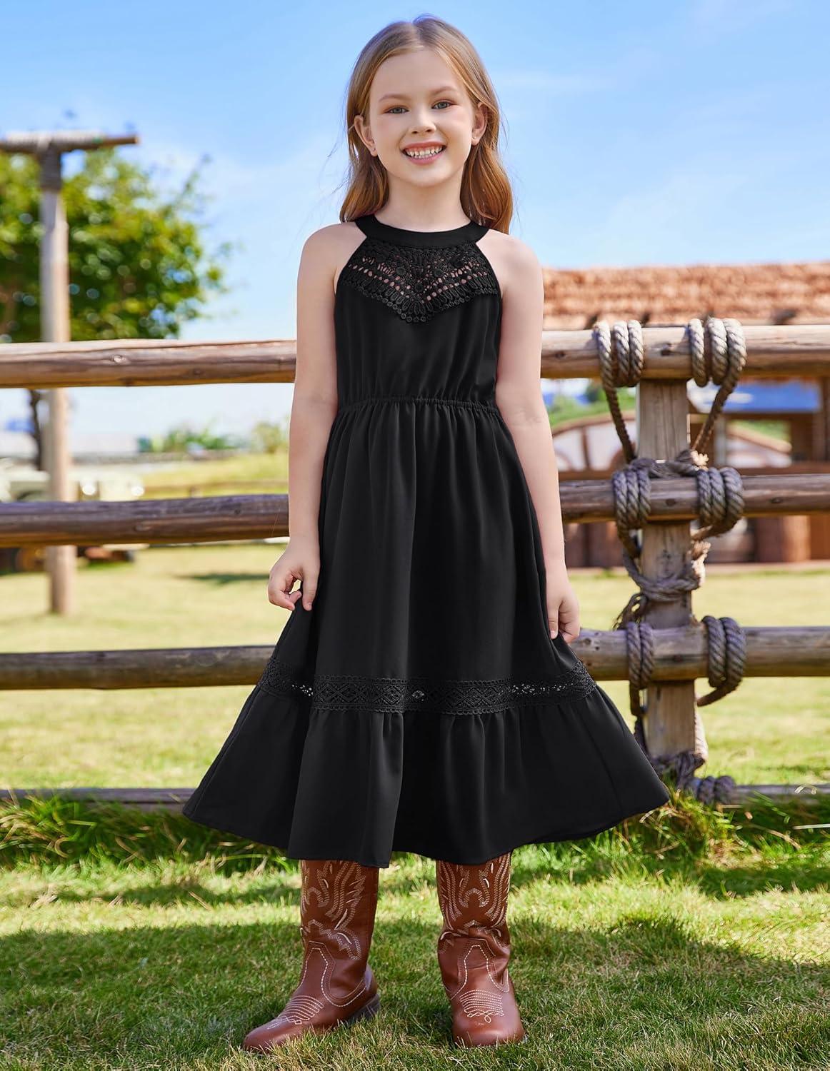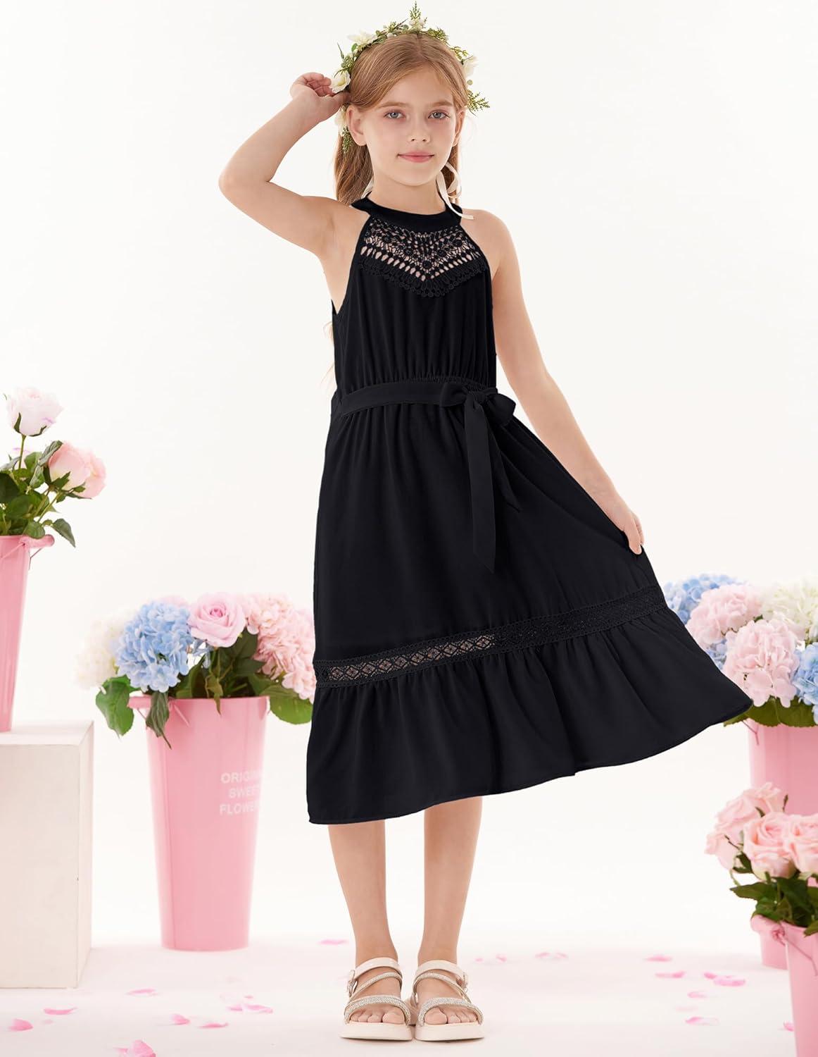 GRACE KARIN Girls Dresses Summer Spring Halter Maxi Dress Kids Ruffle Casual Flower Pleated Sun Dress Size 5-14(Black)