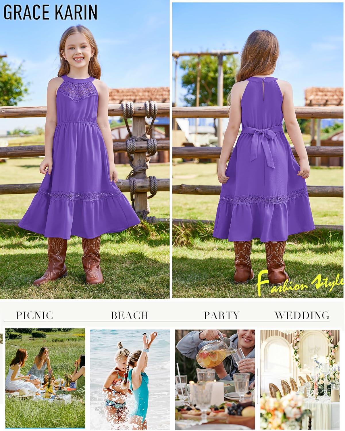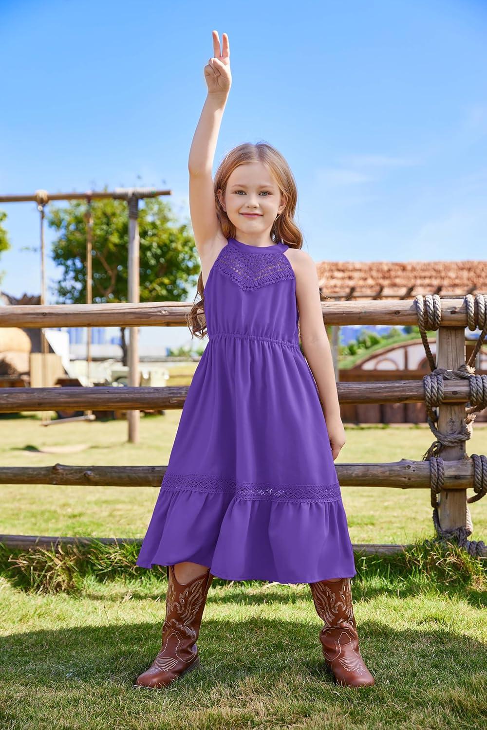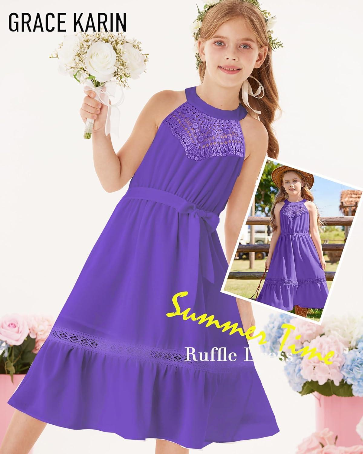 GRACE KARIN Girls Dresses Summer Spring Halter Maxi Dress Kids Ruffle Casual Flower Pleated Sun Dress Size 5-14(Blue Purple)