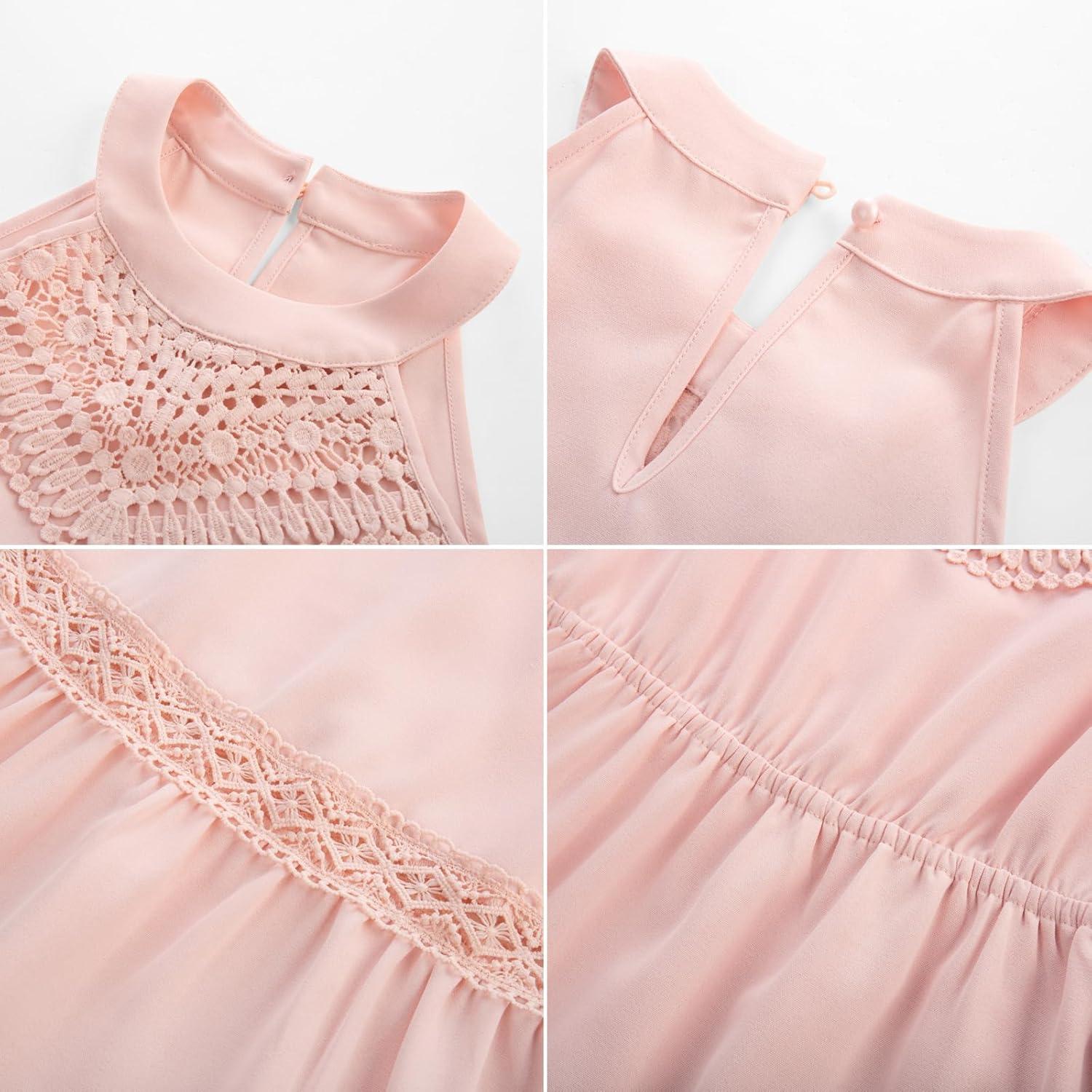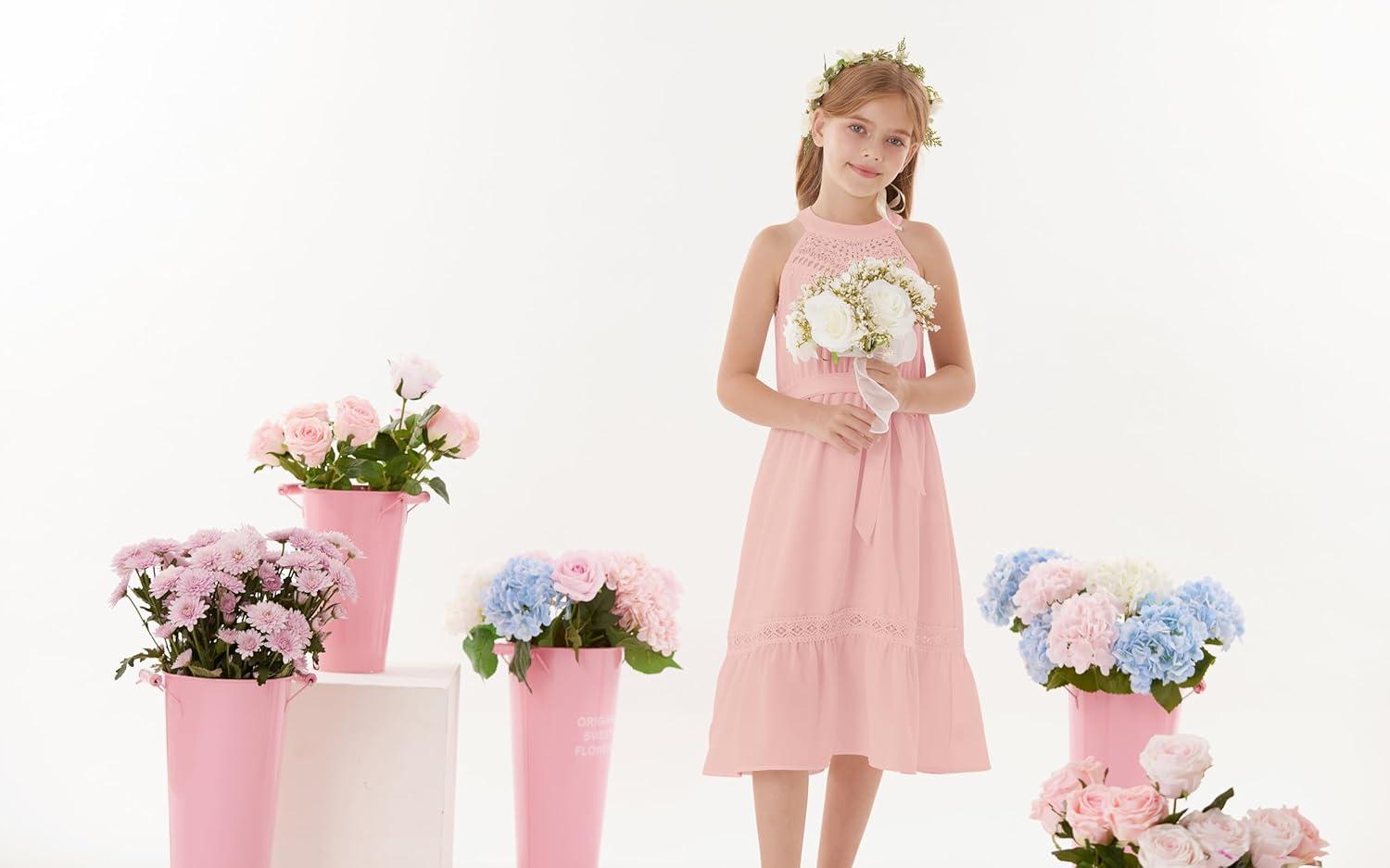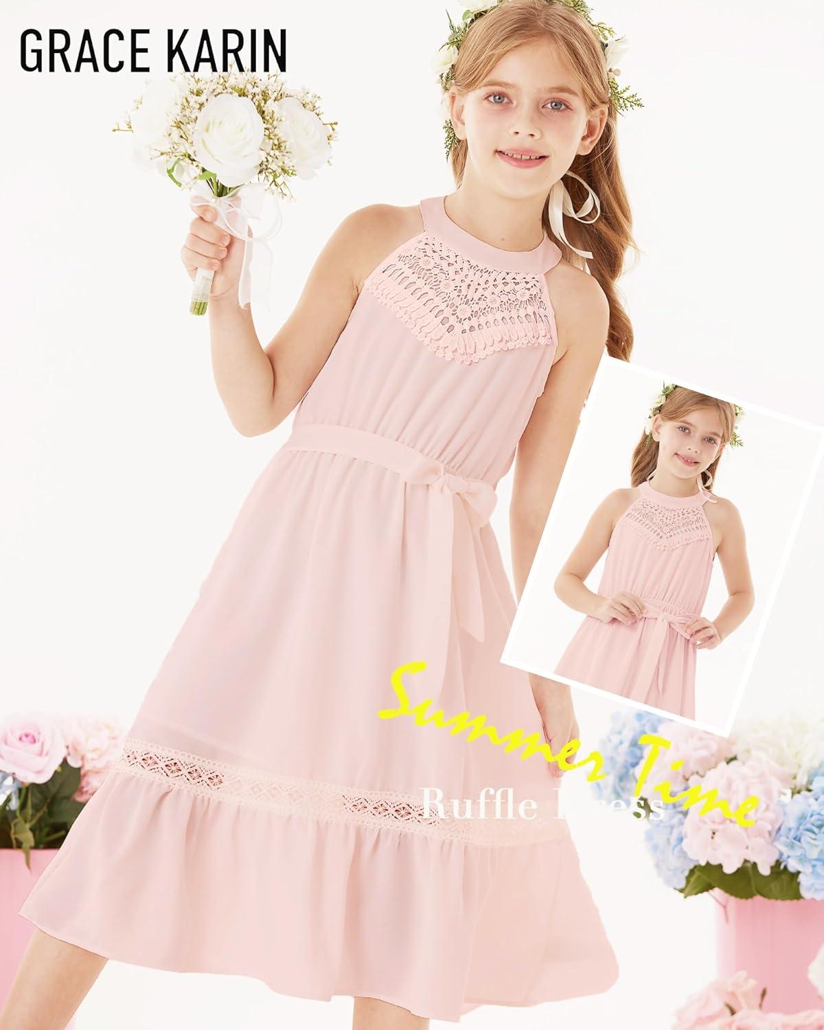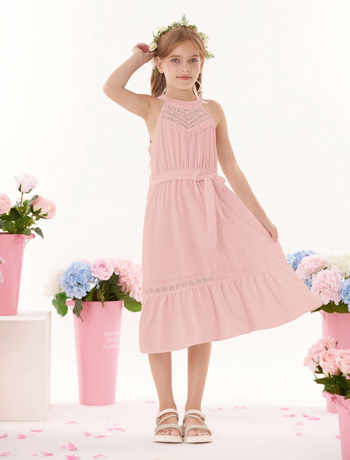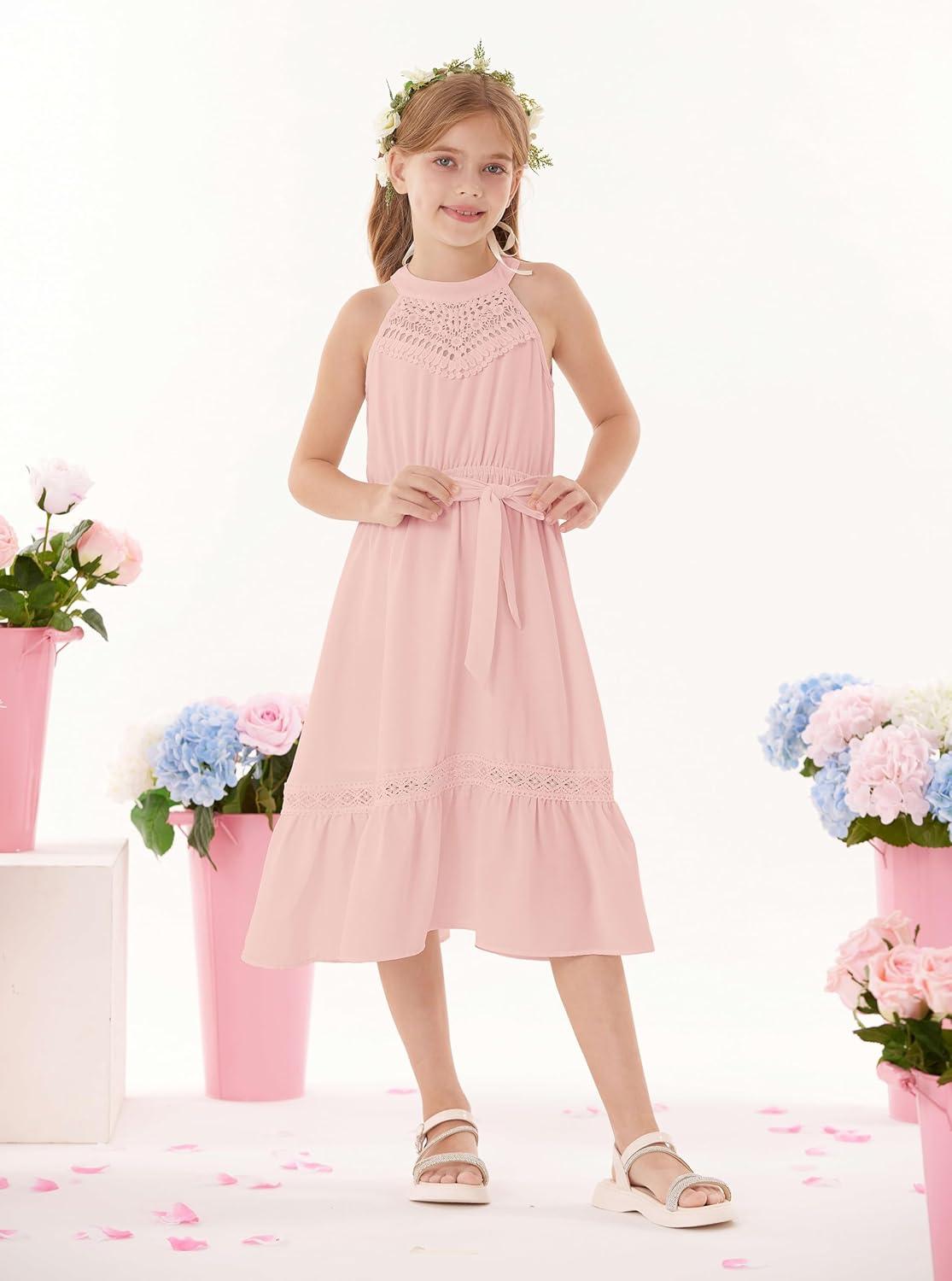 GRACE KARIN Girls Dresses Summer Spring Halter Maxi Dress Kids Ruffle Casual Flower Pleated Sun Dress Size 5-14(Light Pink)