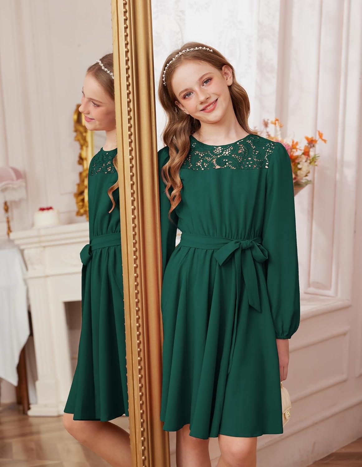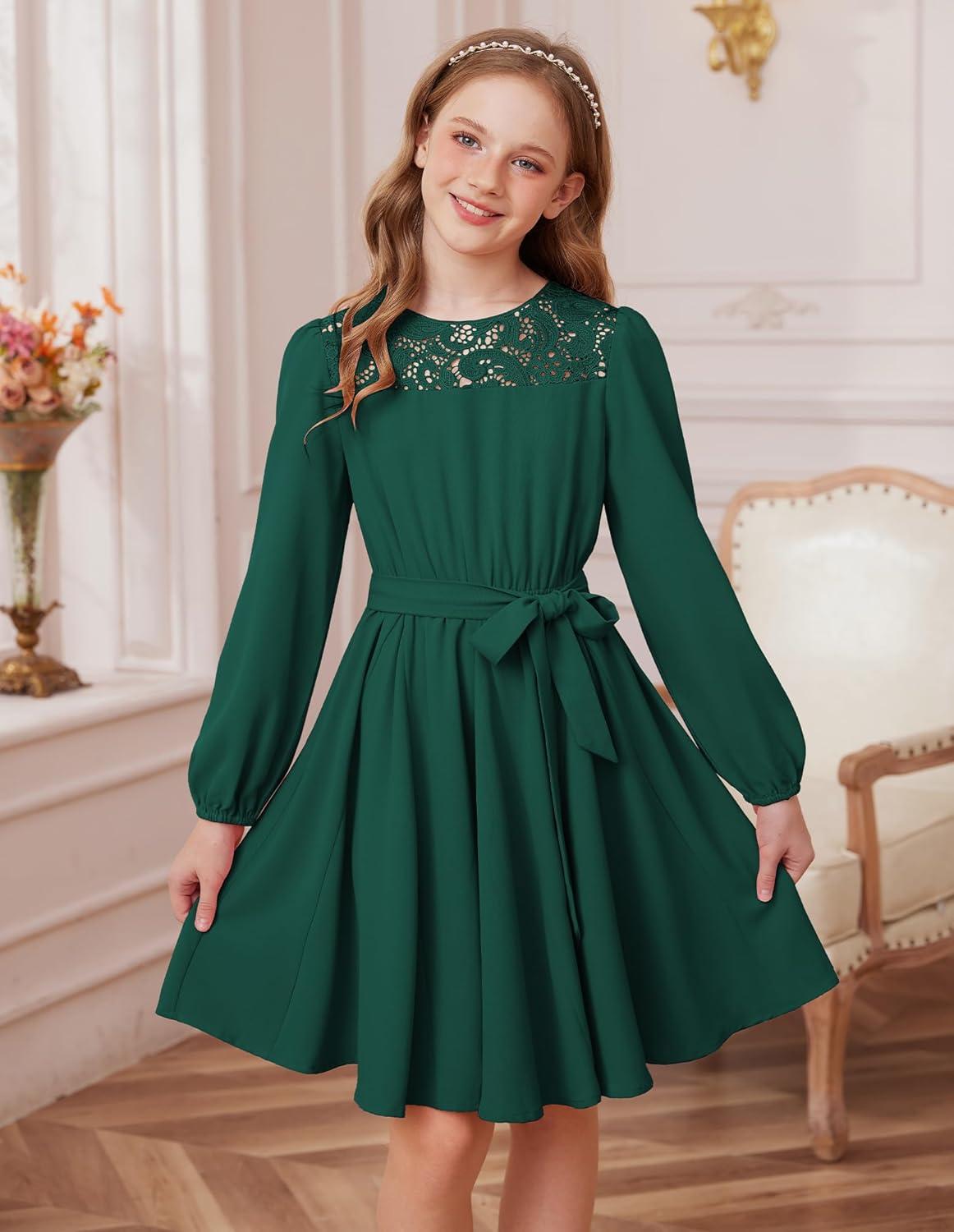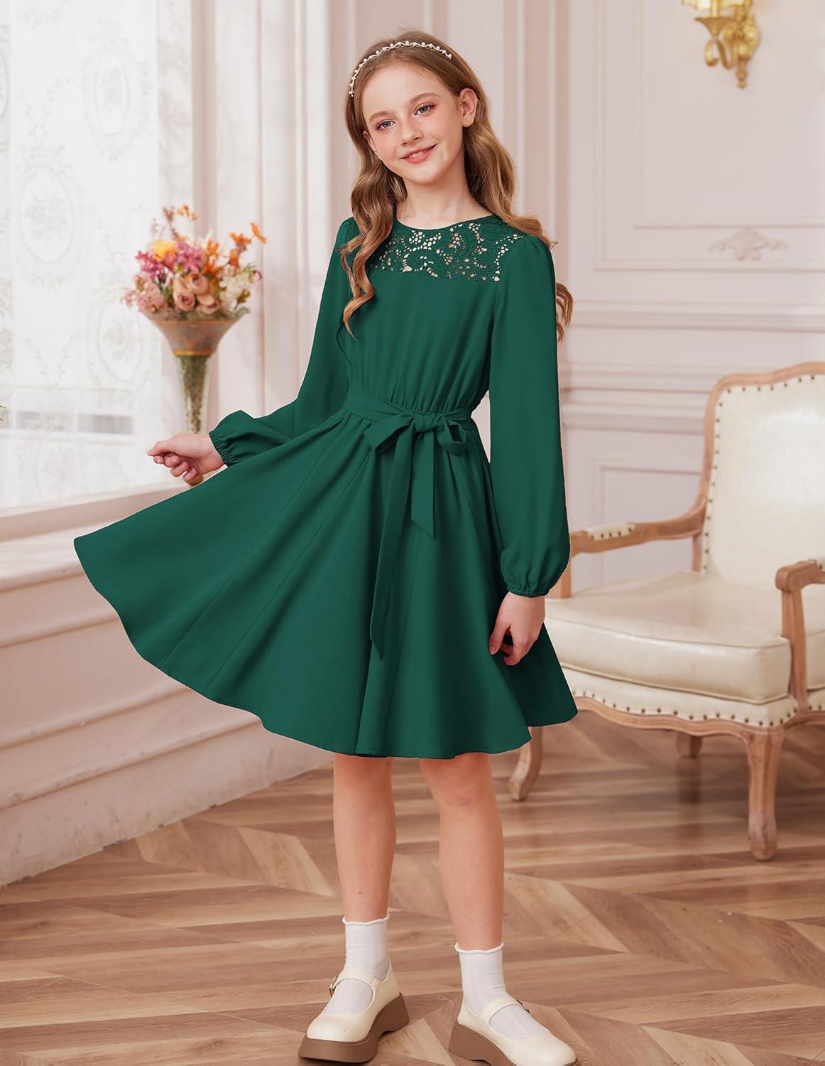 GRACE KARIN Girls Fall Dress Long Sleeve Midi with Lace Panels Twirl Skirt Elastic Waist for Holiday Party 6-14Y(Green)
