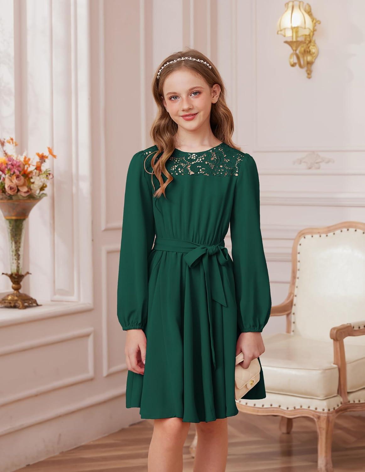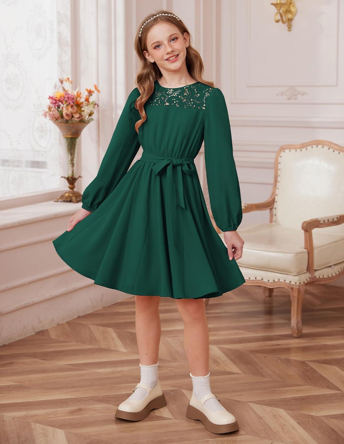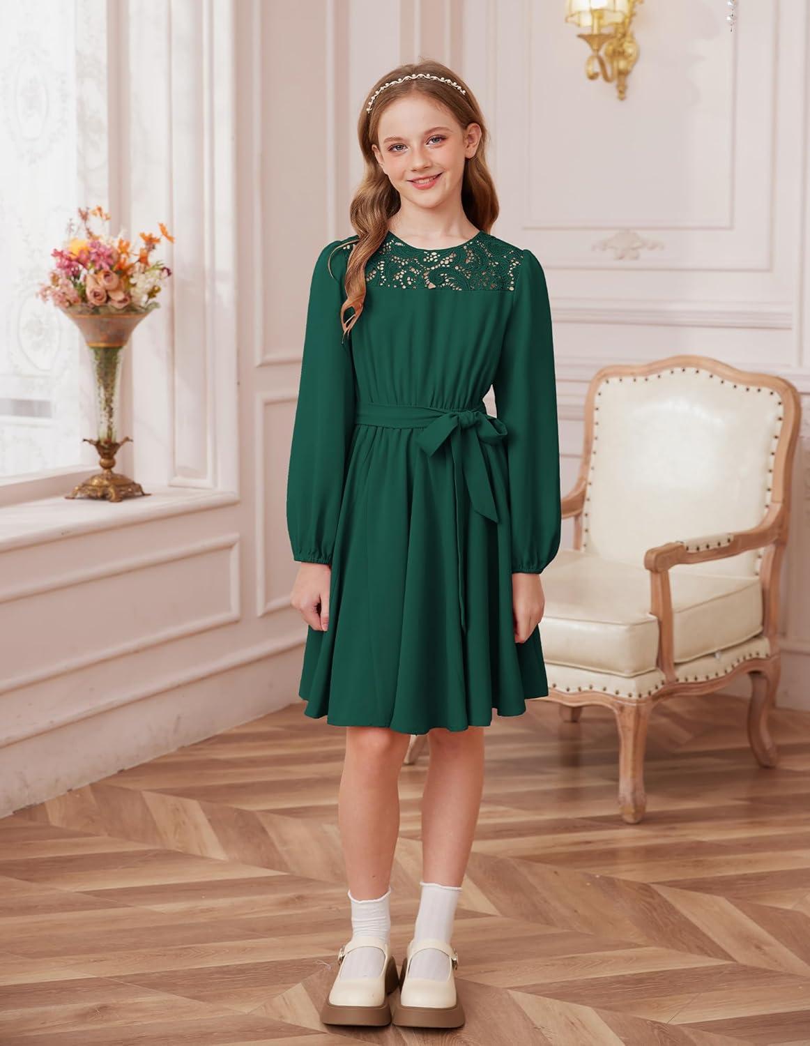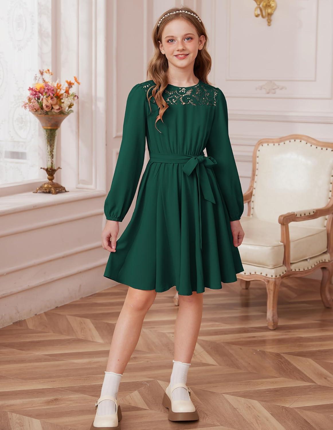 GRACE KARIN Girls Fall Dress Long Sleeve Midi with Lace Panels Twirl Skirt Elastic Waist for Holiday Party 6-14Y(Green)