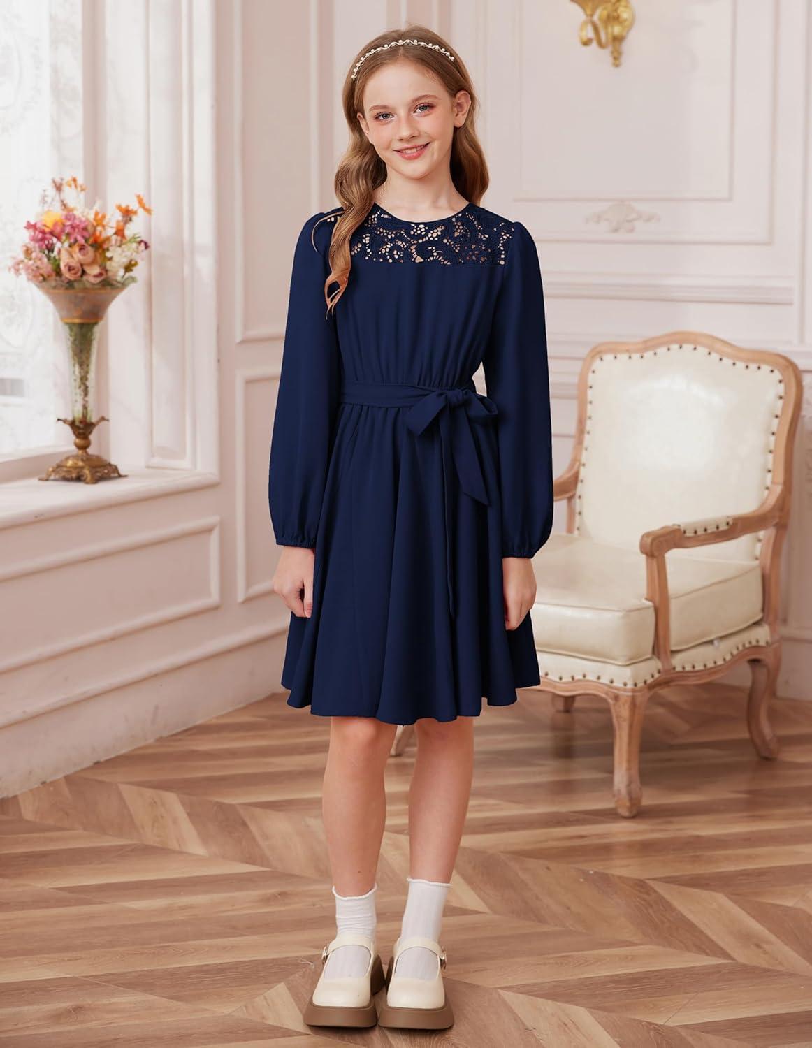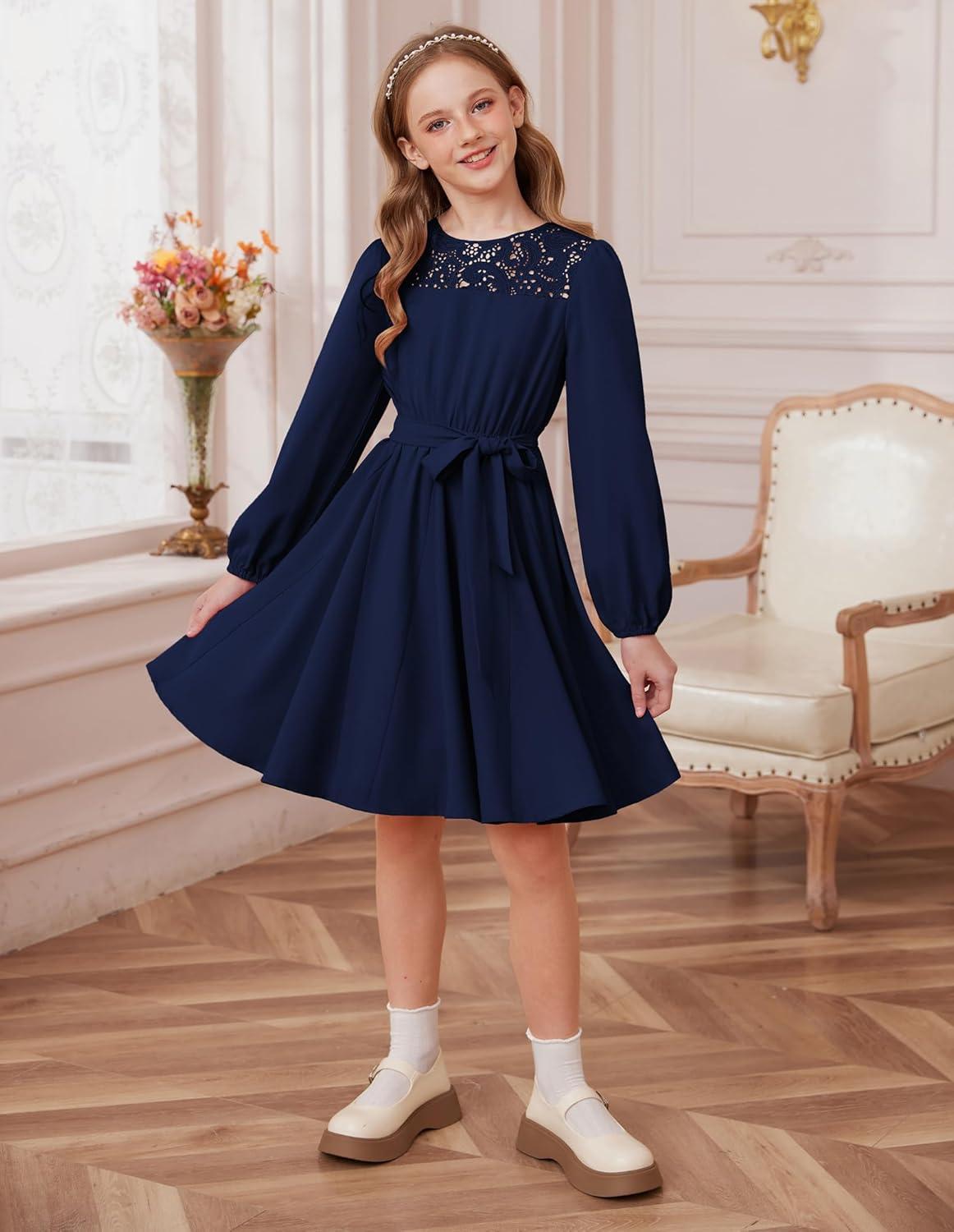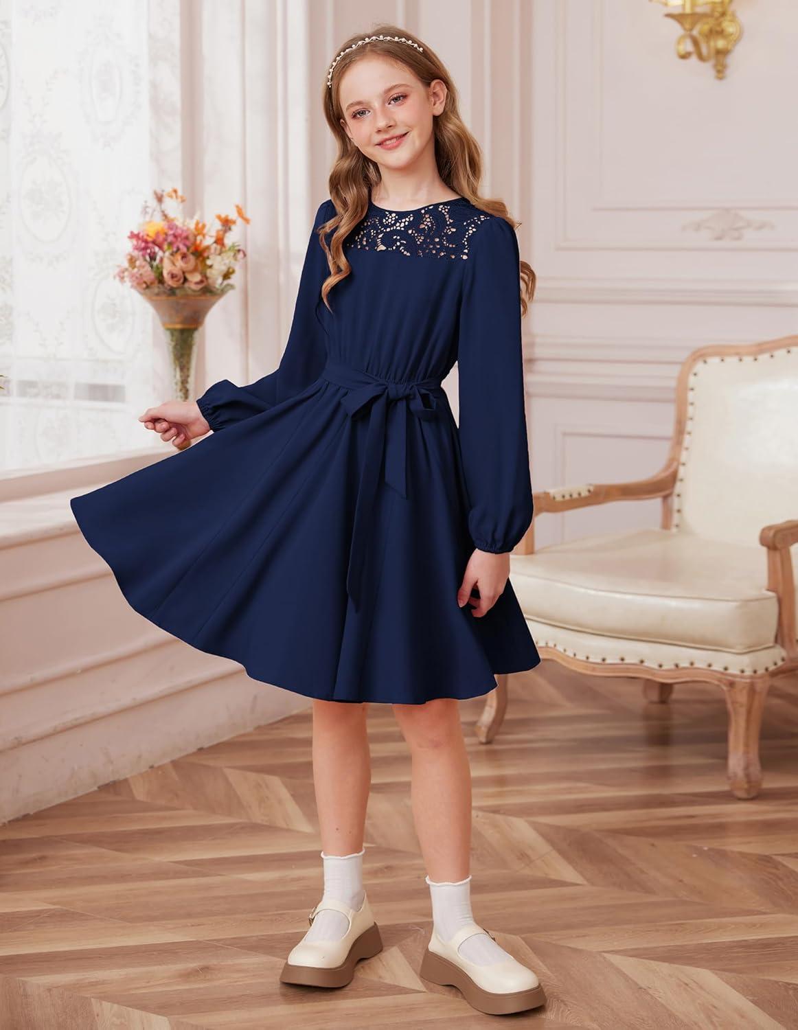GRACE KARIN Girls Fall Dress Long Sleeve Midi with Lace Panels Twirl Skirt Elastic Waist for Holiday Party 6-14Y(Navy Blue)