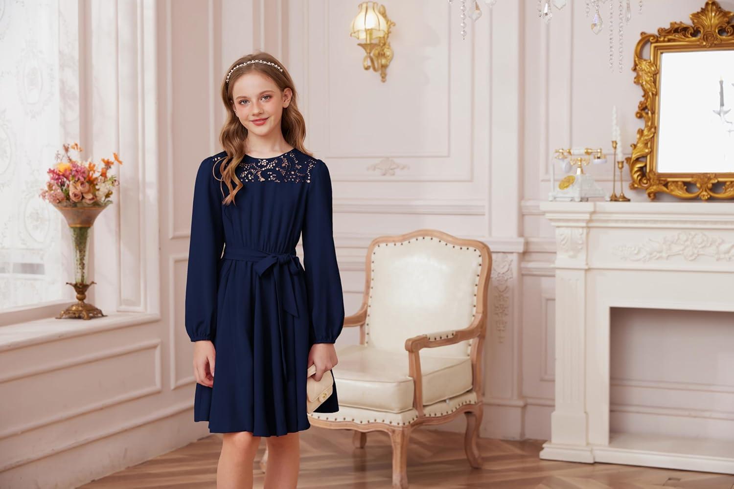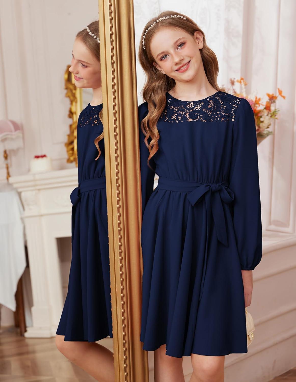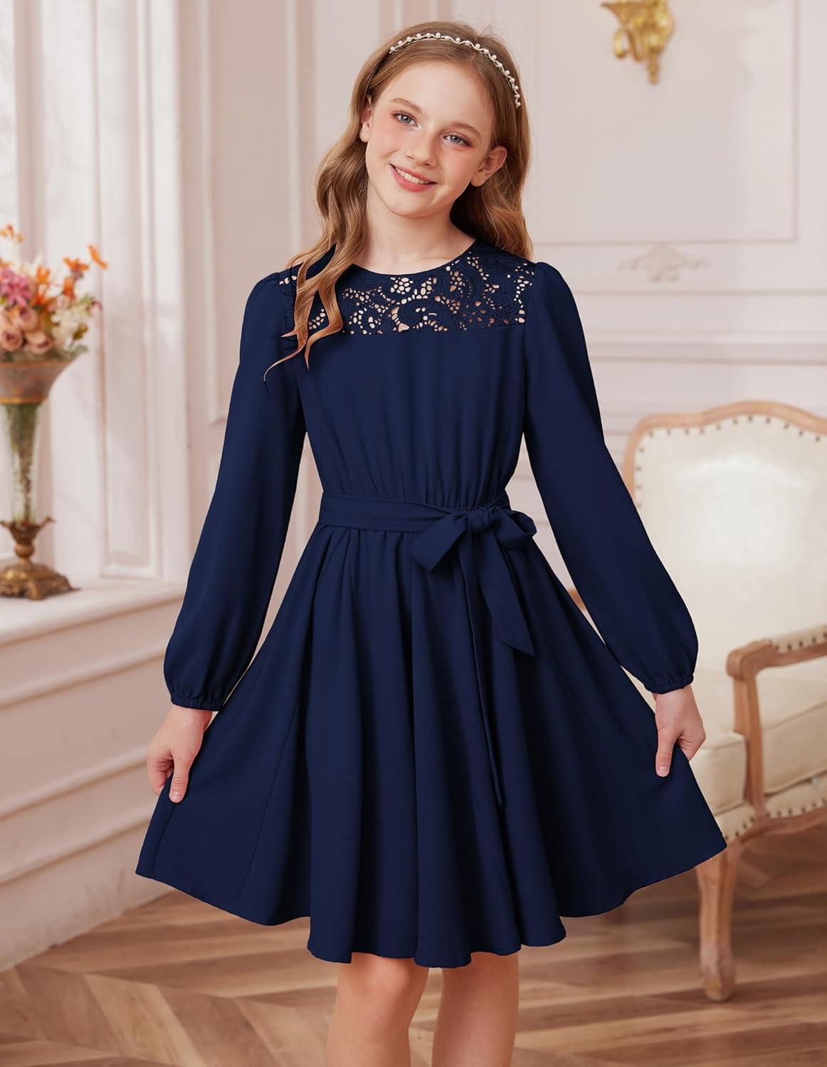 GRACE KARIN Girls Fall Dress Long Sleeve Midi with Lace Panels Twirl Skirt Elastic Waist for Holiday Party 6-14Y(Navy Blue)