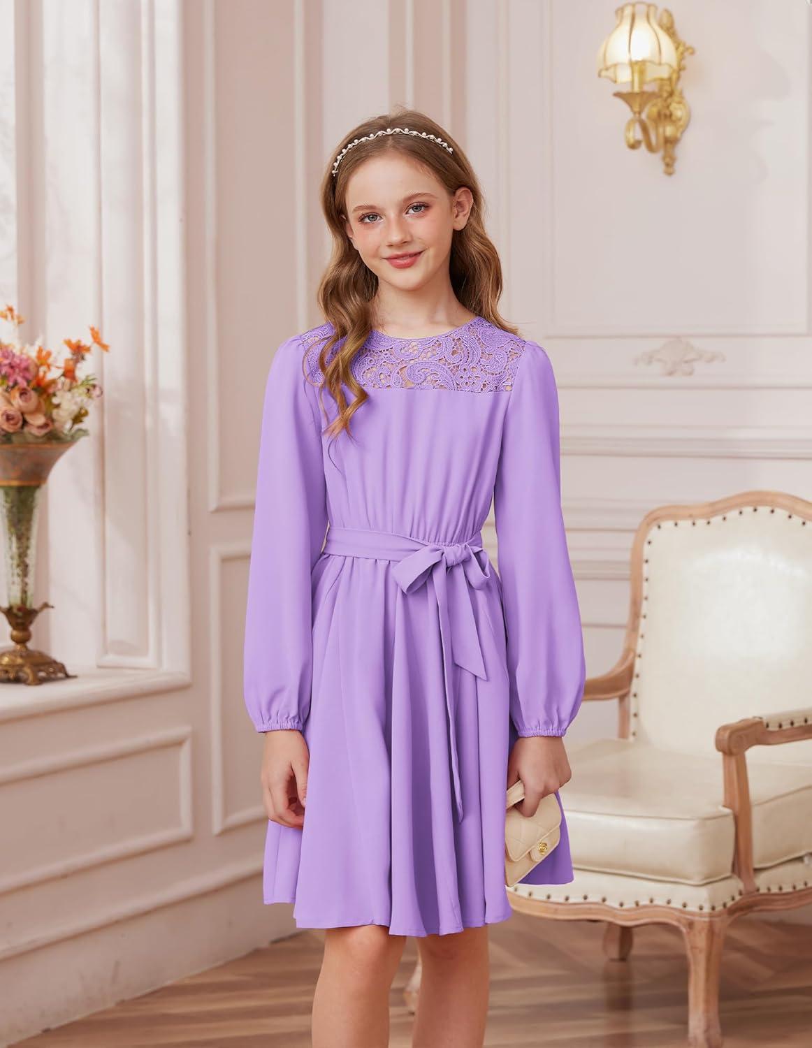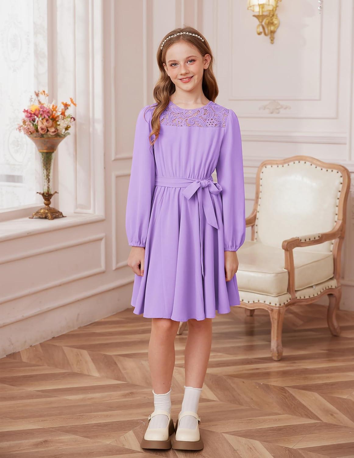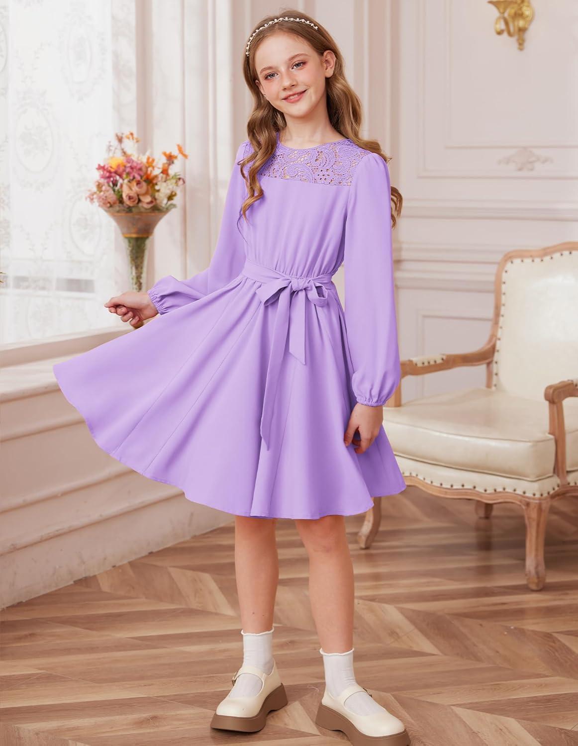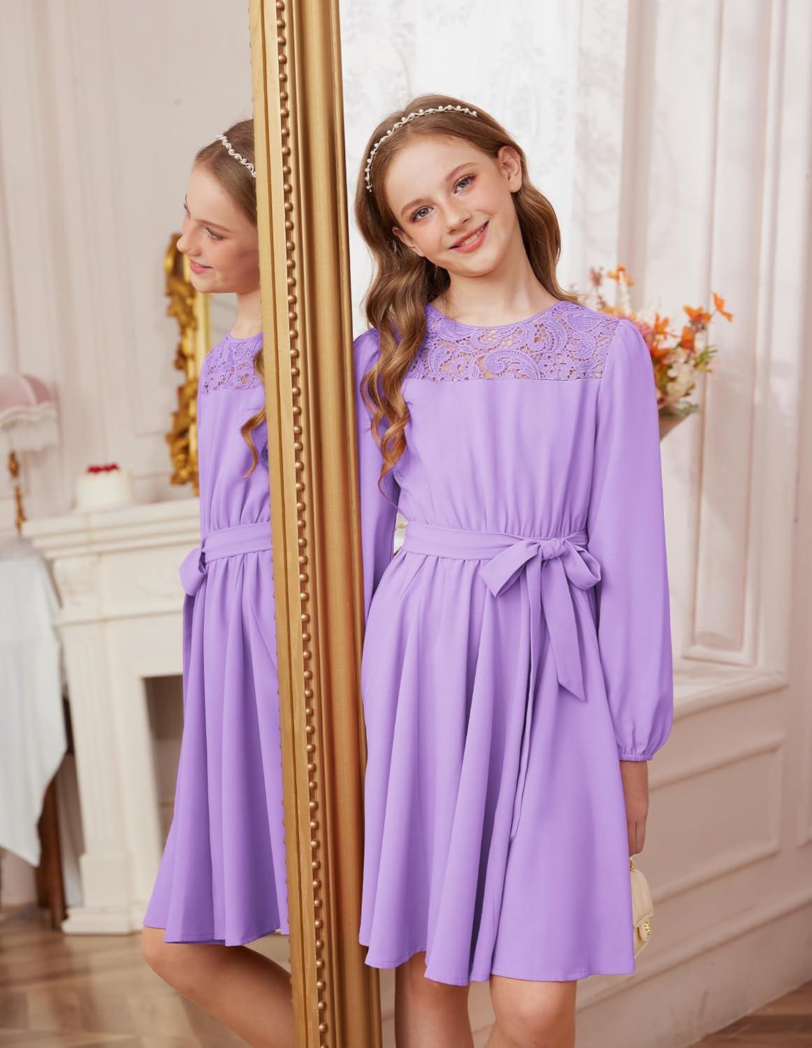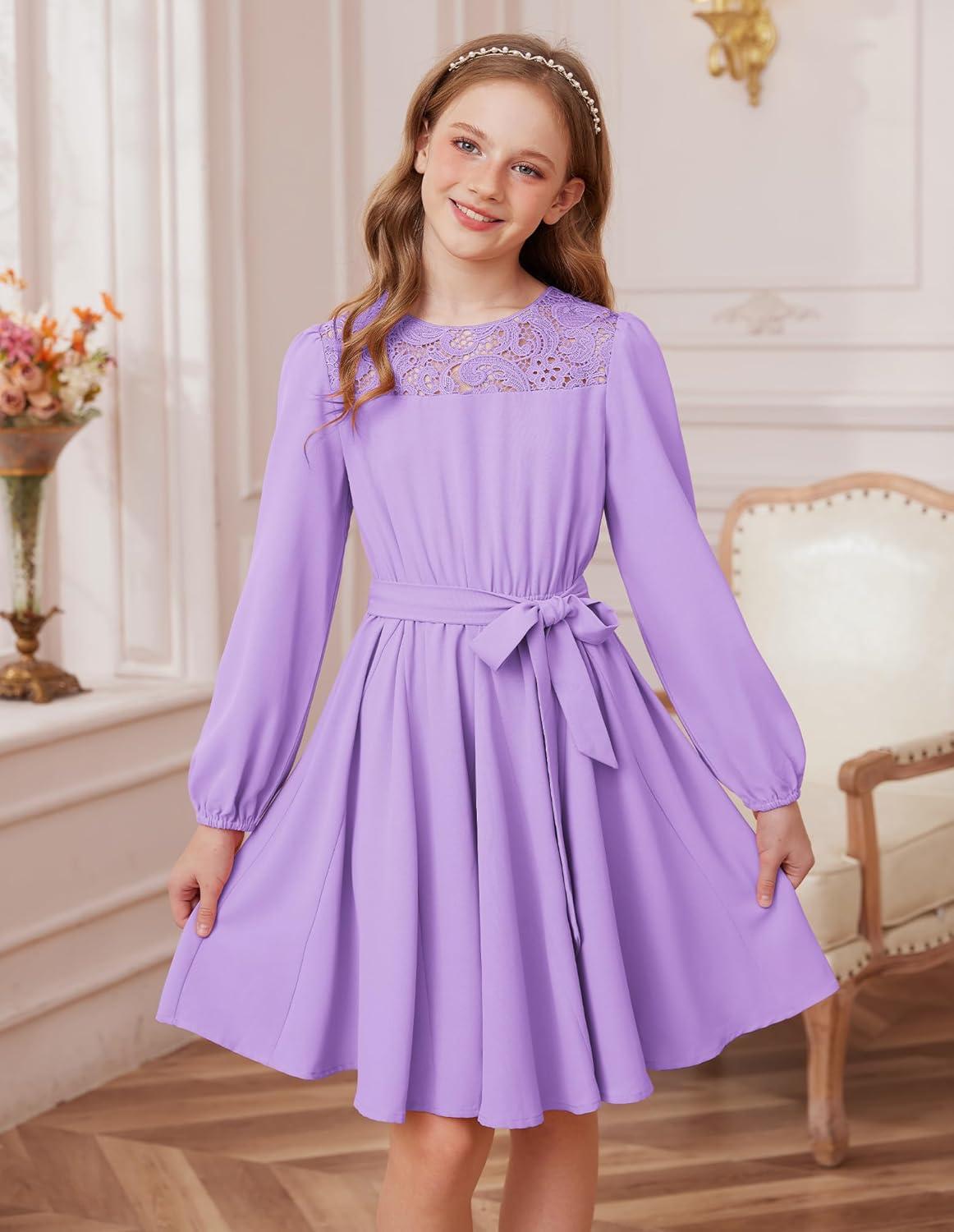 GRACE KARIN Girls Fall Dress Long Sleeve Midi with Lace Panels Twirl Skirt Elastic Waist for Holiday Party 6-14Y(Purple)