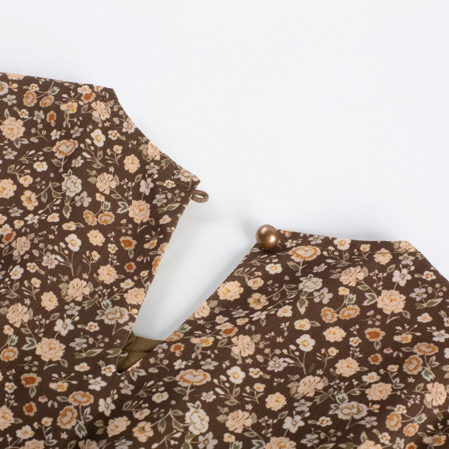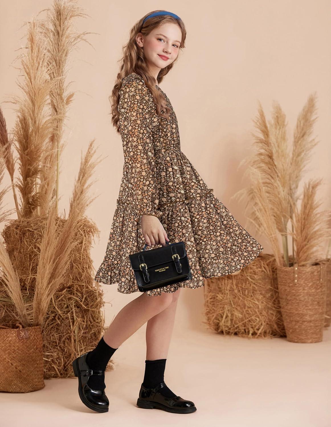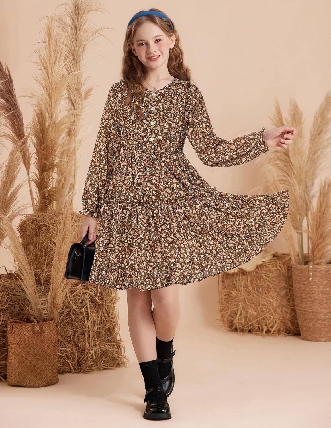 GRACE KARIN Girls Fall Floral Dresses 6-14Y Kids Winter Christmas Party Long Sleeve Holiday Hawaiian Flower Dress(Light Brown Floral)