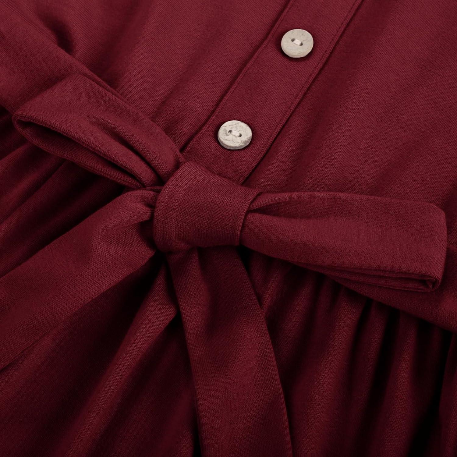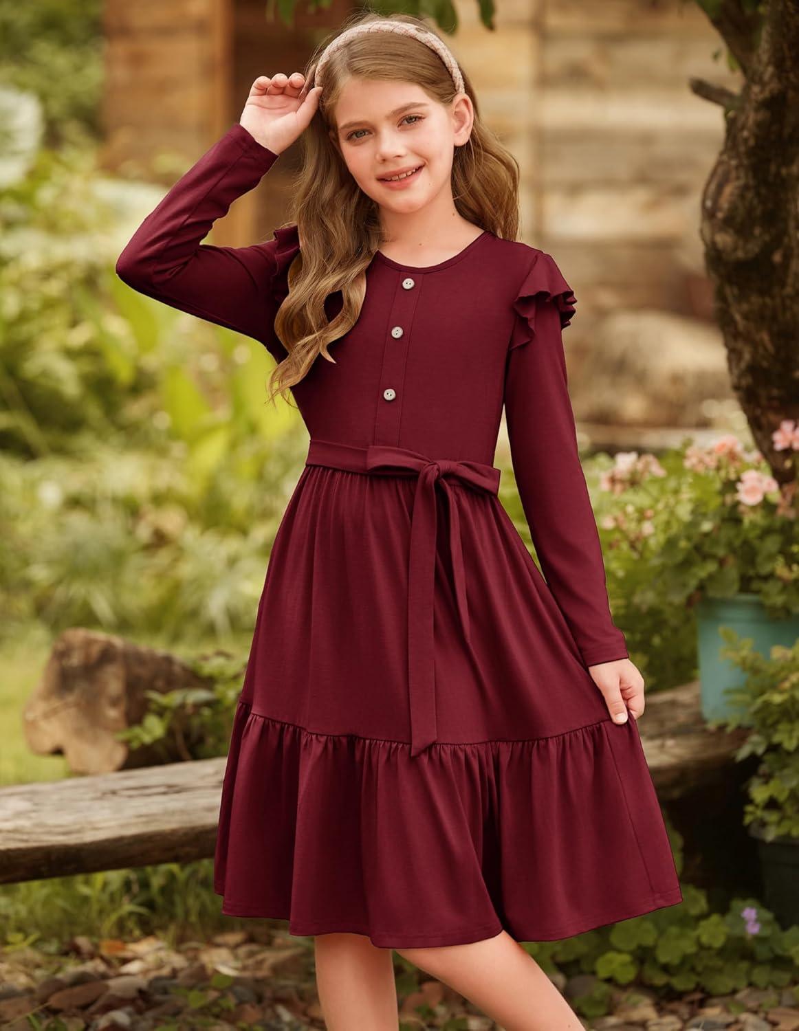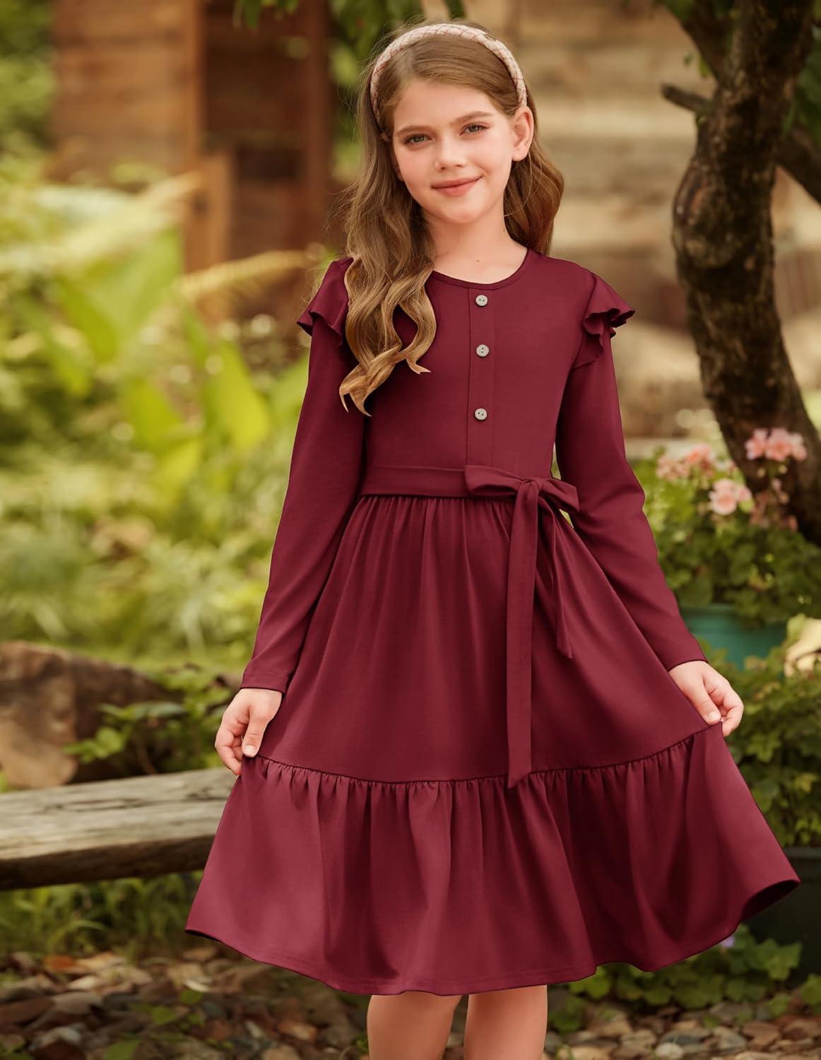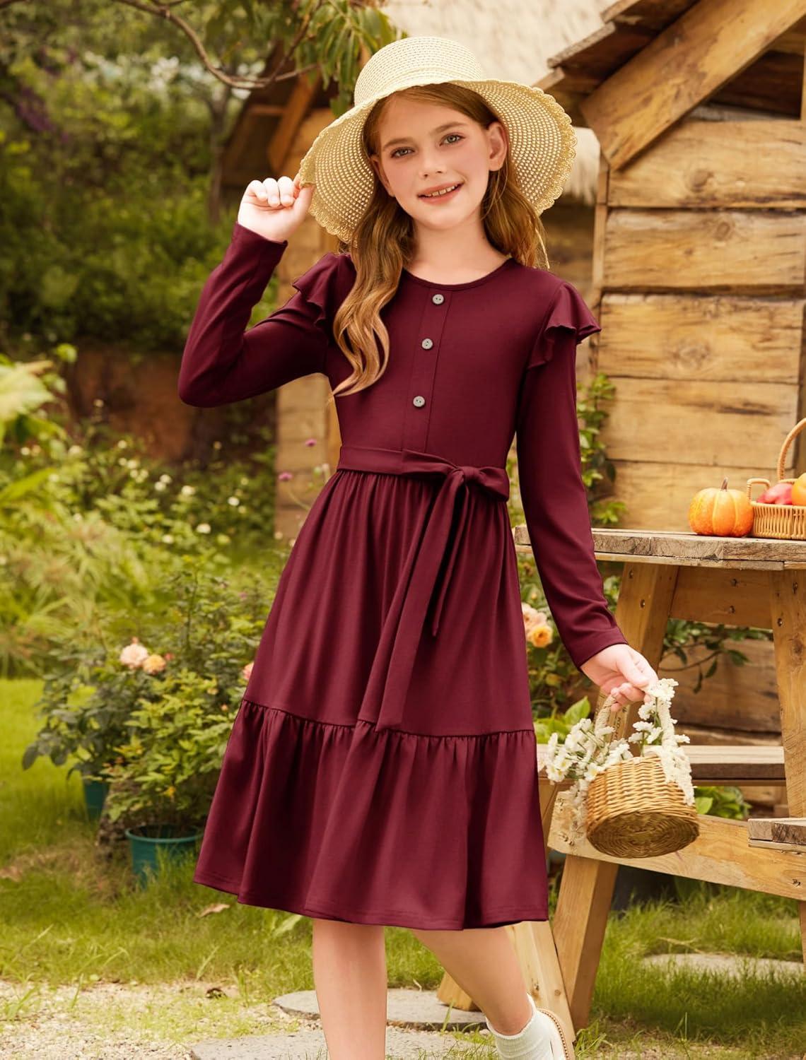 GRACE KARIN Girls Fall Long Sleeve Dress for Girl Rullfe Button Casual Flowy Tiered Dresses with Pocket 6-14Years(Wine Red)