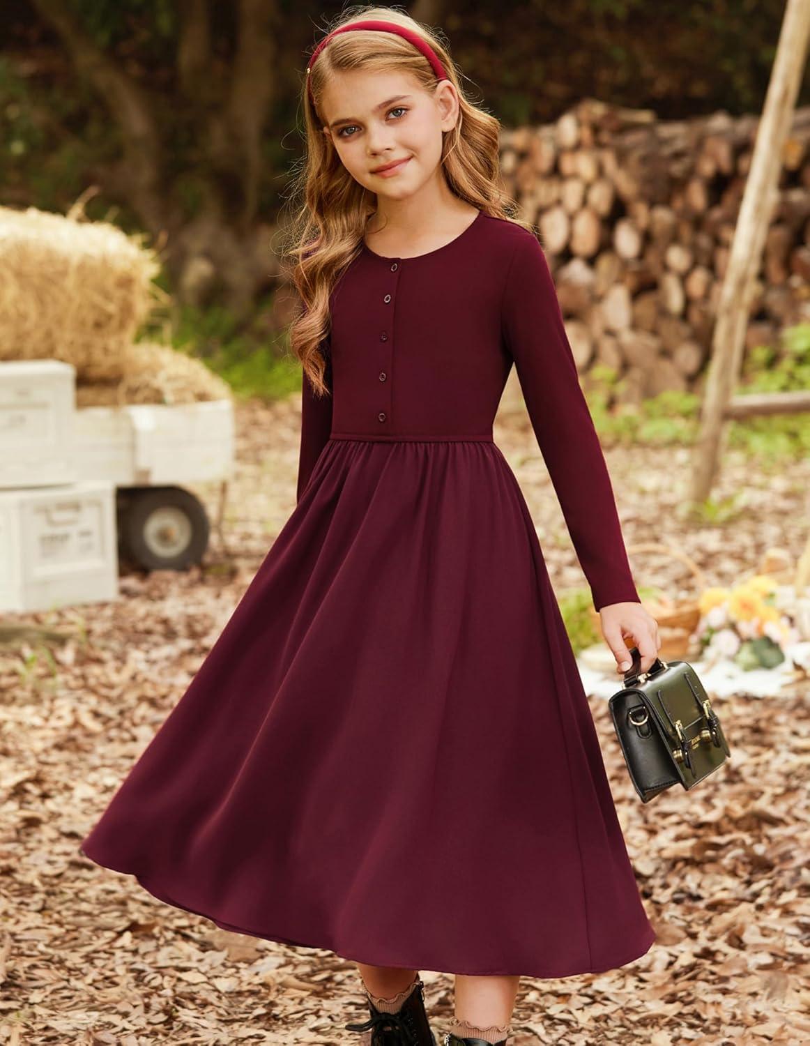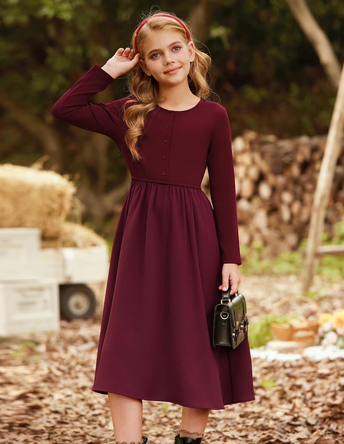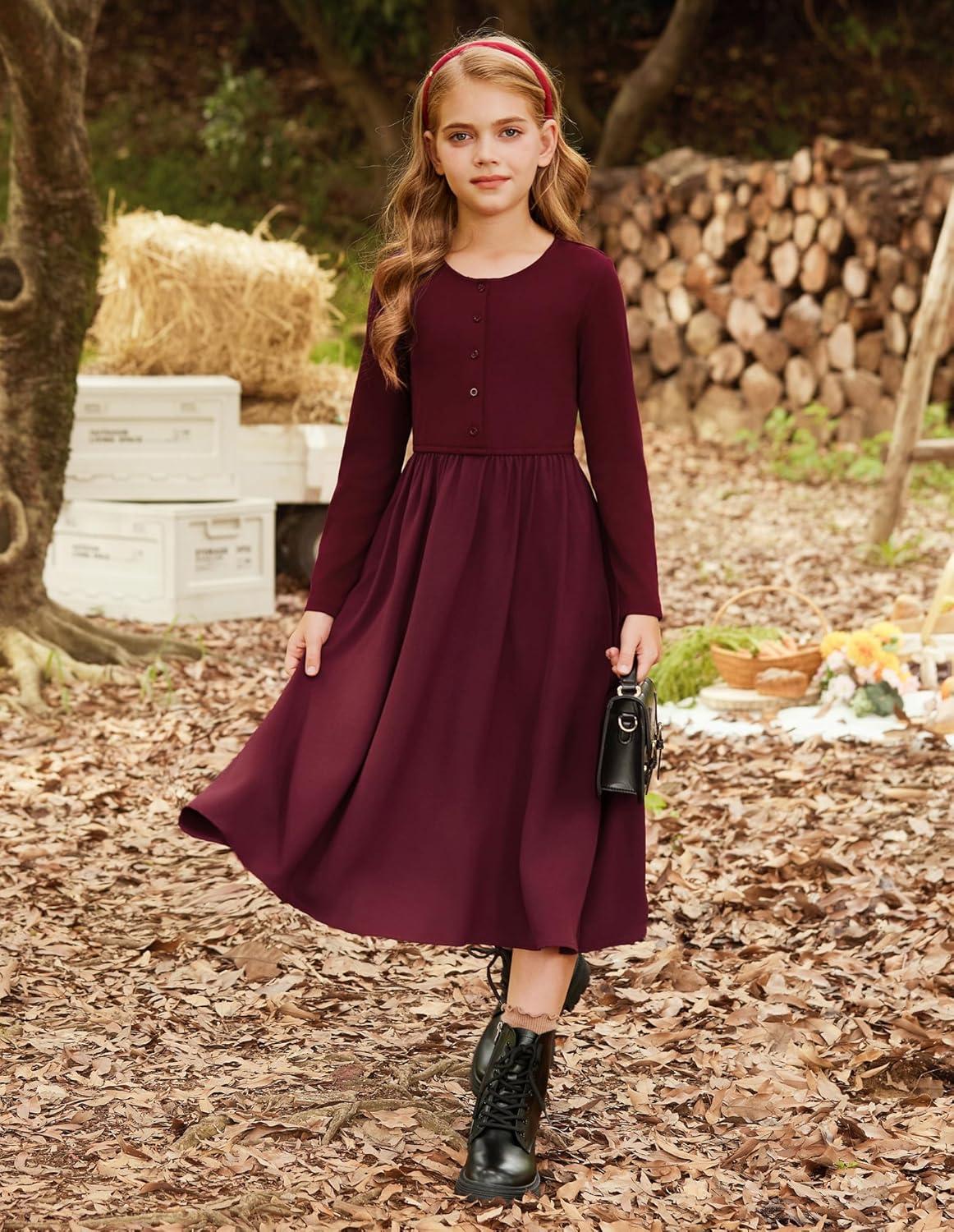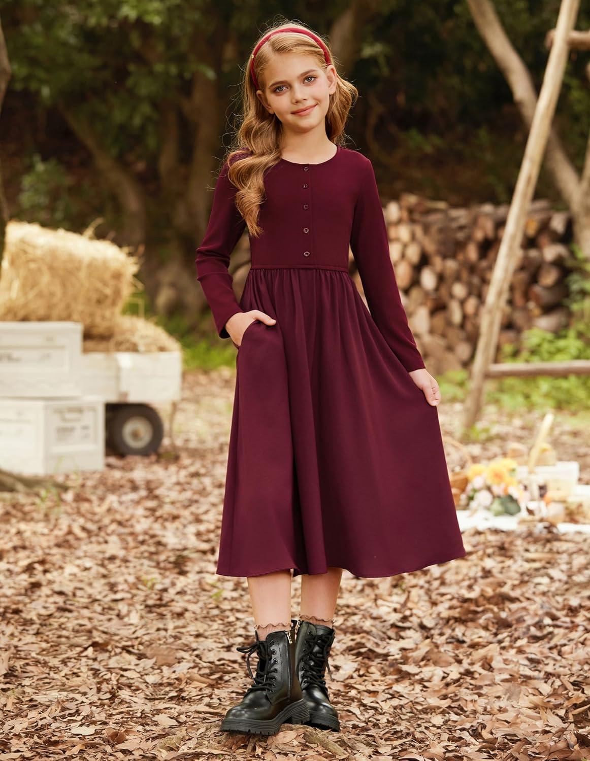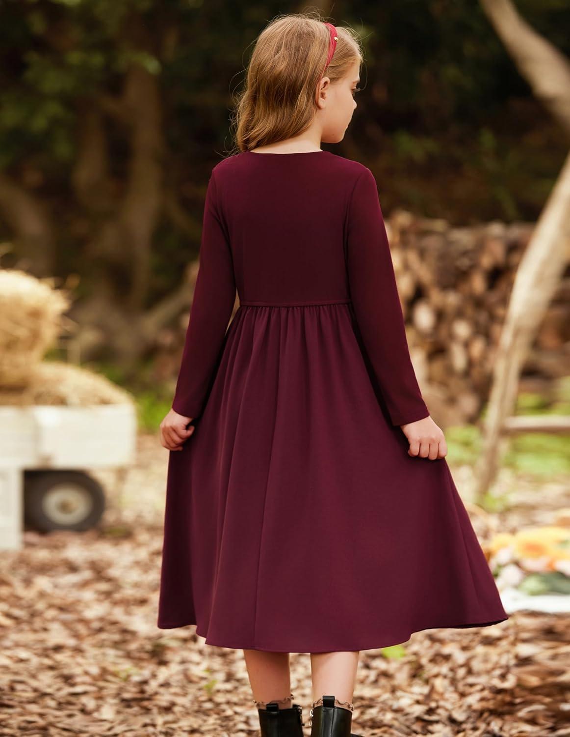GRACE KARIN Girls Fall Long Sleeve Dresses Girl Casual Maxi Dress with Pockets Kids Formal Party Dress Size 6-14(Burgundy)