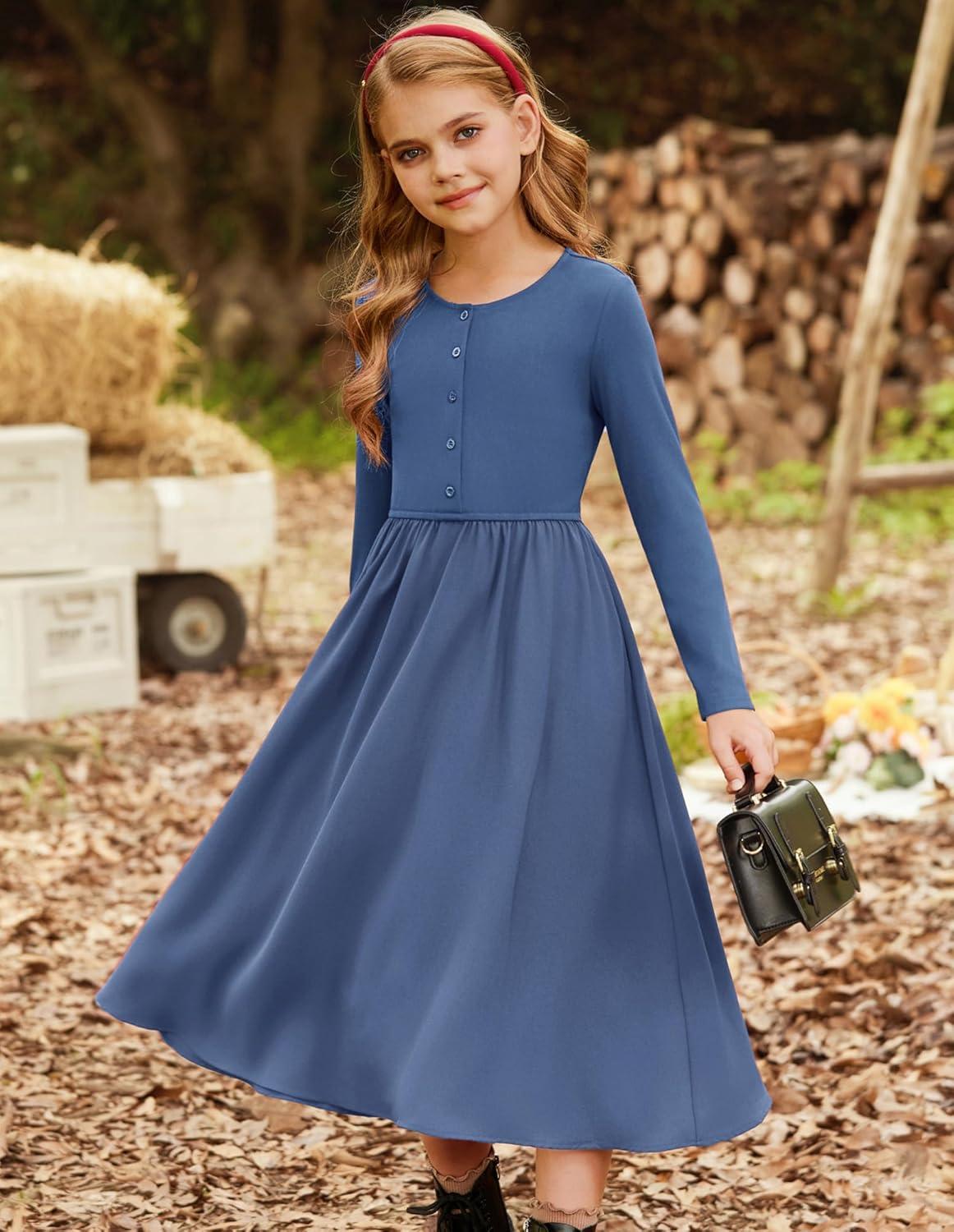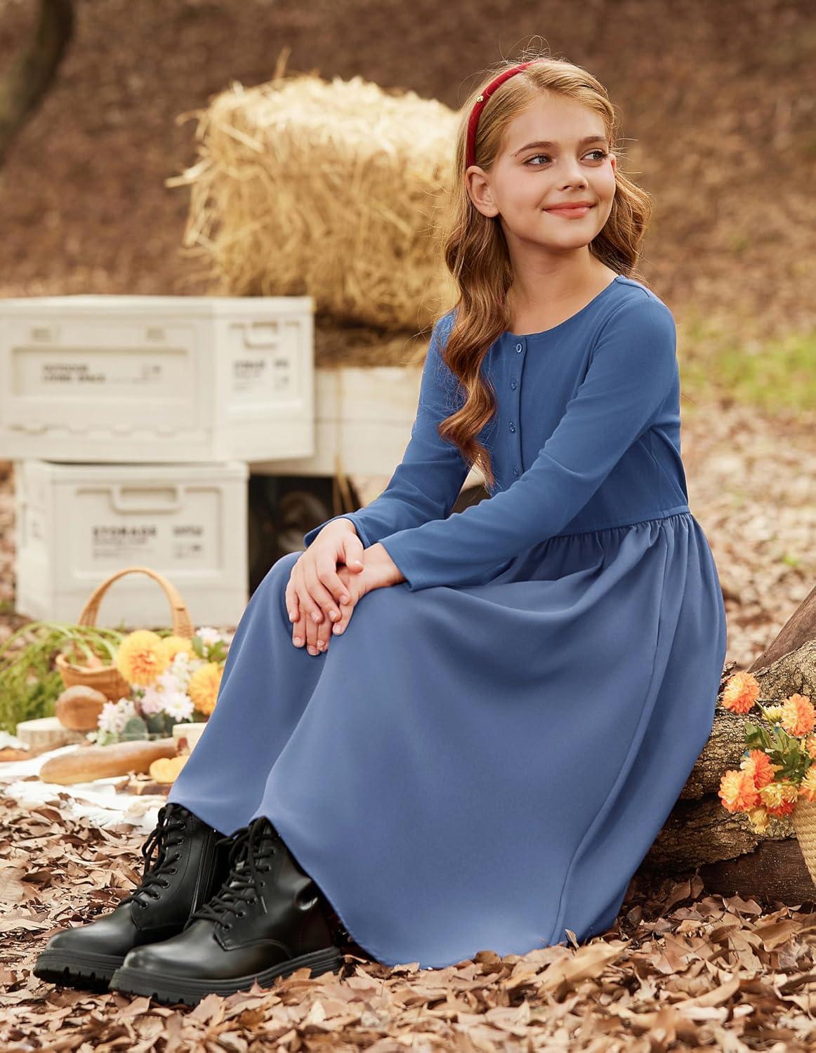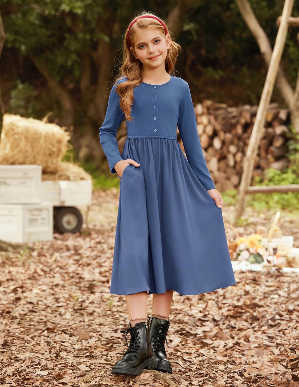 GRACE KARIN Girls Fall Long Sleeve Dresses Girl Casual Maxi Dress with Pockets Kids Formal Party Dress Size 6-14(Navy Blue)