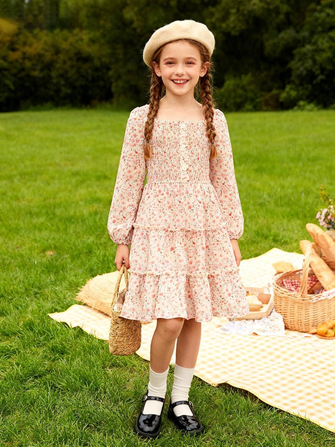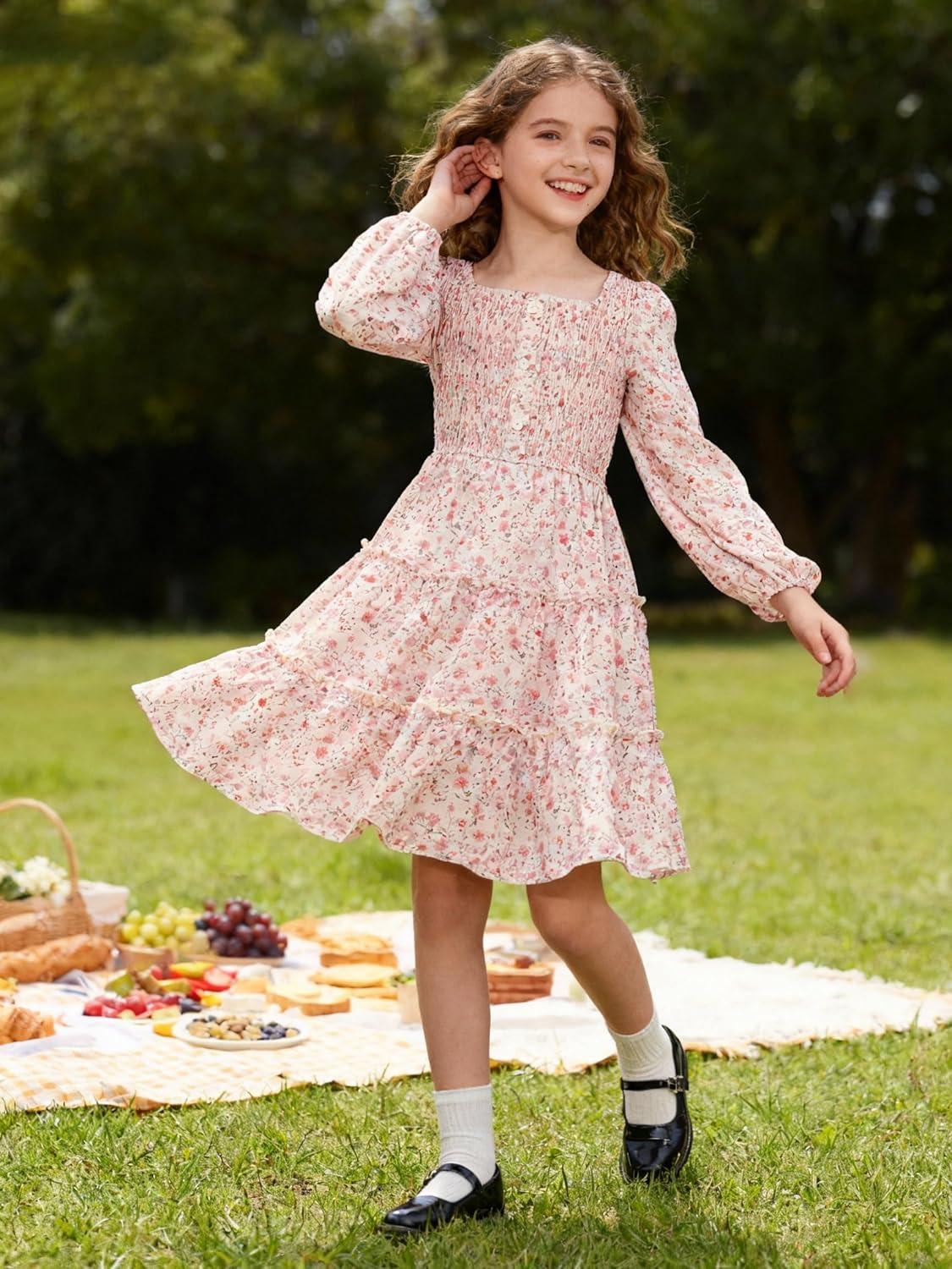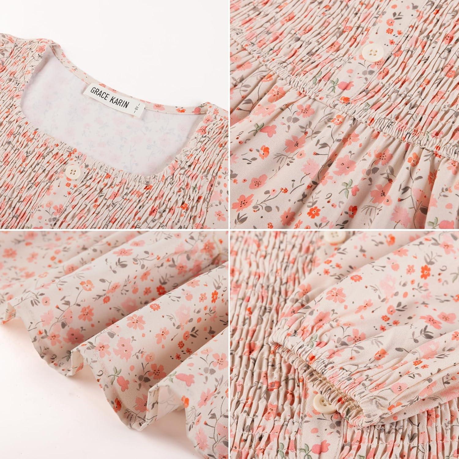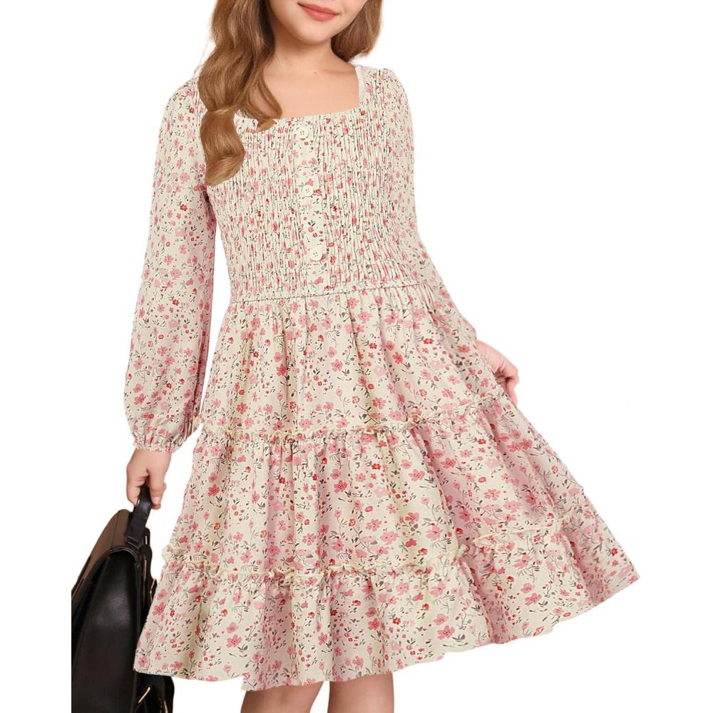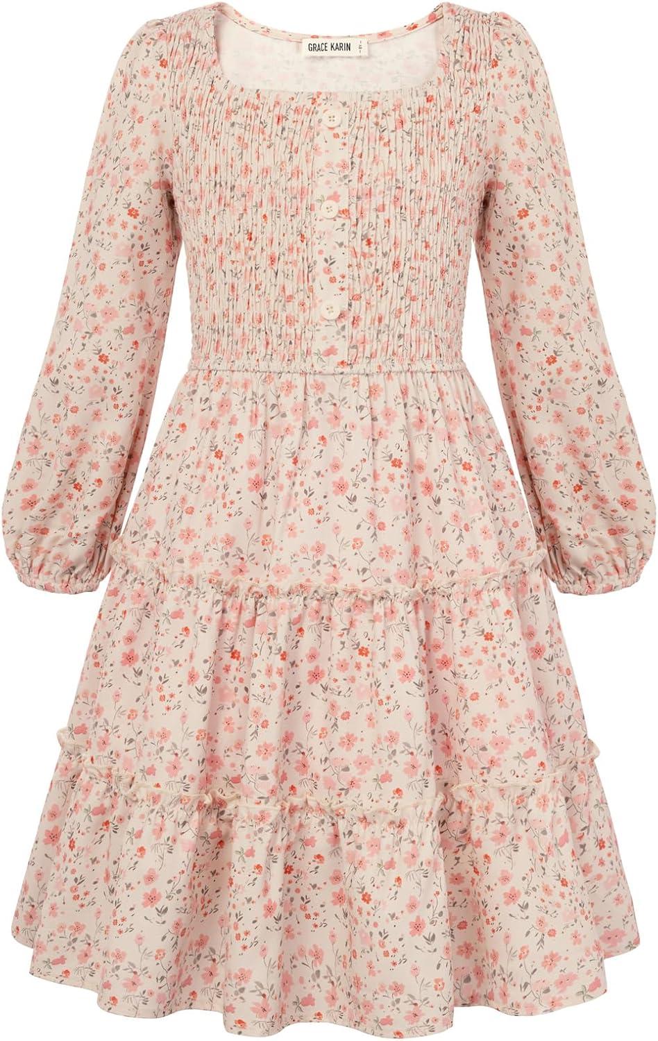GRACE KARIN Girls Fall Long Sleeve Floral Square Neck Smock Tiered Casual Holiday Teen Dress Size 5-14(Apricot Pink Floral)