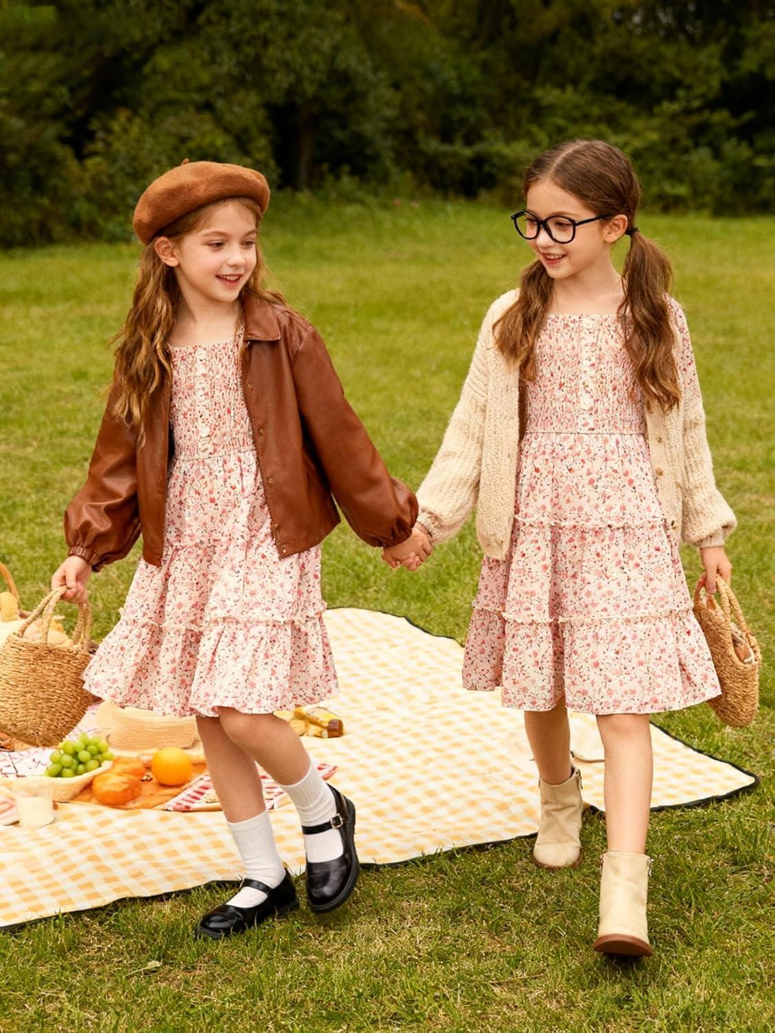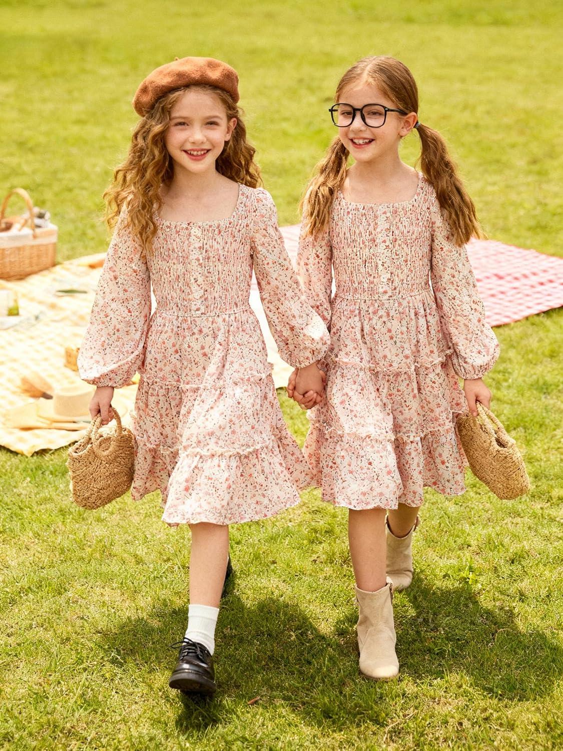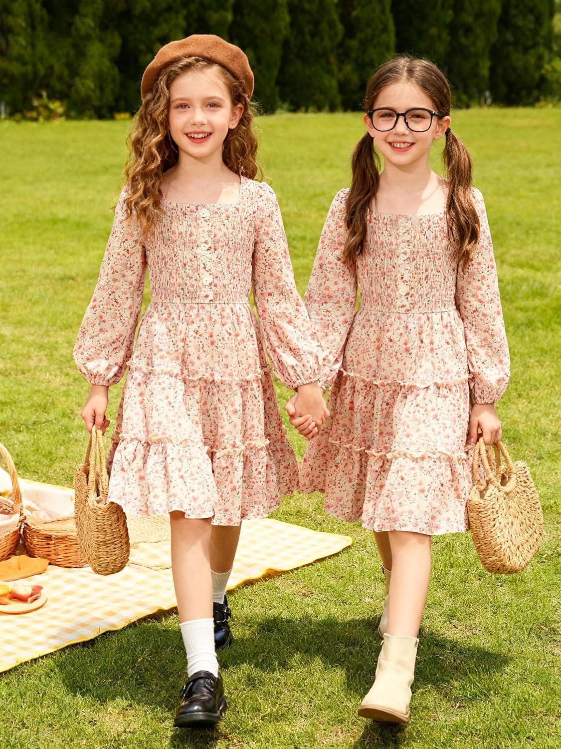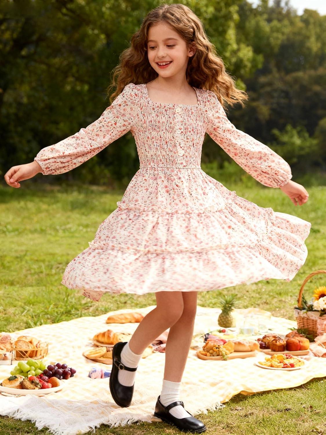 GRACE KARIN Girls Fall Long Sleeve Floral Square Neck Smock Tiered Casual Holiday Teen Dress Size 5-14(Apricot Pink Floral)