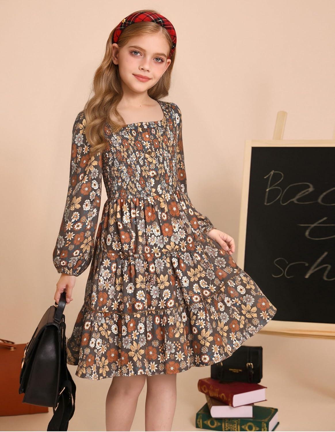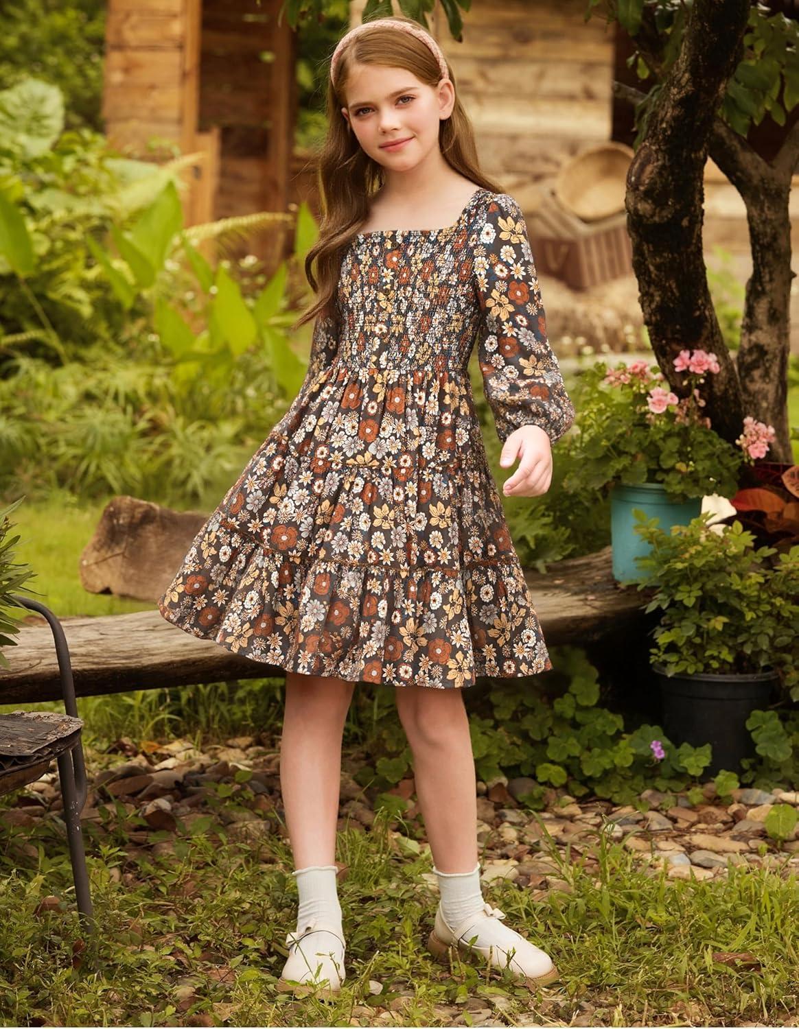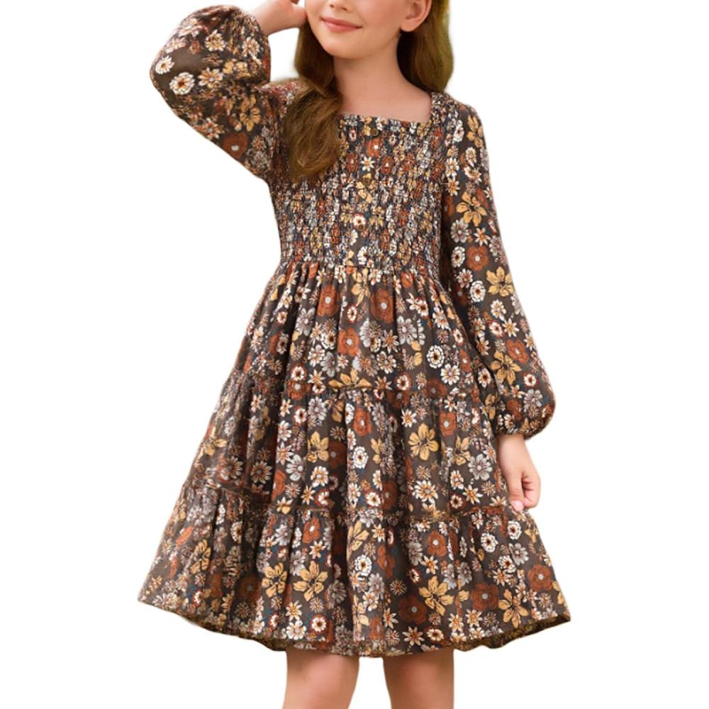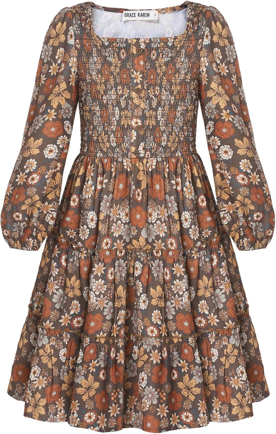 GRACE KARIN Girls Fall Long Sleeve Floral Square Neck Smock Tiered Casual Holiday Teen Dress Size 5-14(Brown Floral)