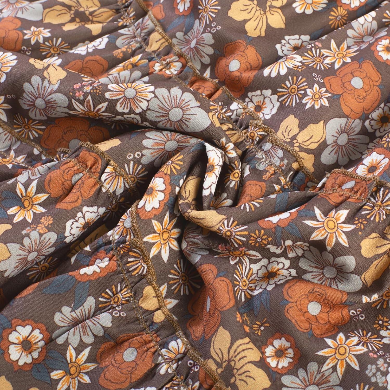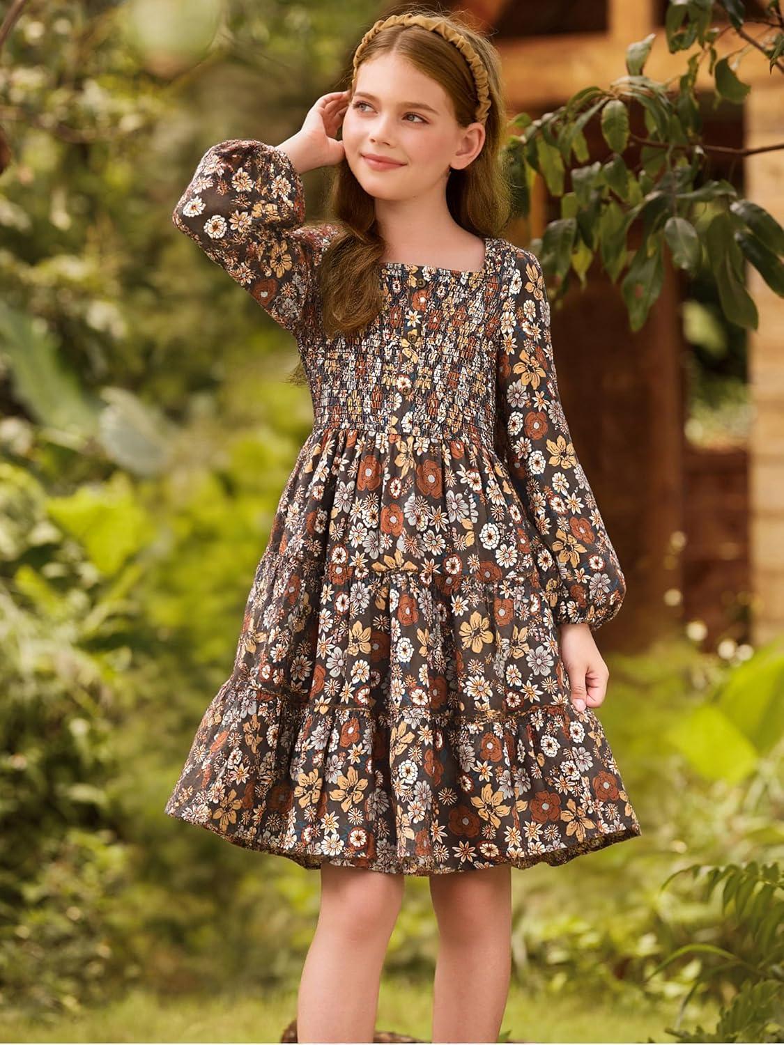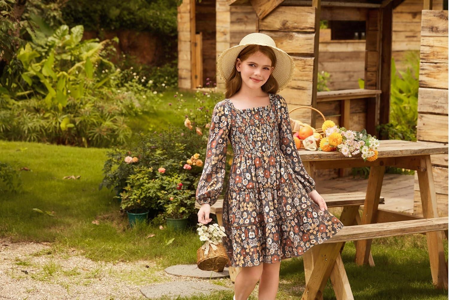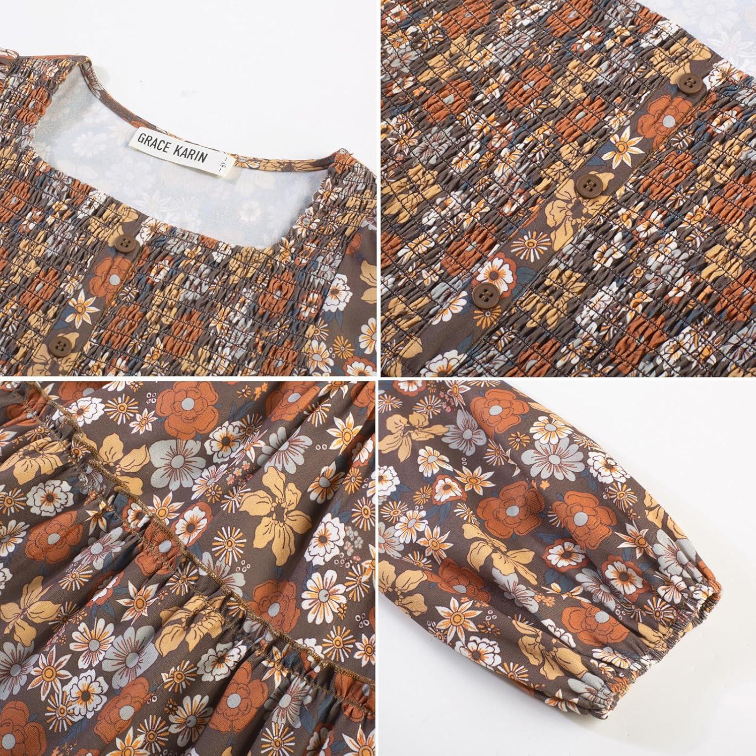 GRACE KARIN Girls Fall Long Sleeve Floral Square Neck Smock Tiered Casual Holiday Teen Dress Size 5-14(Brown Floral)