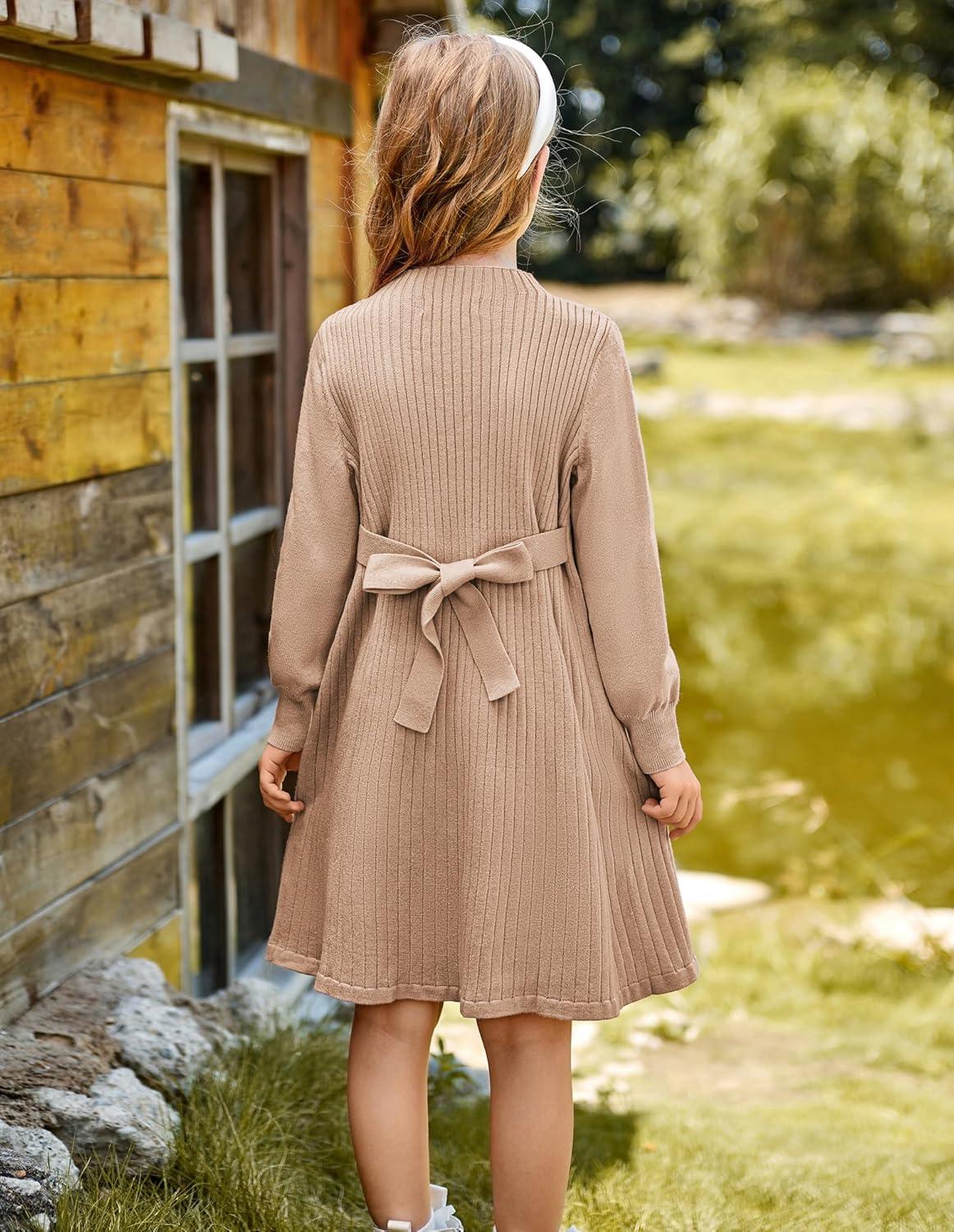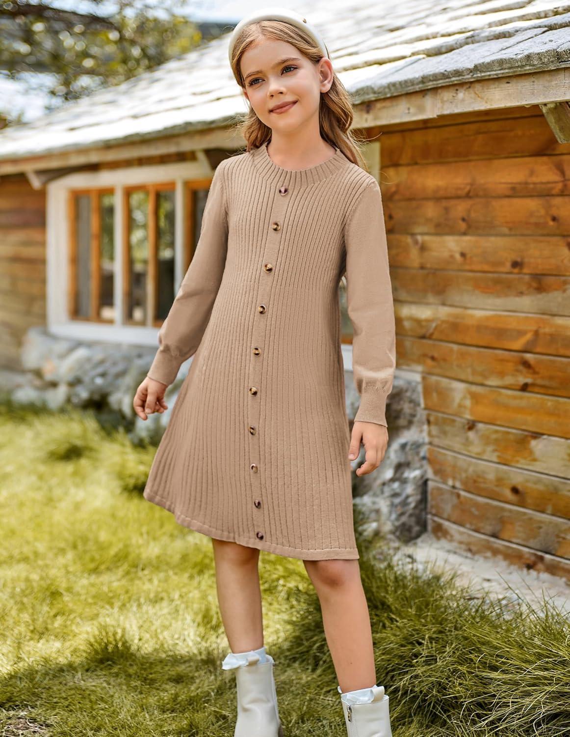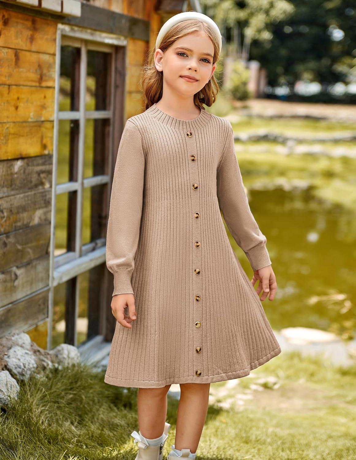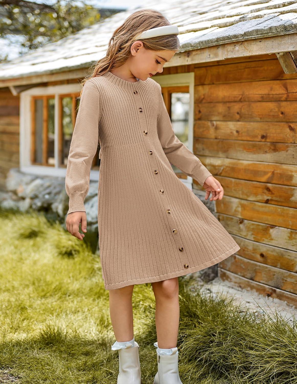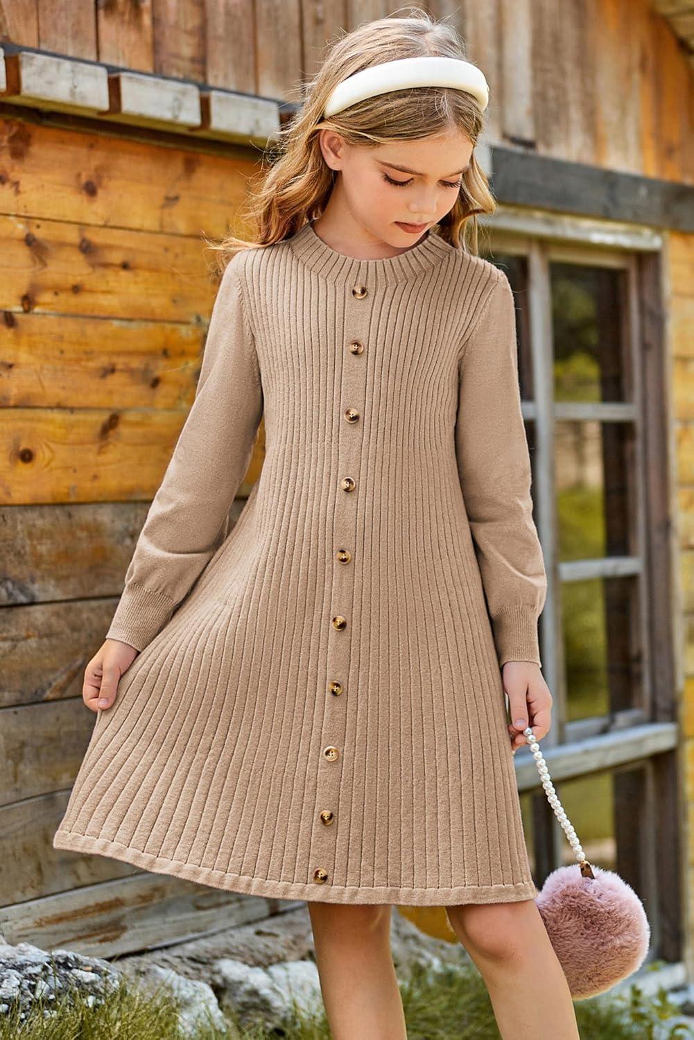 GRACE KARIN Girls Fall Sweater Dresses, Girl Long Sleeve Winter Dress, Kids Knit Casual Formal Dresses Size 6-14(Khaki)