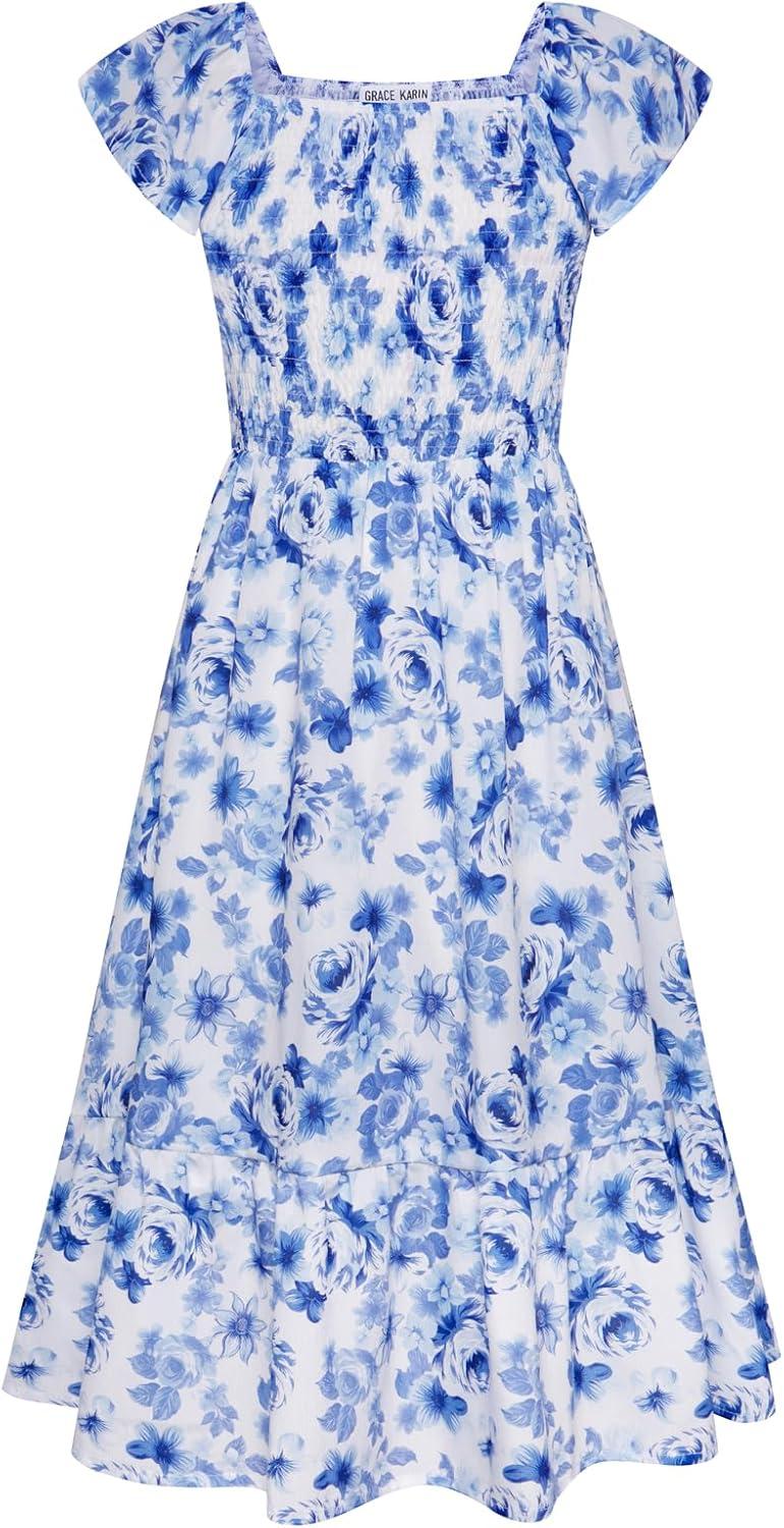 imageGRACE KARIN Girls Floral Dress Flutter Sleeve Square Neck Tiered Midi Dress Smocked Flared Aline Dress 514YBlue and White Floral