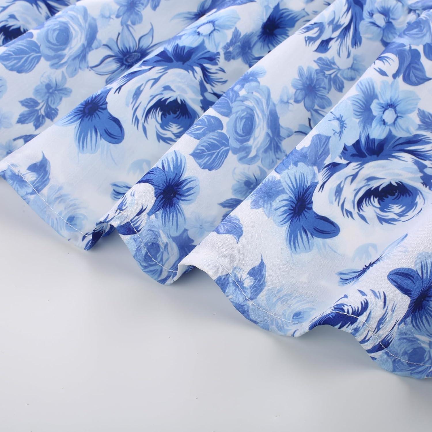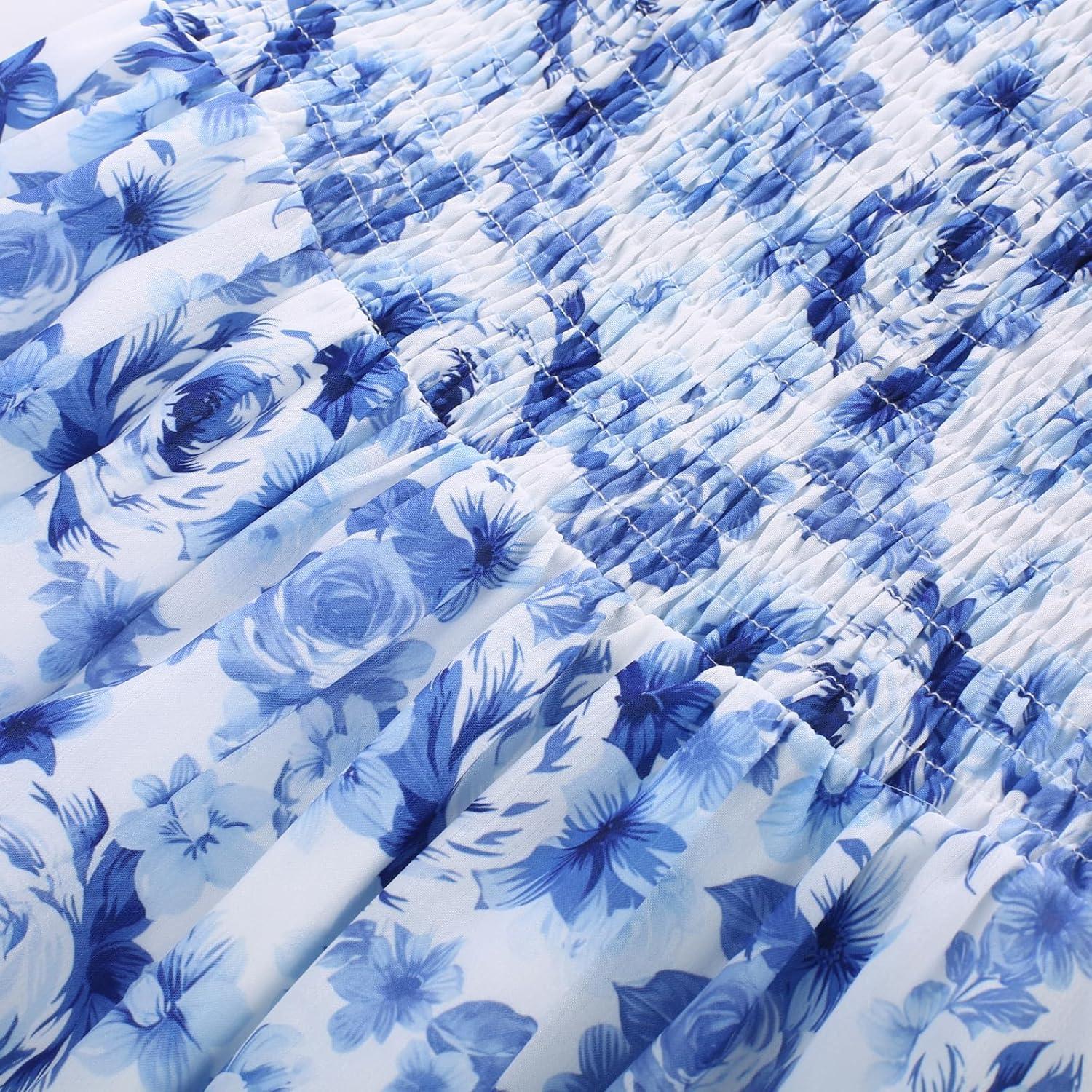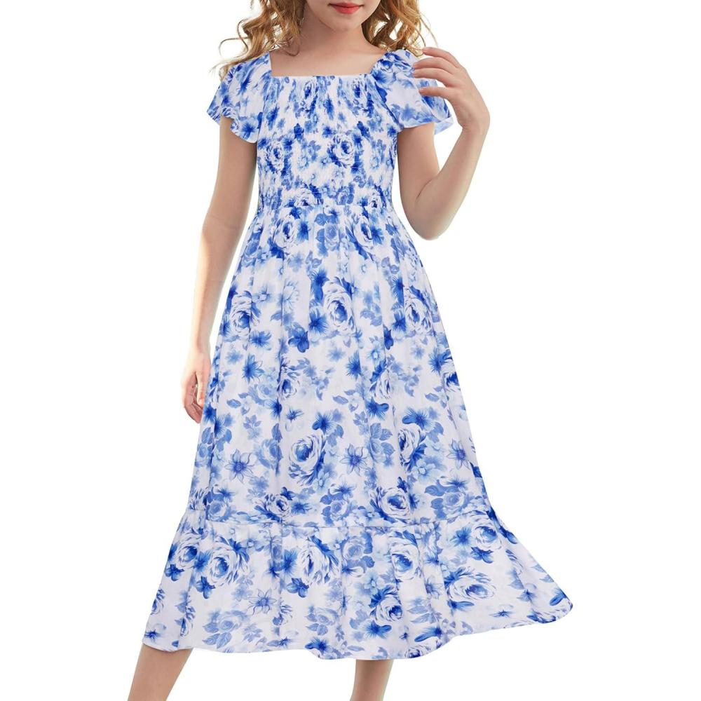GRACE KARIN Girls Floral Dress Flutter Sleeve Square Neck Tiered Midi Dress Smocked Flared A-line Dress 5-14Y(Blue and White Floral)