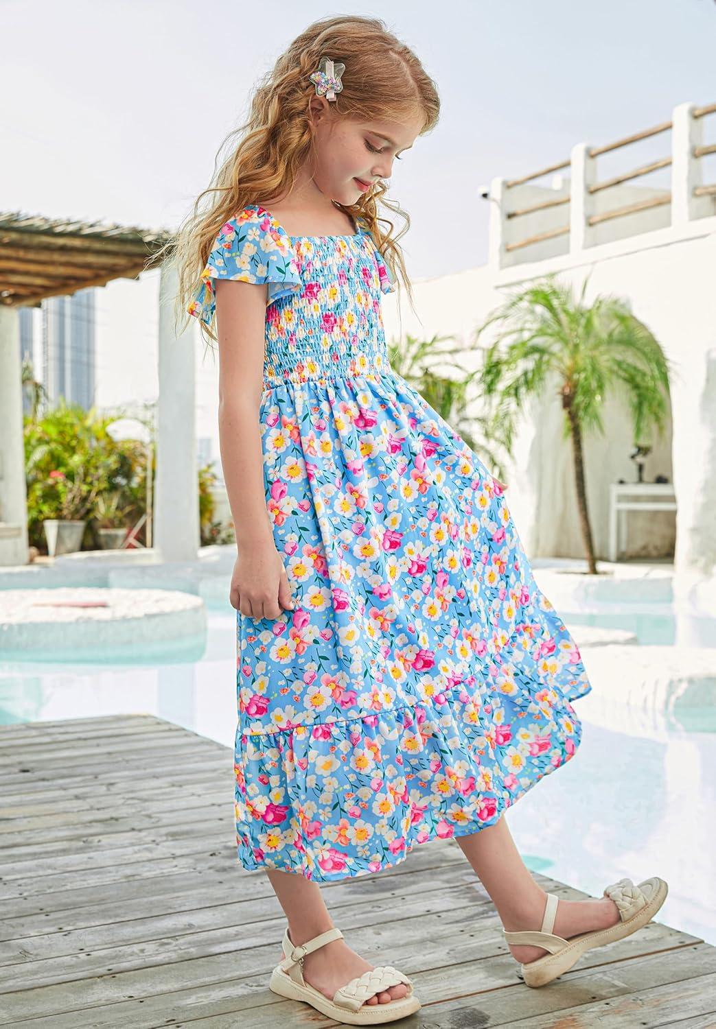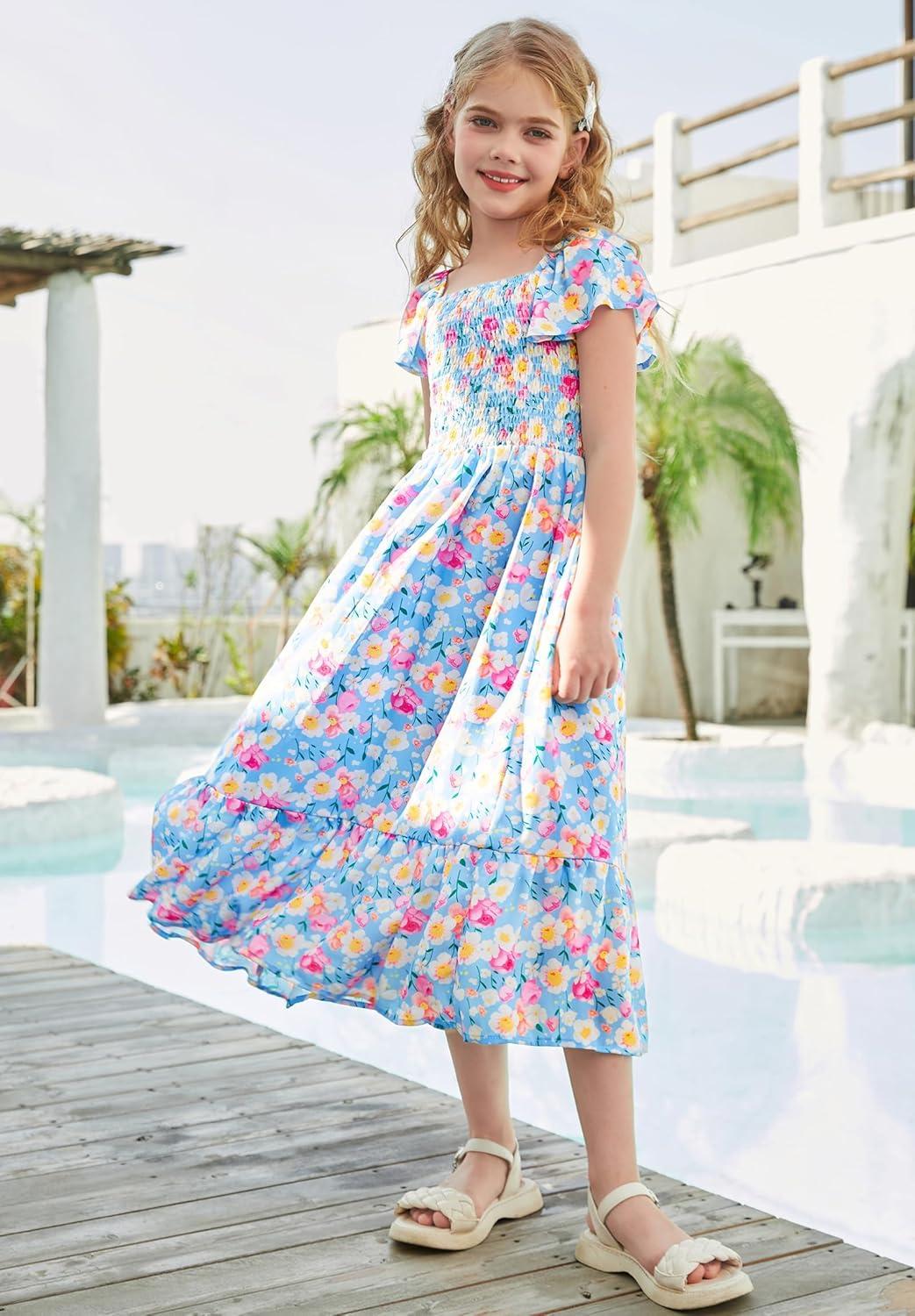 GRACE KARIN Girls Floral Dress Flutter Sleeve Square Neck Tiered Midi Dress Smocked Flared A-line Dress 5-14Y(Flowers on Blue)