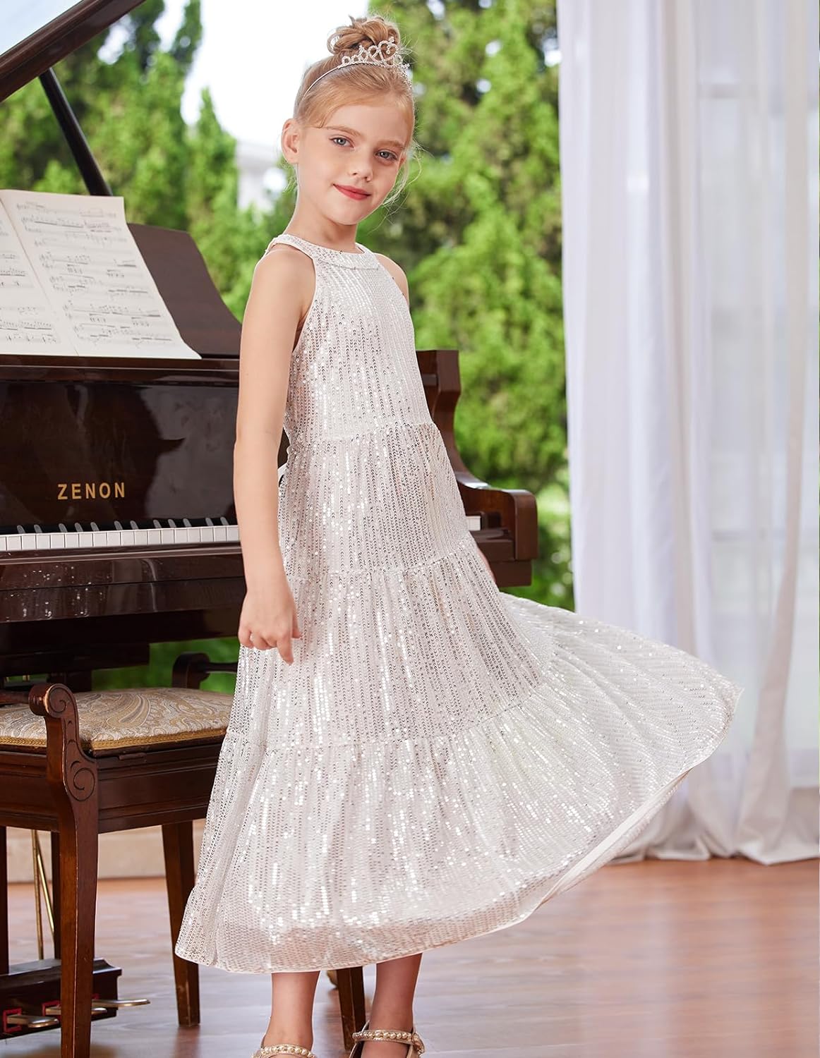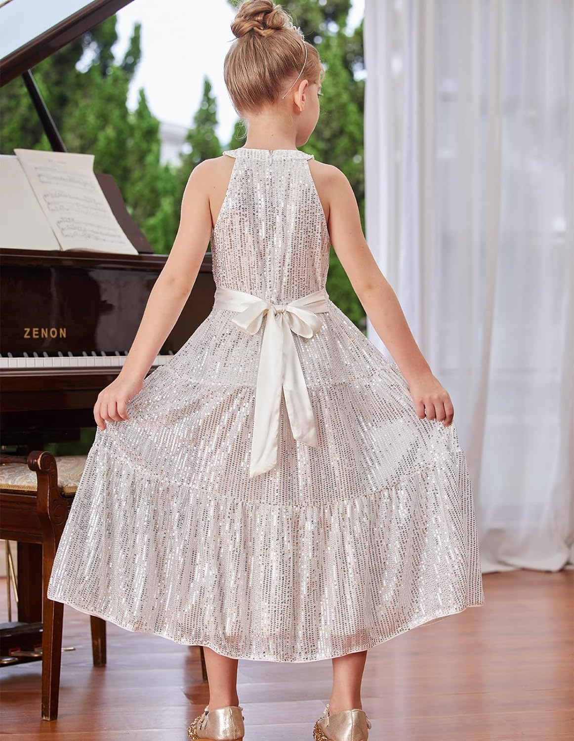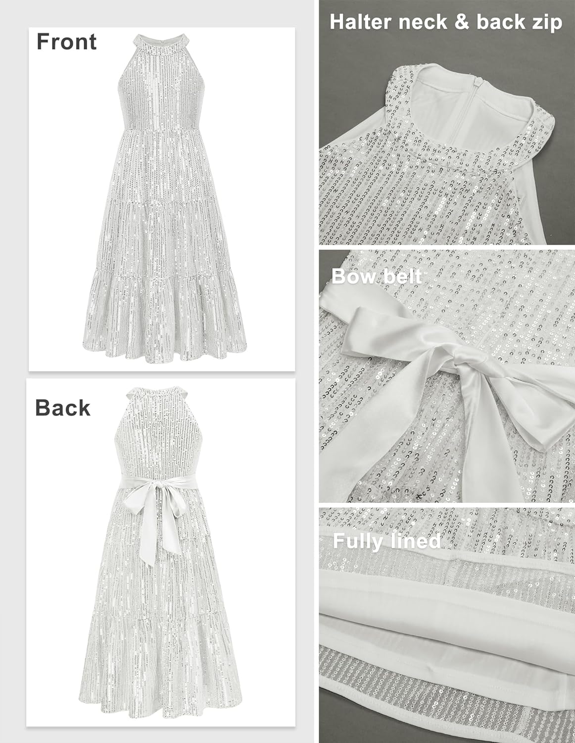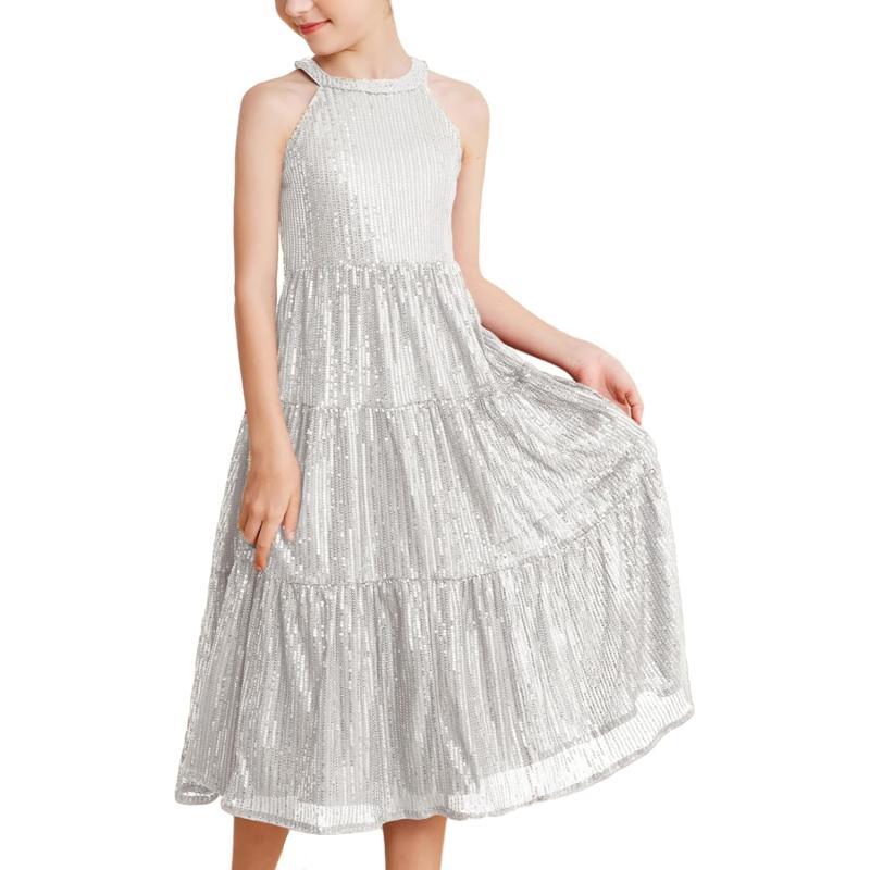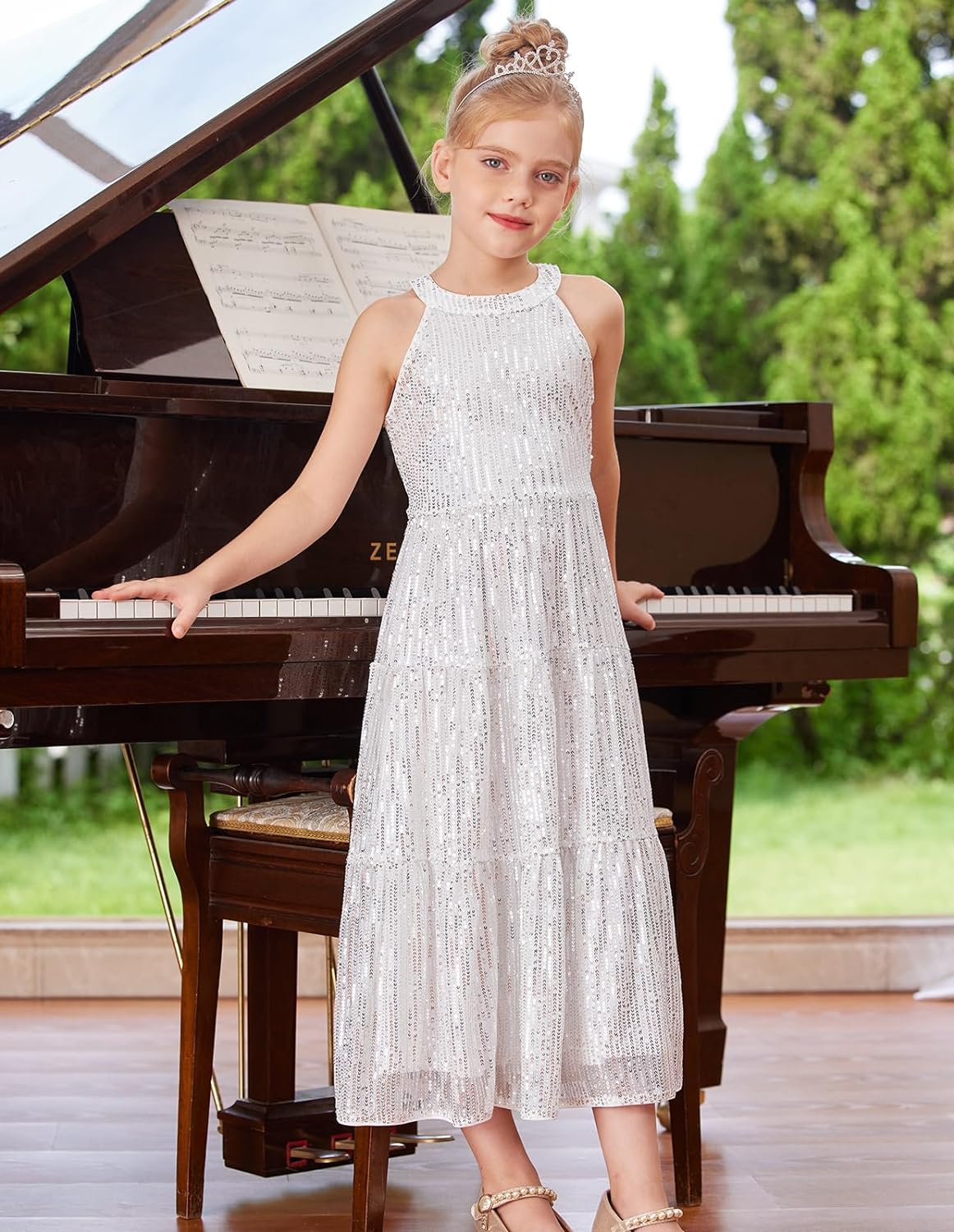 GRACE KARIN Girls Halter Neck Sequin Dress Elegant Cute Girls Party Maxi Dress for 514YSilver