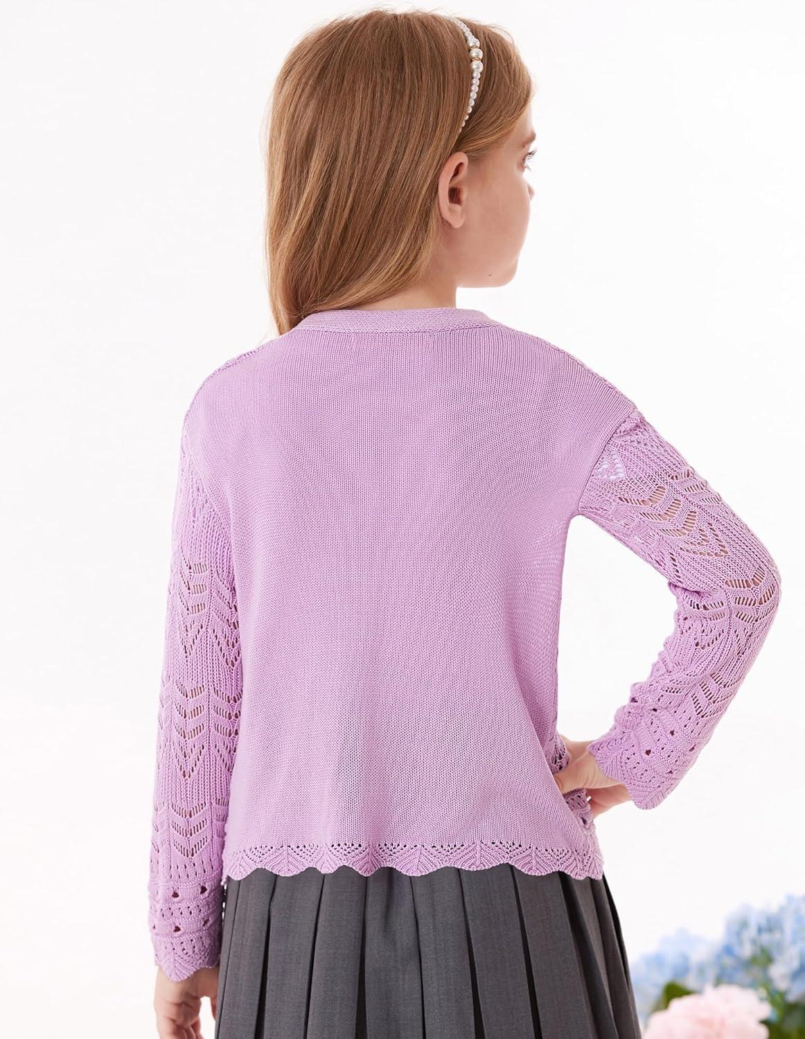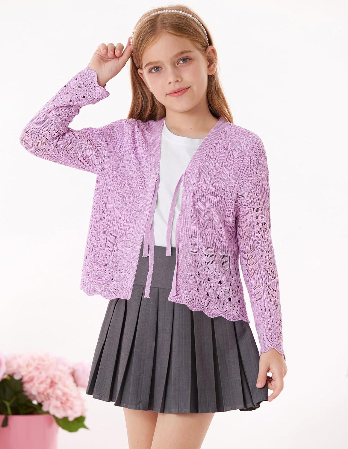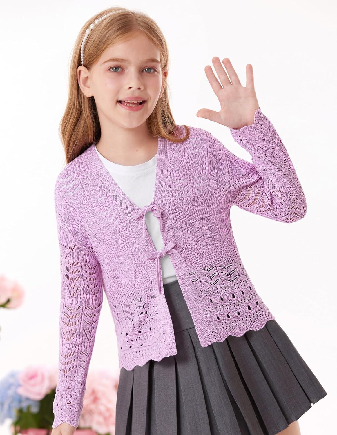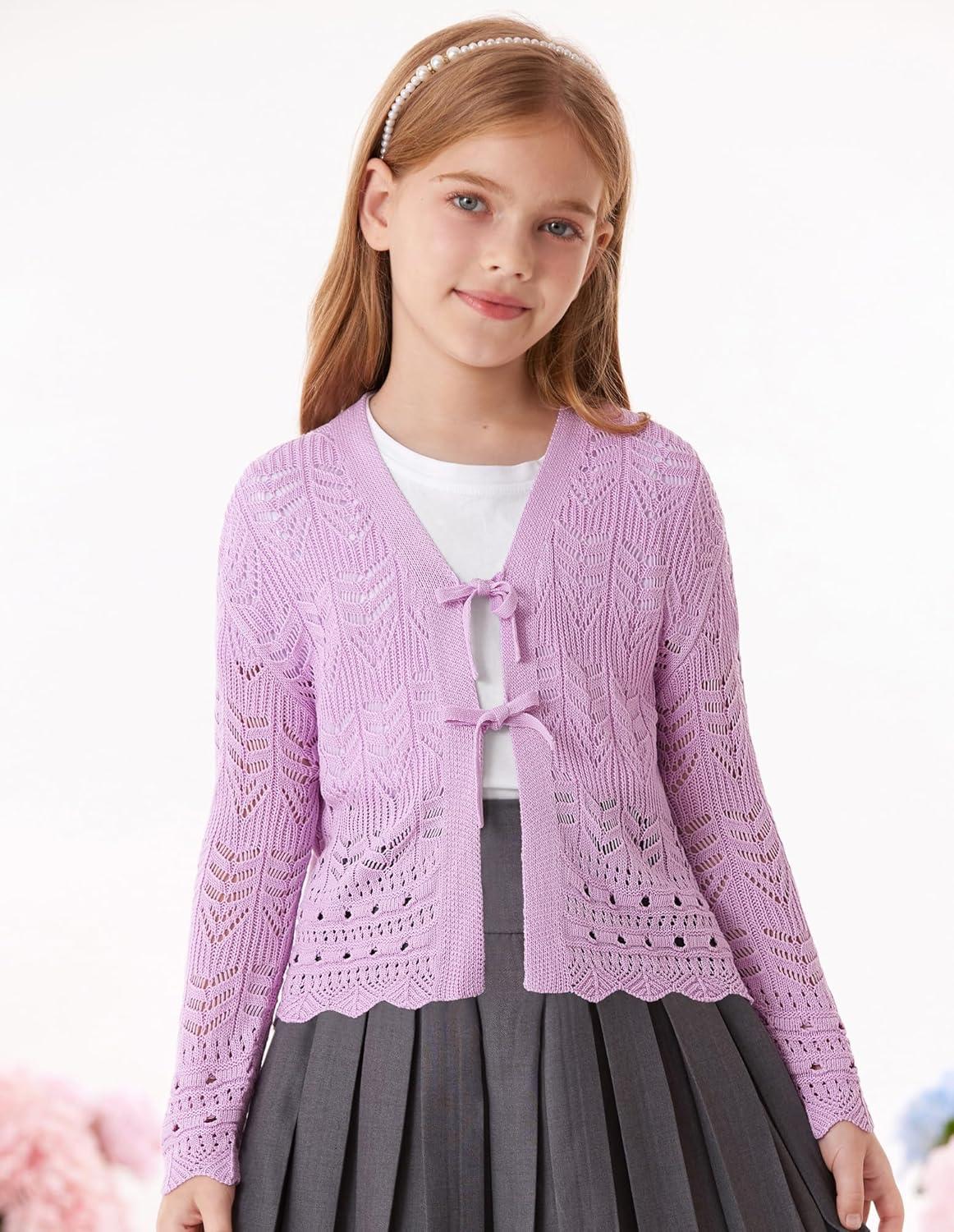 GRACE KARIN Girls Long Sleeve Cardigan Sweater Tie Front Bow V Neck Crochet Knit Lightweight Shrug 5-12 Years(Purple)