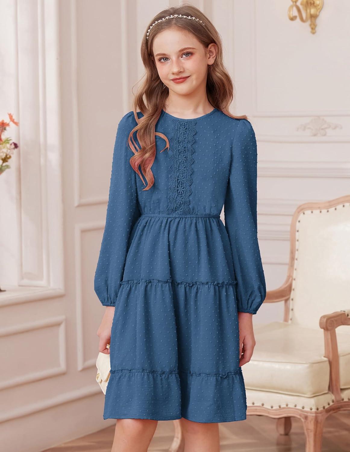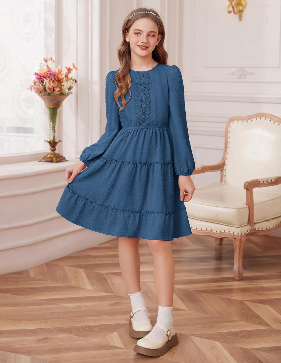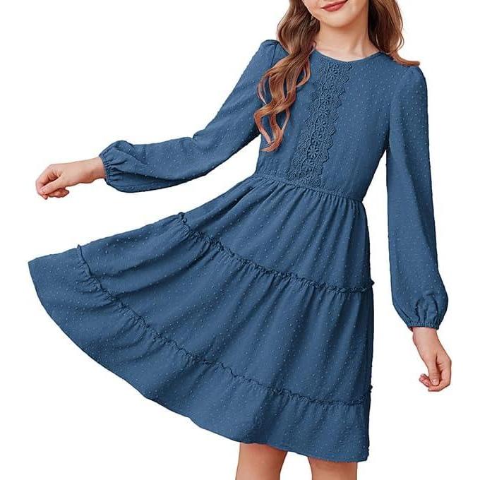 GRACE KARIN Girls Long Sleeve Fall Dress Casual Party Teen Swiss Dot Ruffle Tiered Lace Dresses for 7-14 Years(Deep Blue)