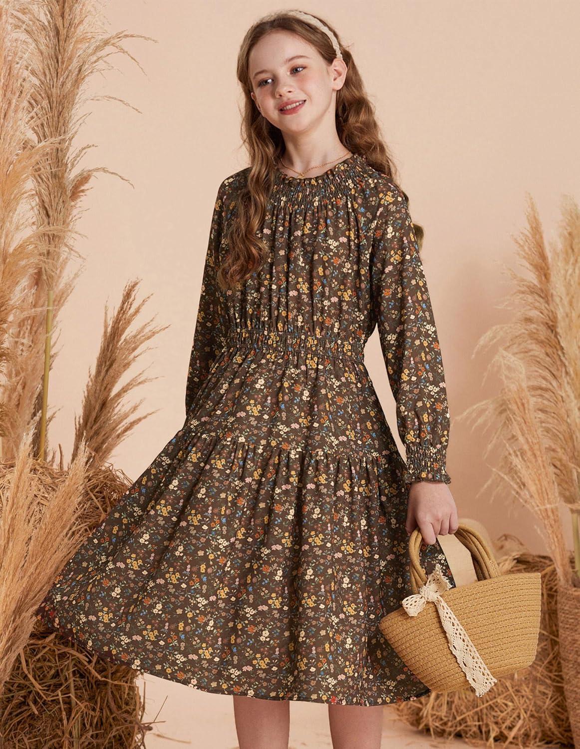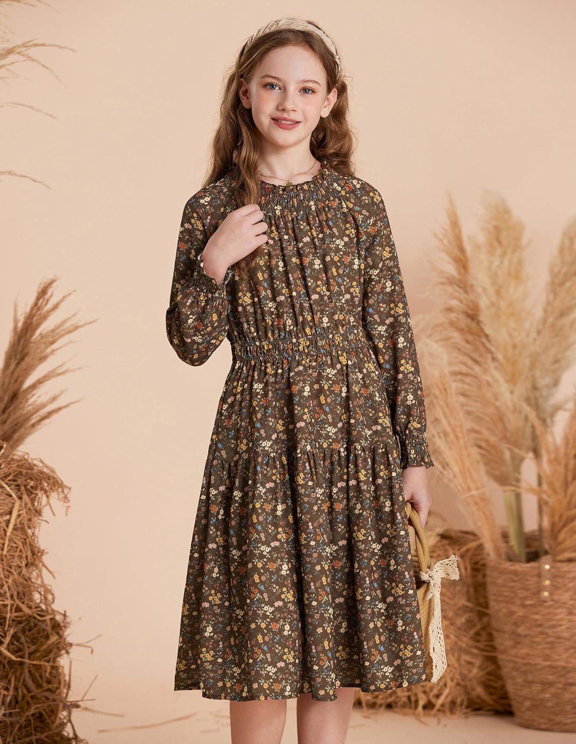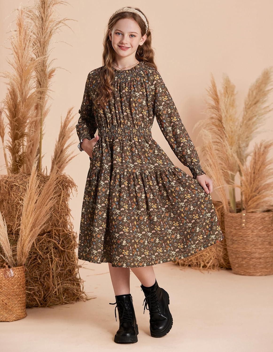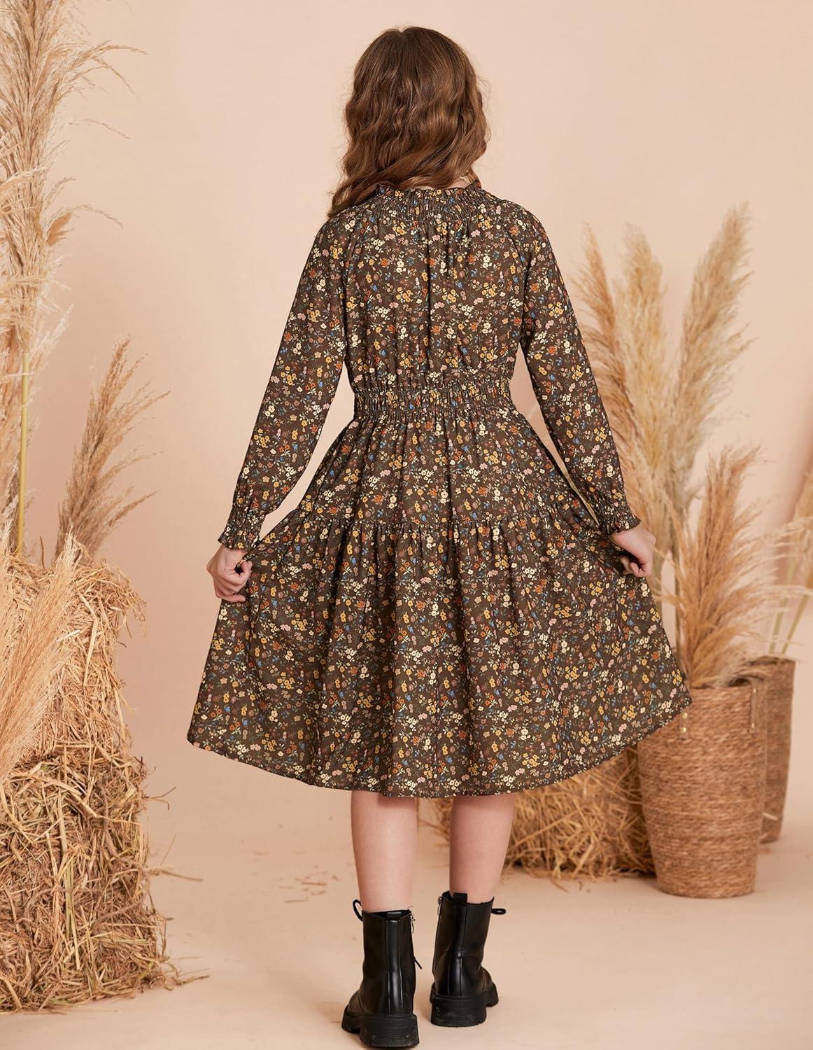 GRACE KARIN Girls Long Sleeve Fall Dress Floral High Waist Casual Midi Dresses with Pocket for 6-14 Years(Brown)
