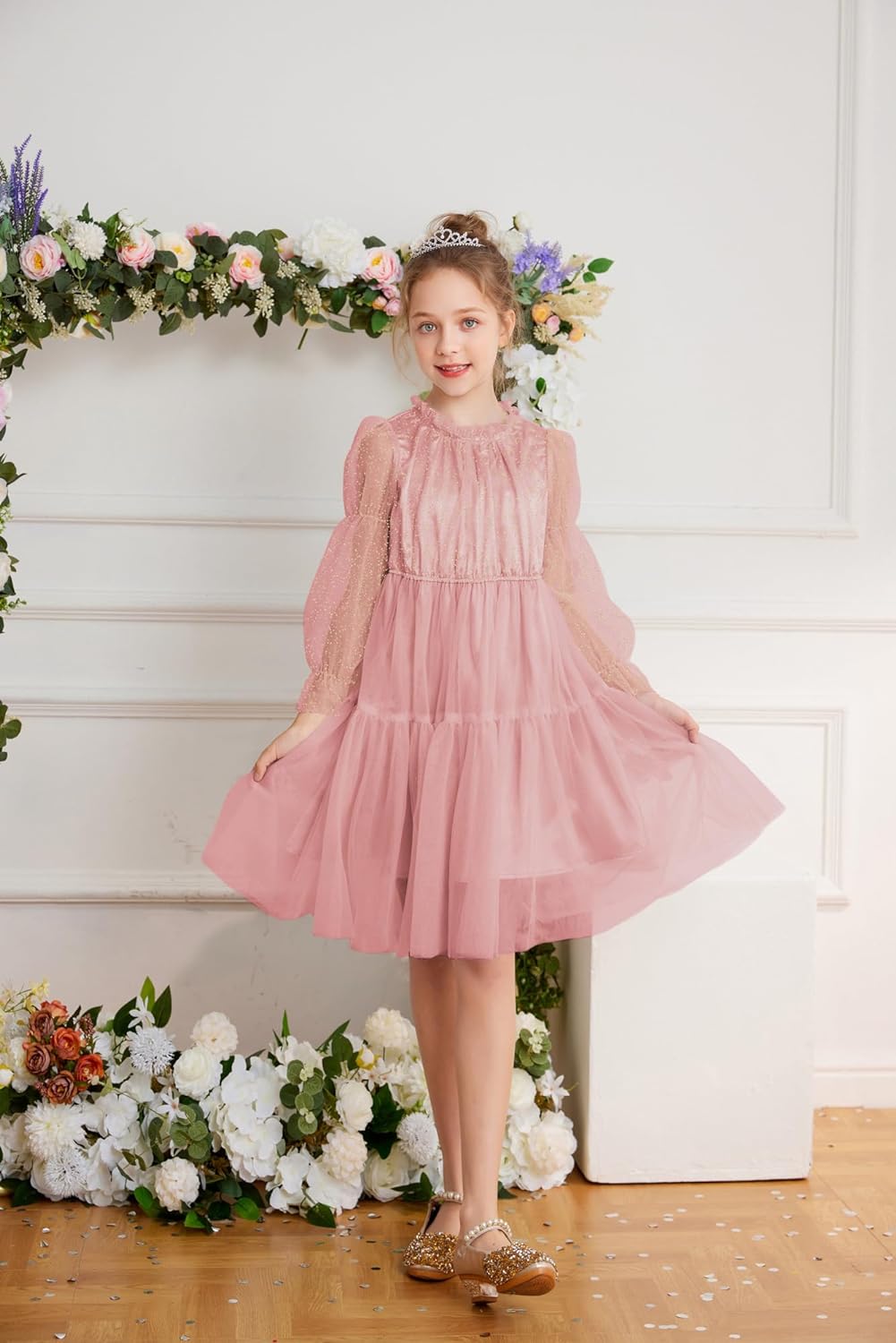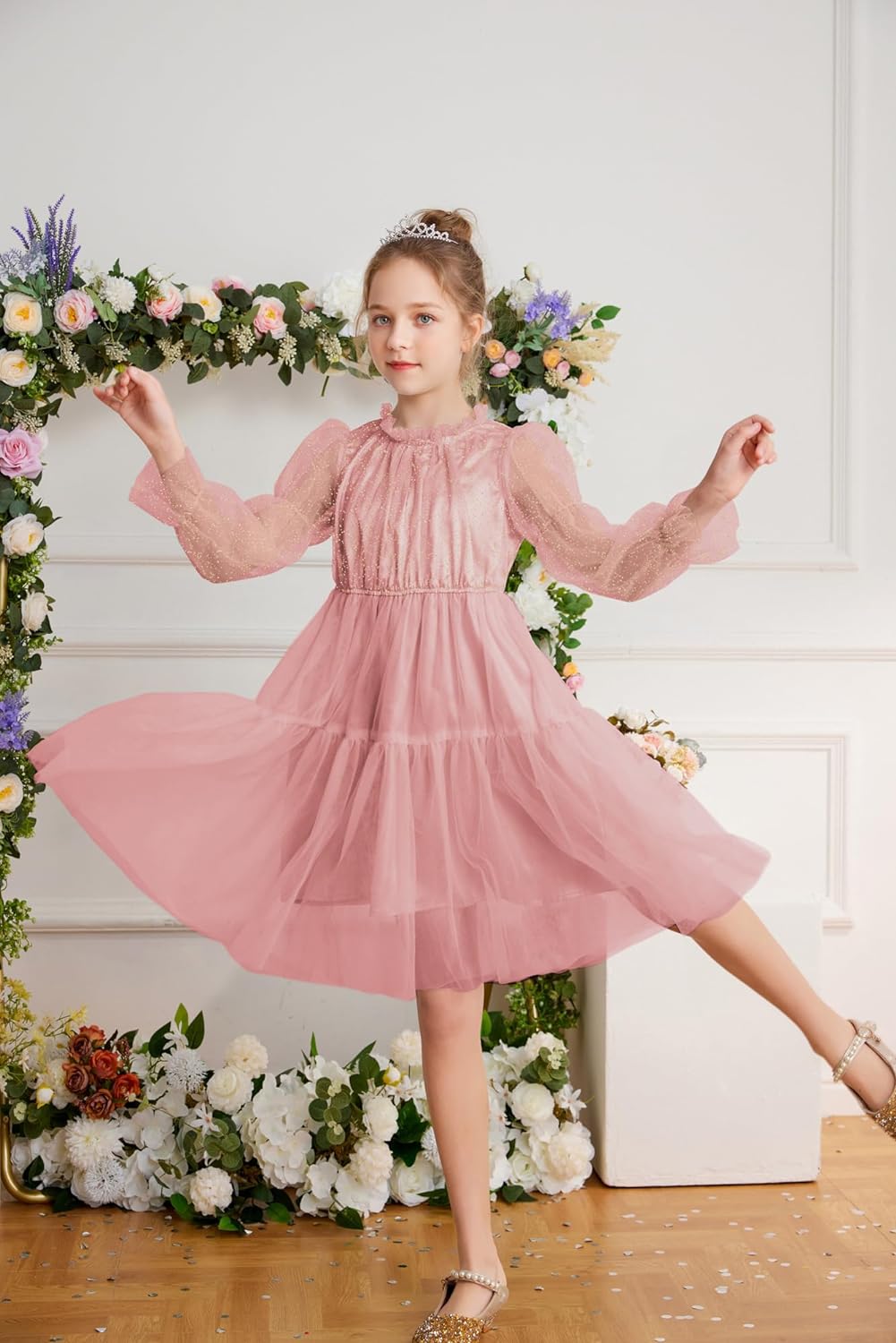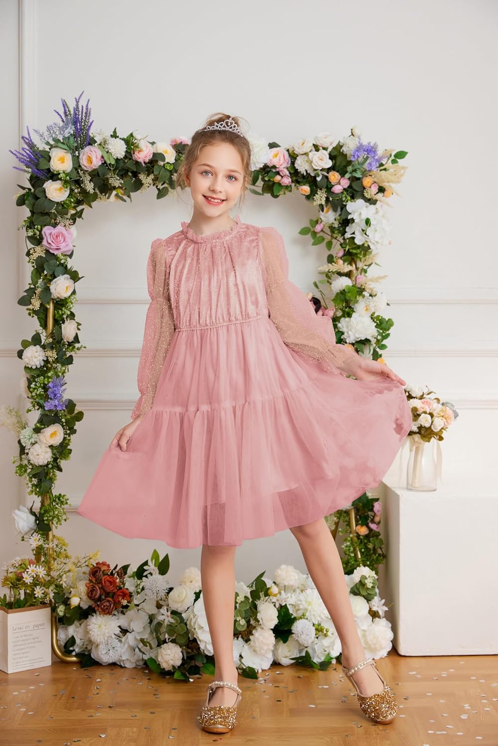 GRACE KARIN Girls Mesh Long Sleeve Dress Flared High Waist Party Dresses 5-12Y(Pink)