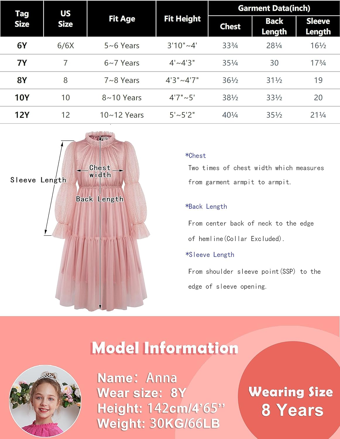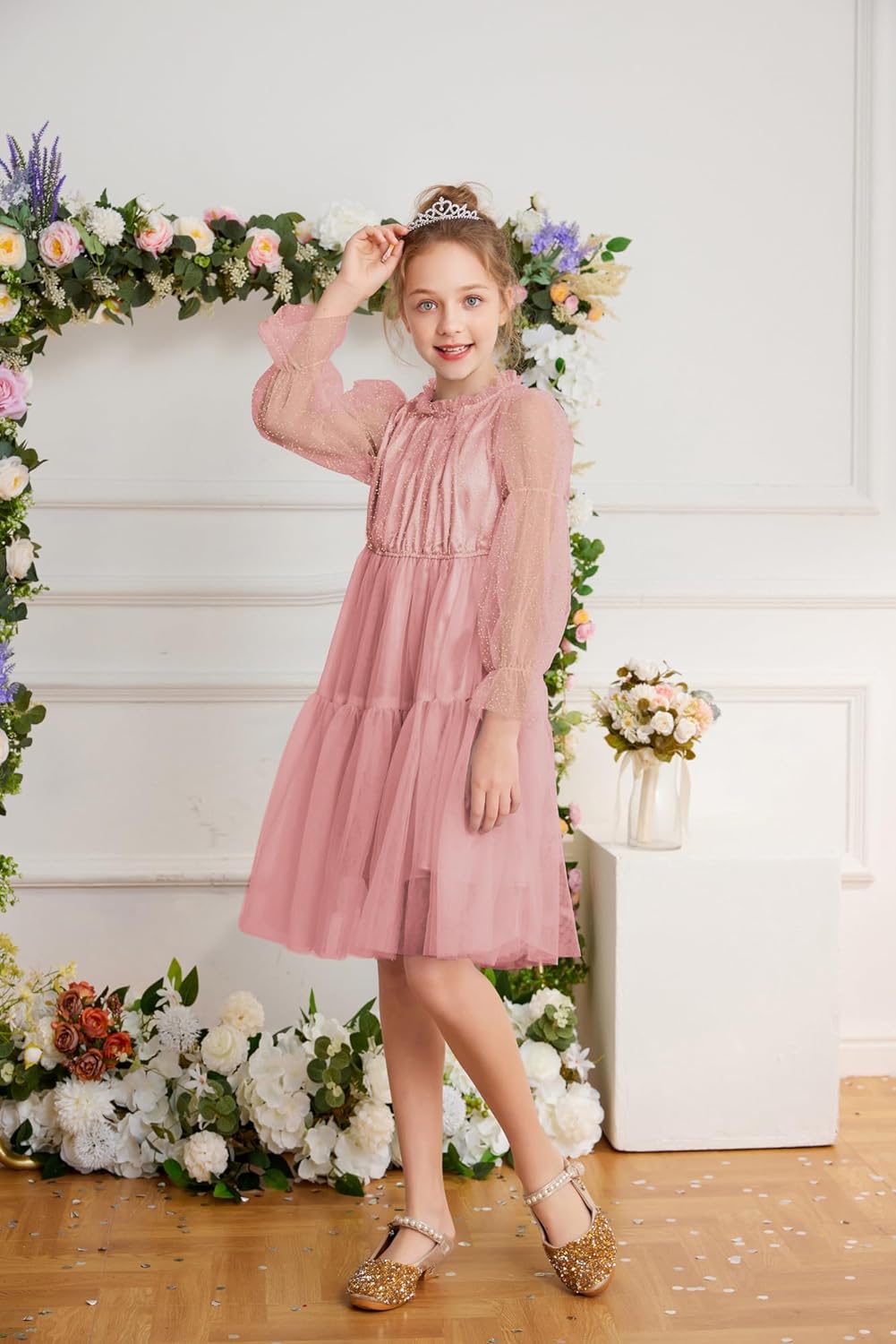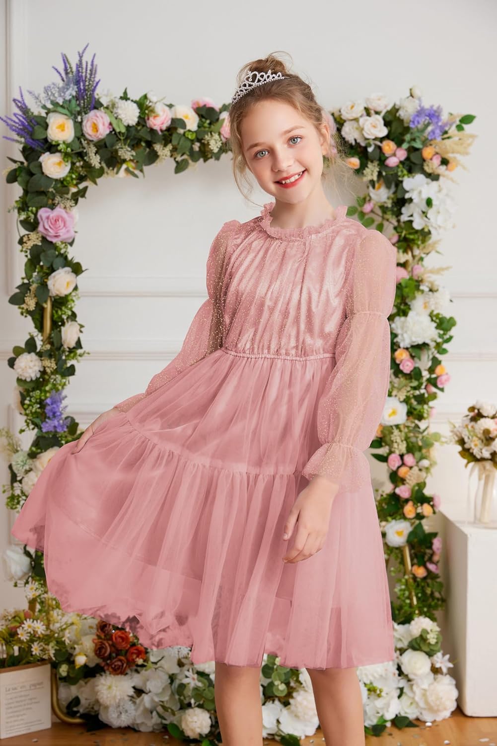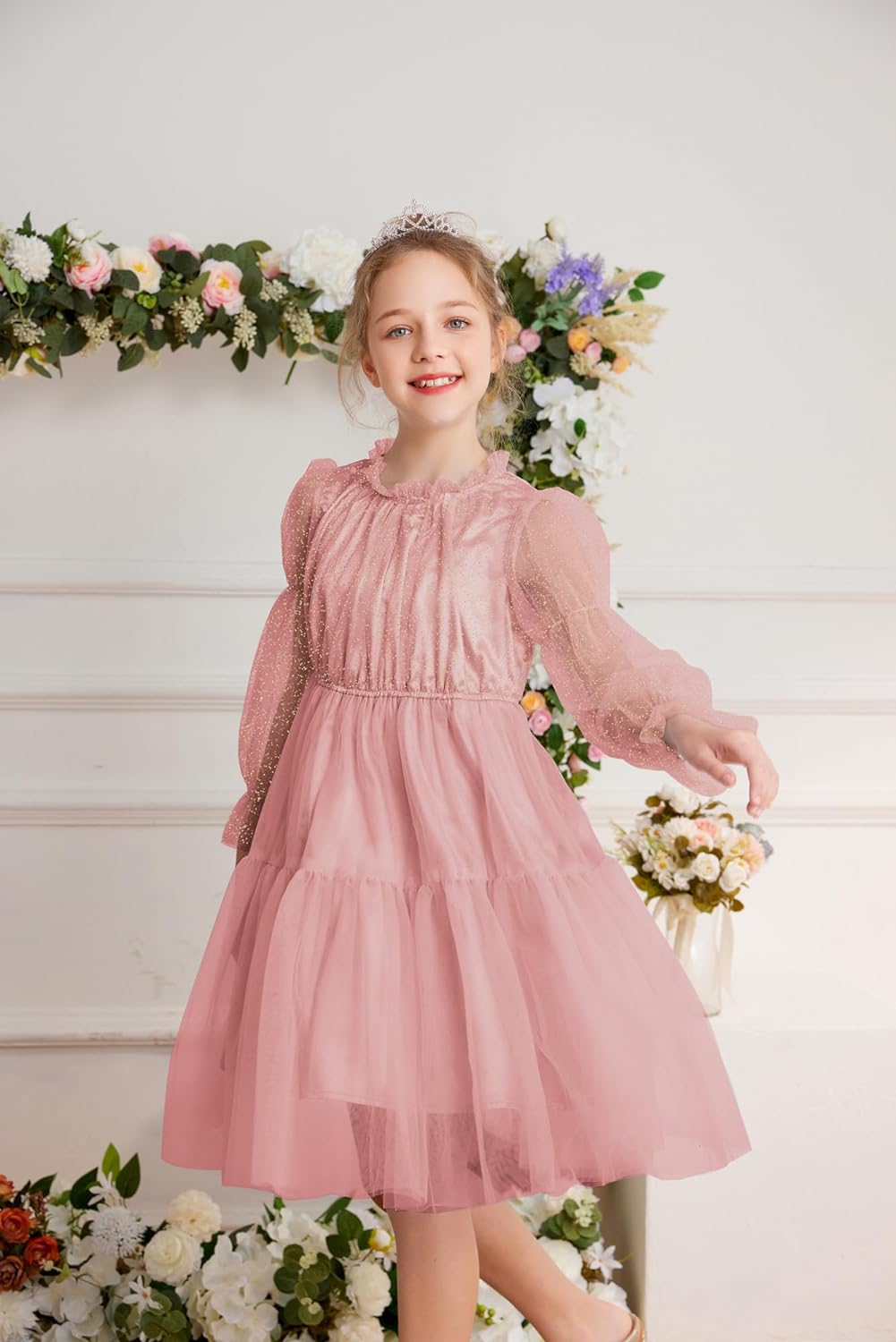 GRACE KARIN Girls Mesh Long Sleeve Dress Flared High Waist Party Dresses 5-12Y(Pink)