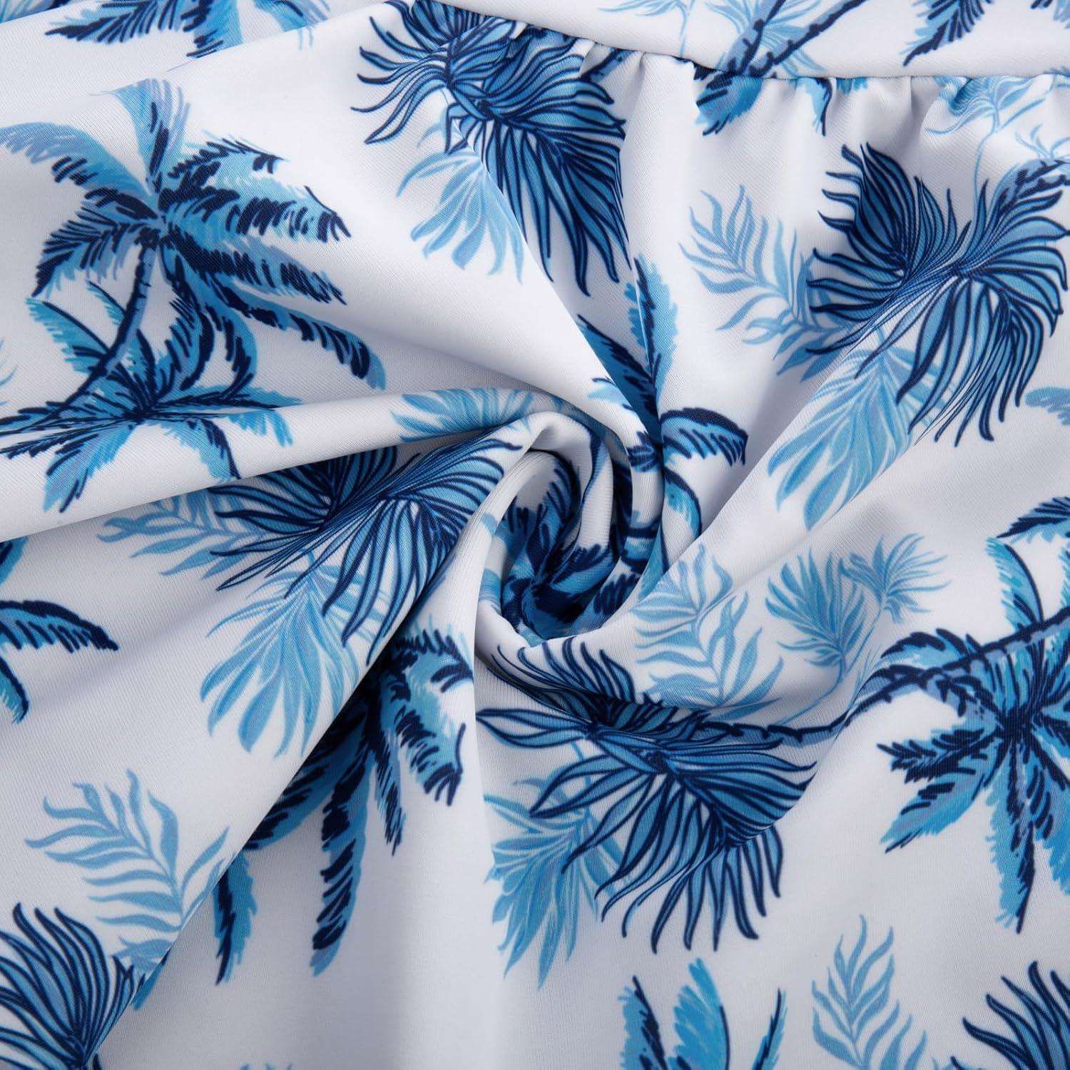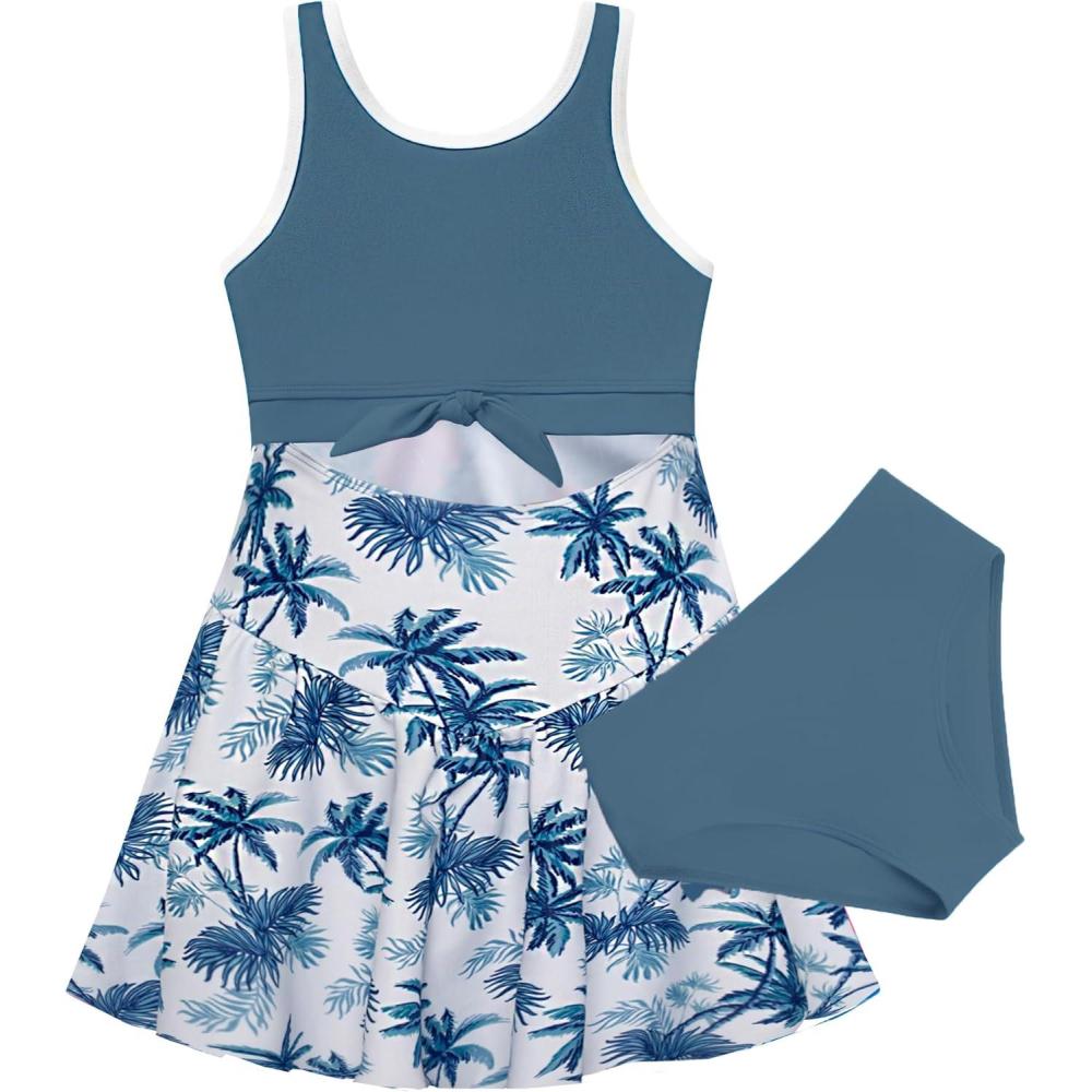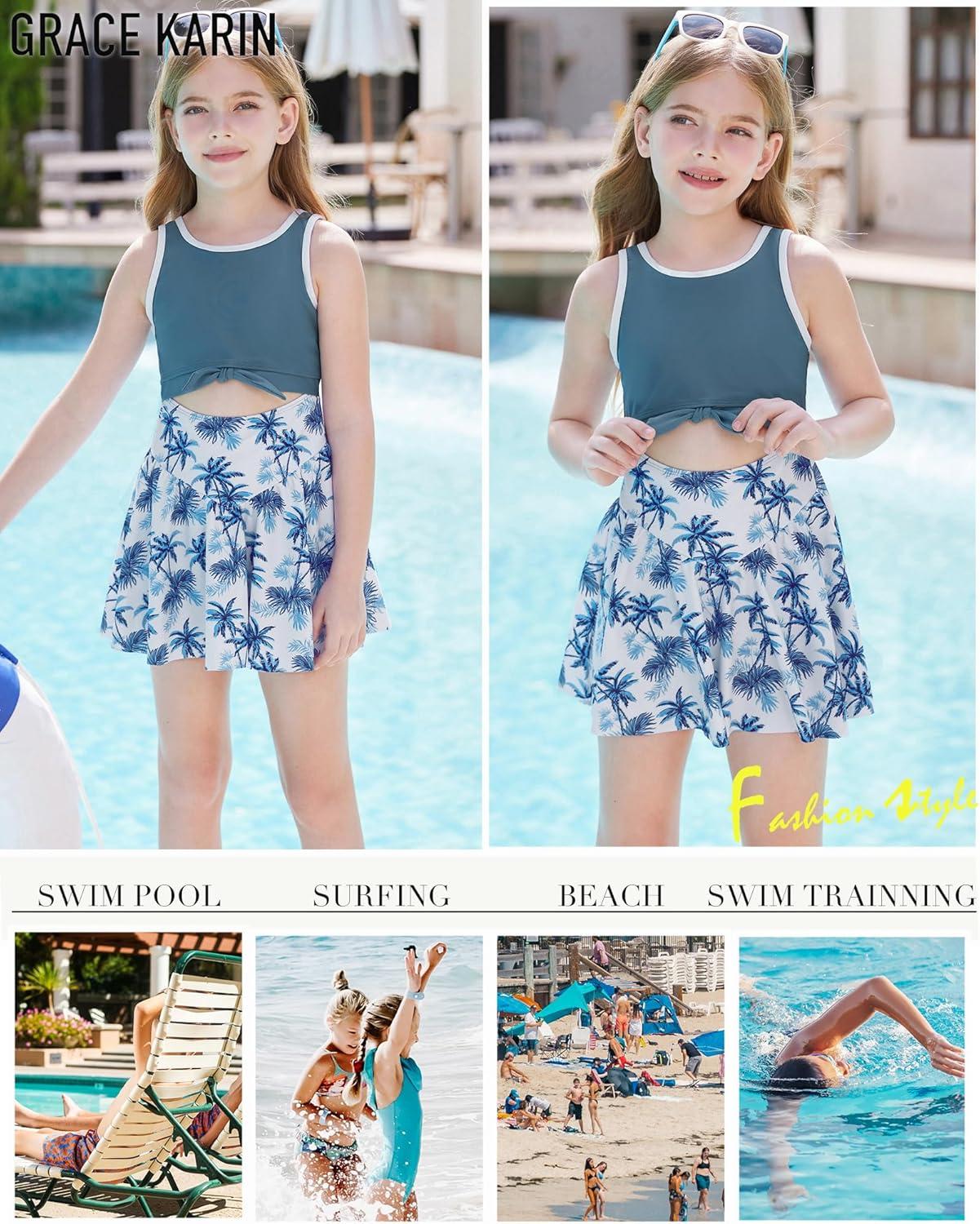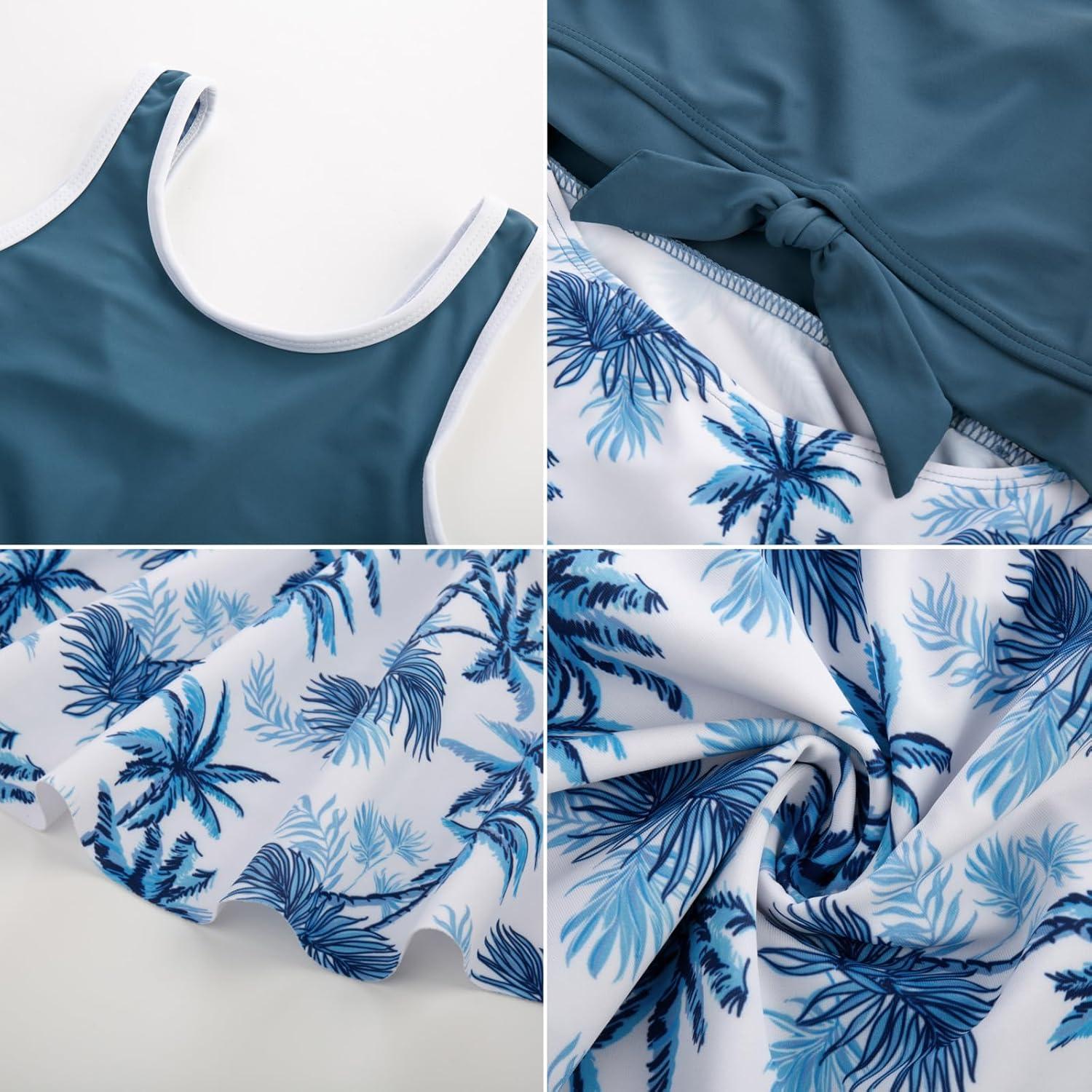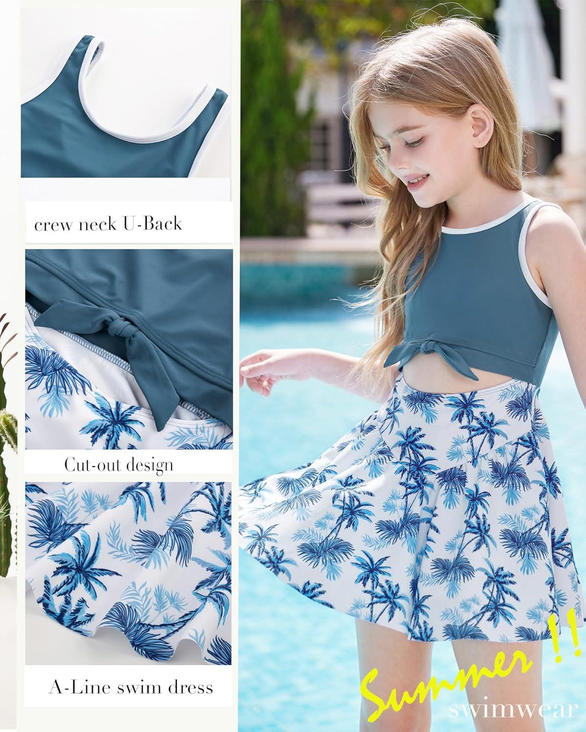 GRACE KARIN Girls One Piece Swimsuit Cutout High Waisted Tie Knot 2 Piece Bathing Suit with Bikini Kids Swimwear(Haze Blue-coconut Tree)