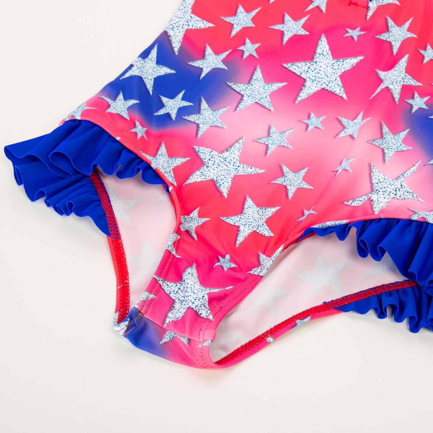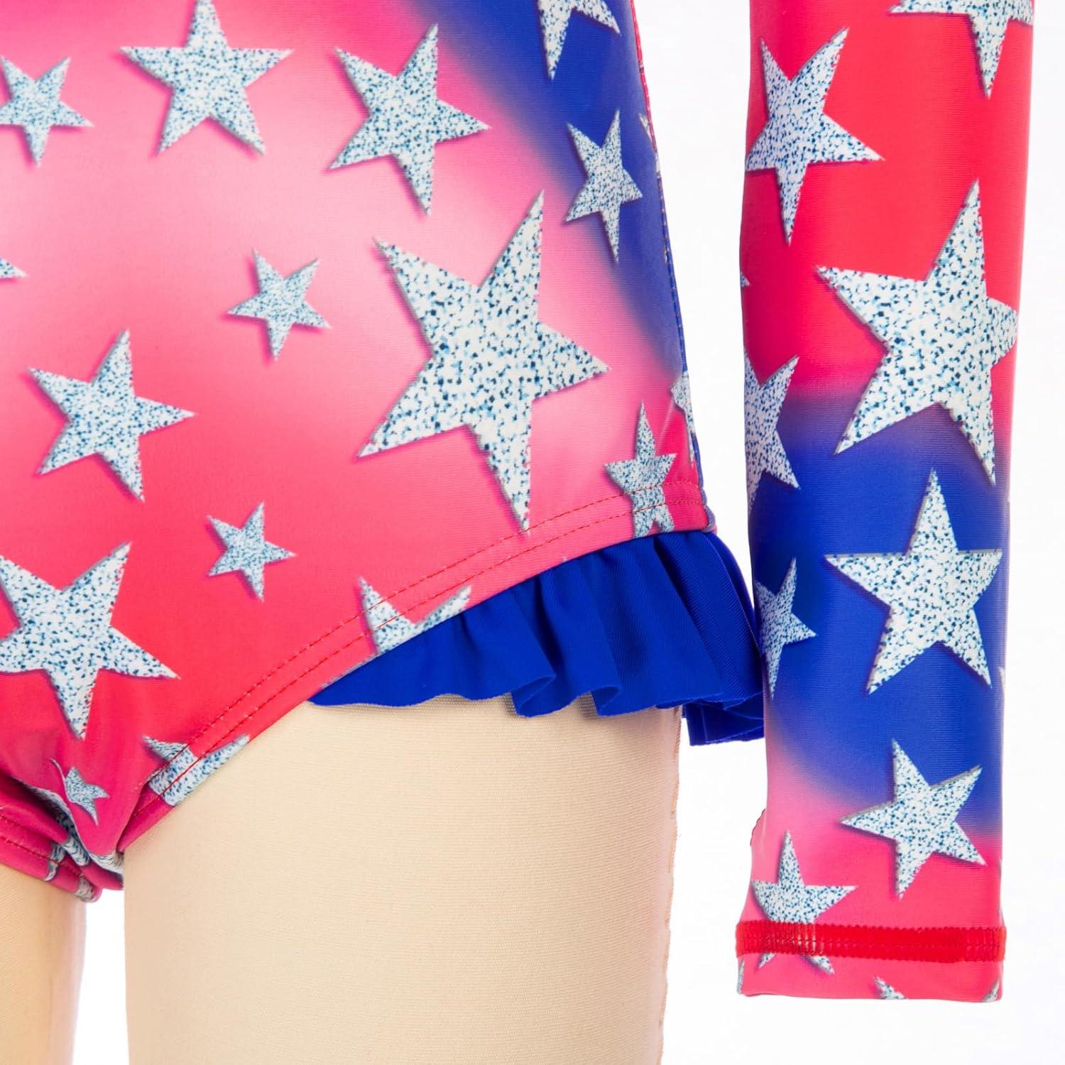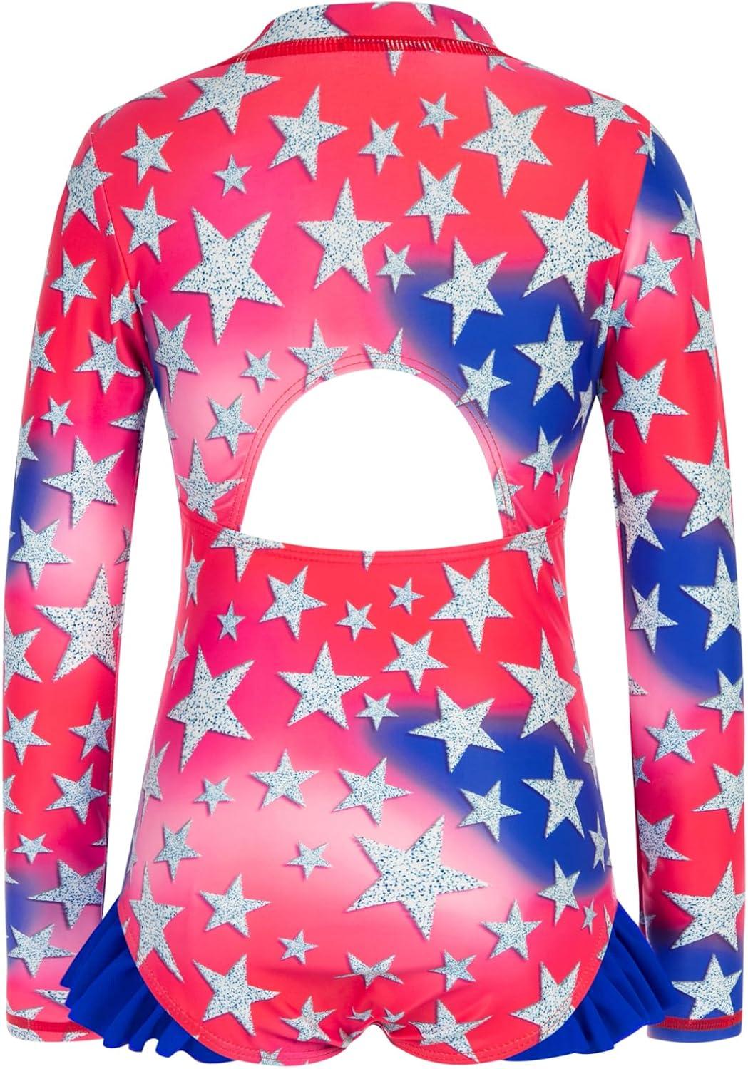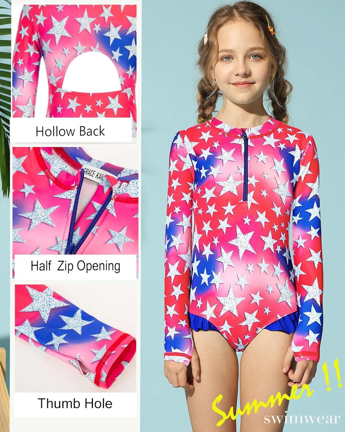 GRACE KARIN Girls One Piece Swimsuits Long Sleeve Bathing Suits Swimwear 5-14Y(Blue Red Stars)