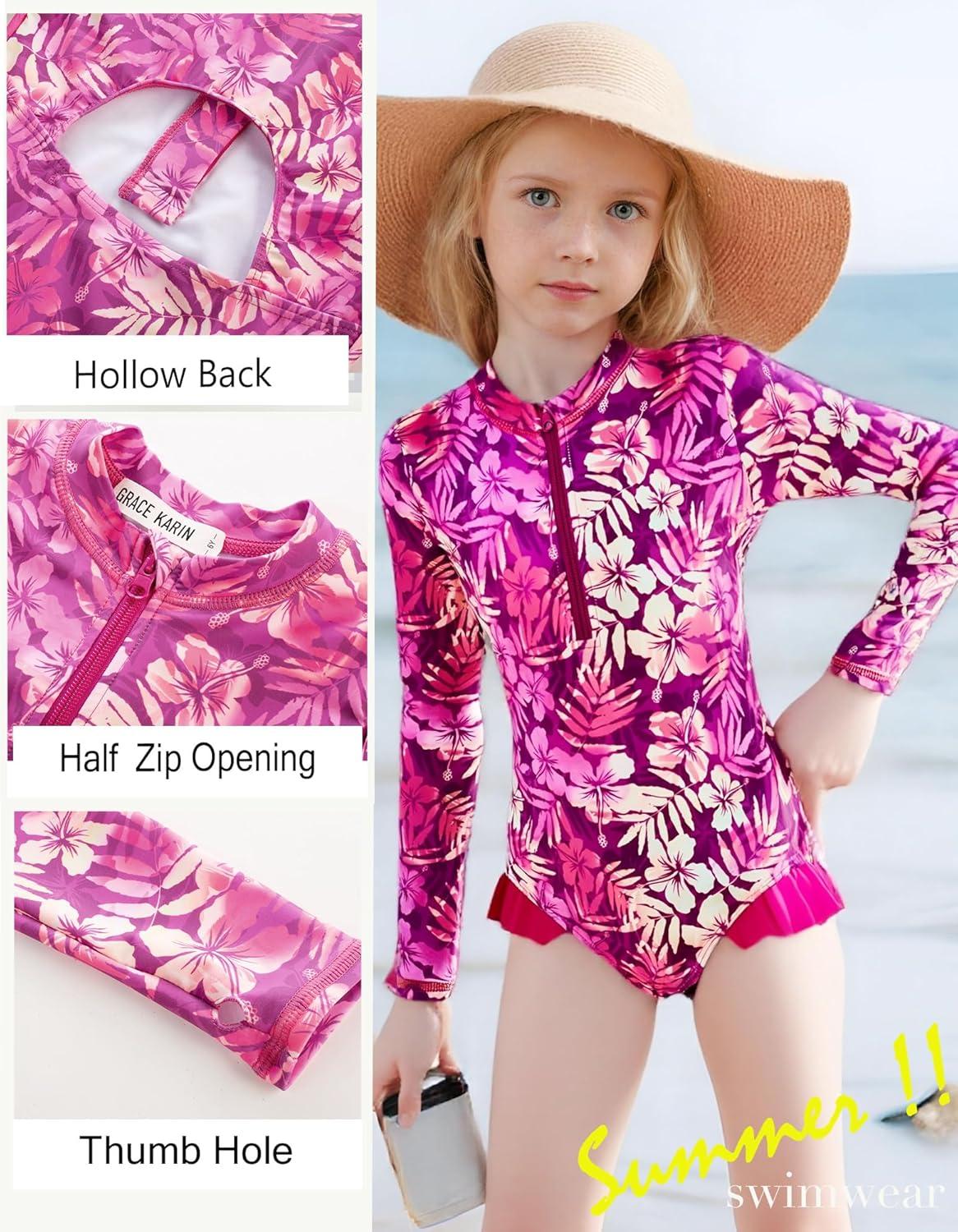GRACE KARIN Girls One Piece Swimsuits Long Sleeve Bathing Suits Swimwear 5-14Y(Hot Pink Floral)