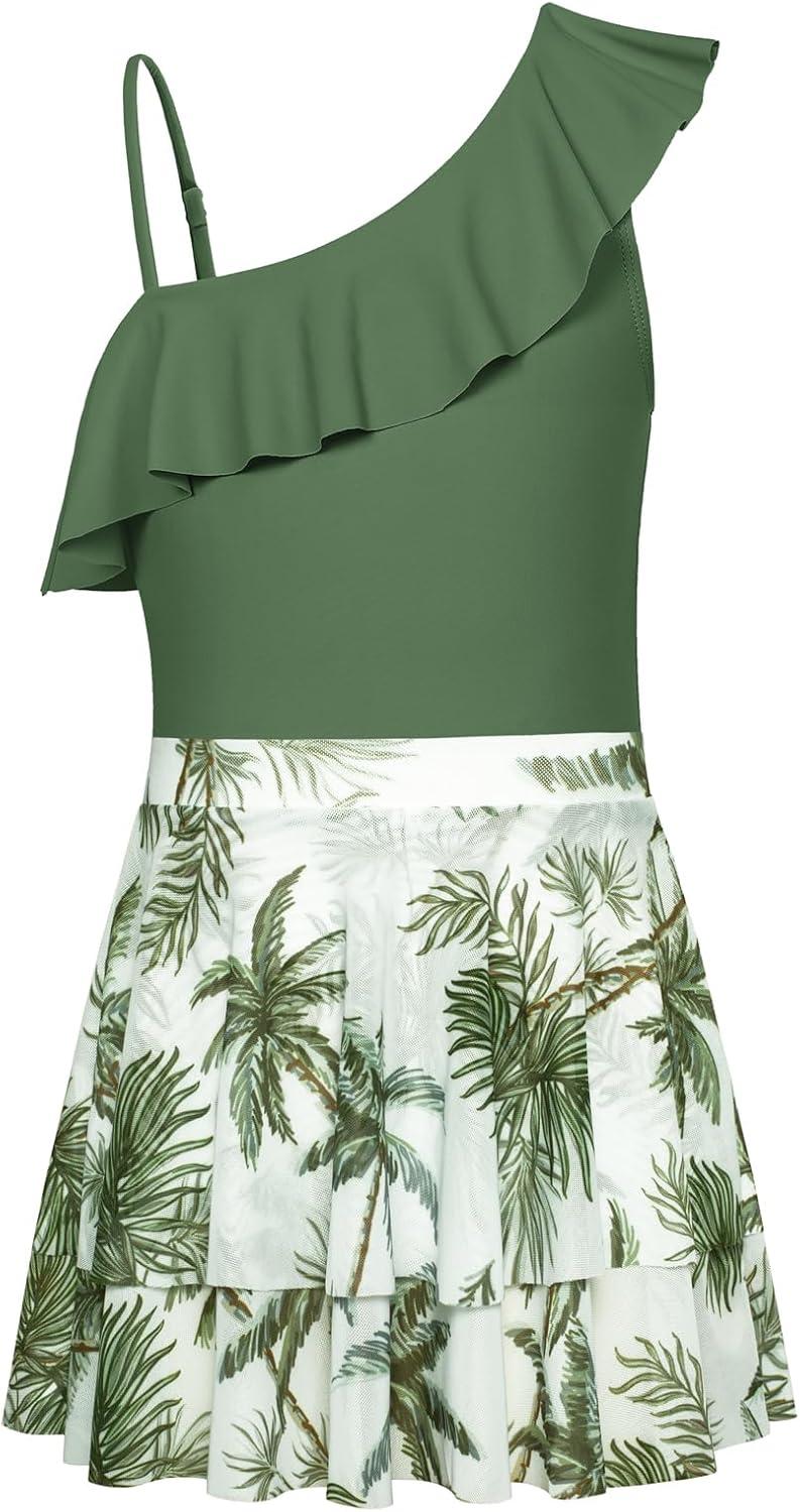GRACE KARIN Girls One Piece Swimsuits with Mesh Skirt Bathing Suit Swimwear 6-14Y(Green Coconut Tree)