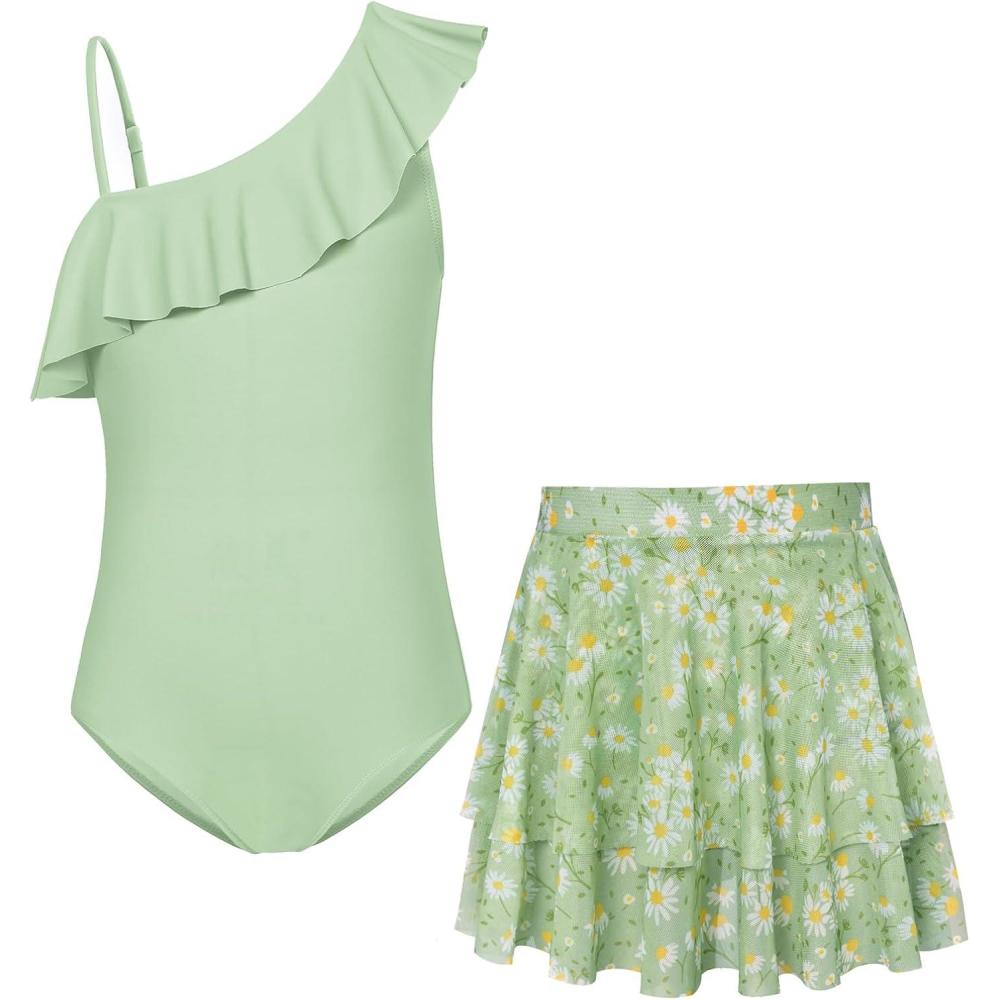 GRACE KARIN Girls One Piece Swimsuits with Mesh Skirt Bathing Suit Swimwear 6-14Y(Green)