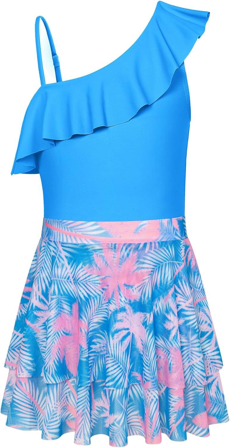GRACE KARIN Girls One Piece Swimsuits with Mesh Skirt Bathing Suit Swimwear 6-14Y(Sky Blue)