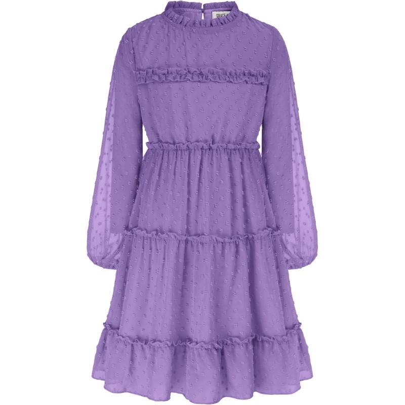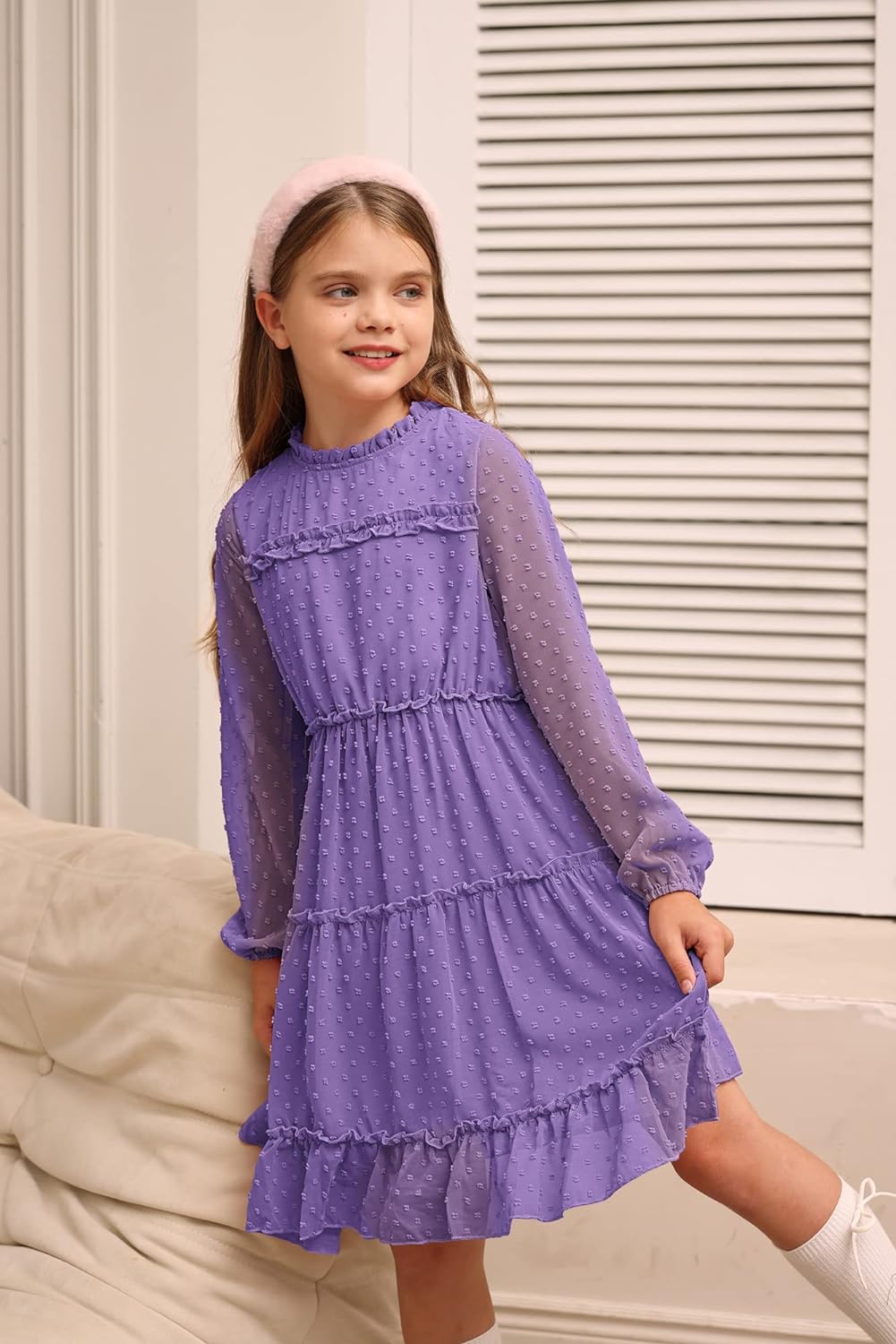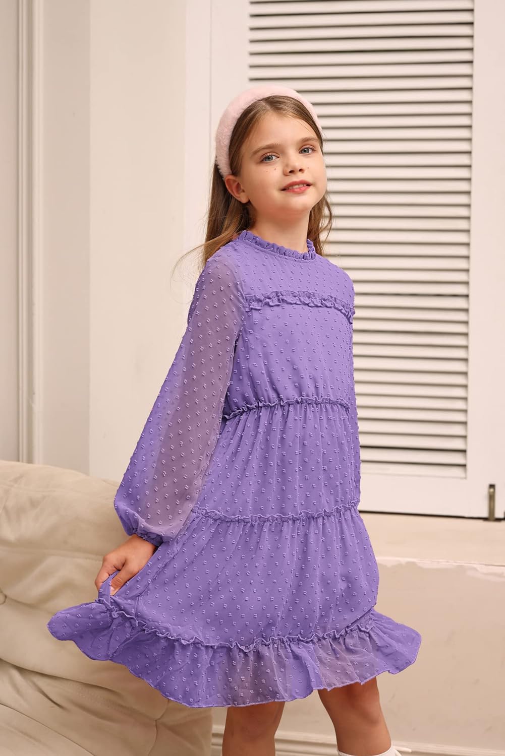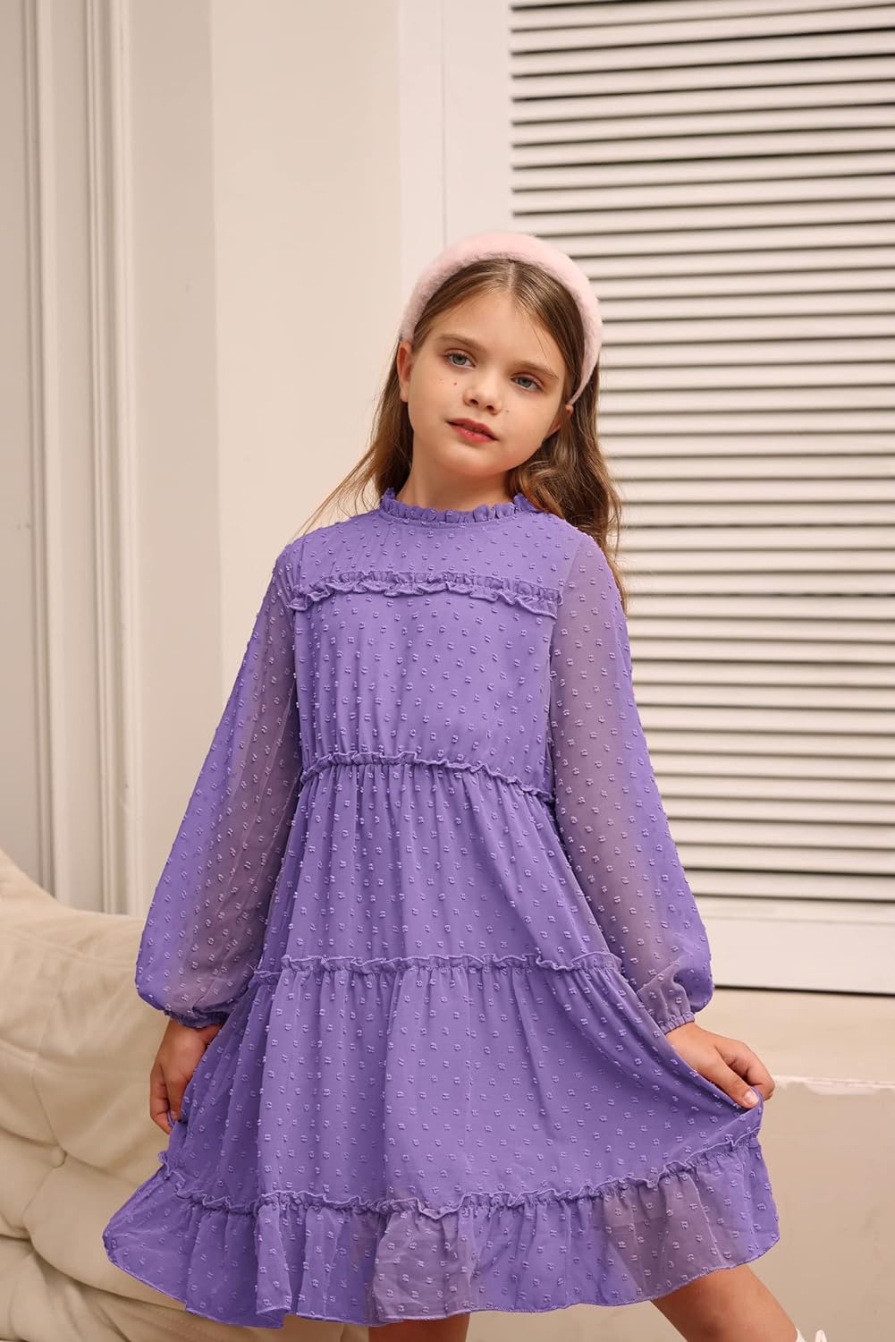 GRACE KARIN Girls Ruffle Tiered Dress Long Sleeve Swiss Dot Flowy ALine Dress 612YPurple