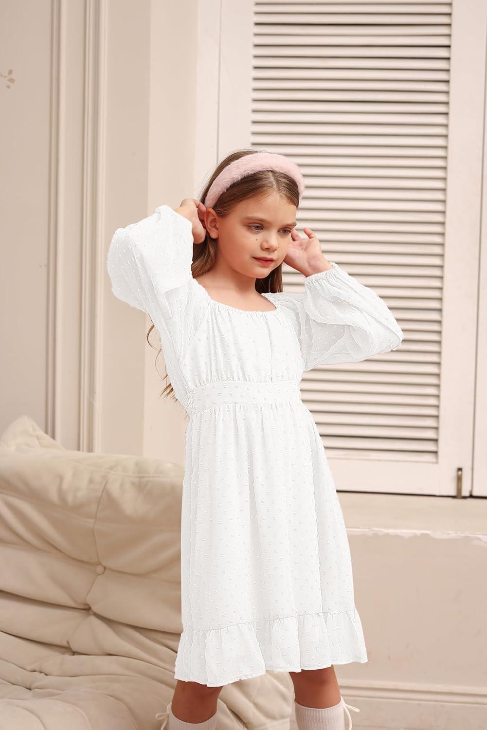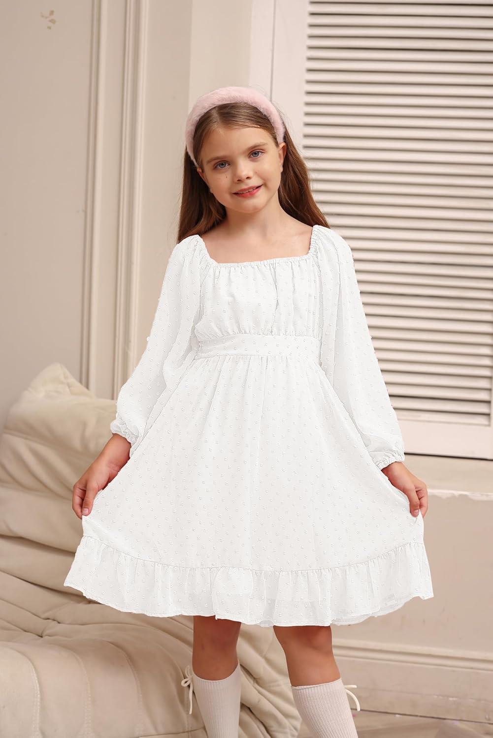 GRACE KARIN Girls Ruffle Tiered Dress Long Sleeve Swiss Dot Flowy A-Line Dress 6-14Y(White)