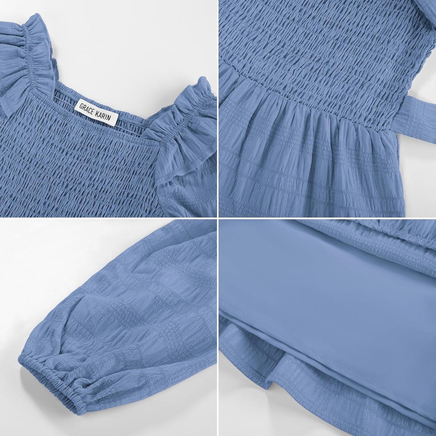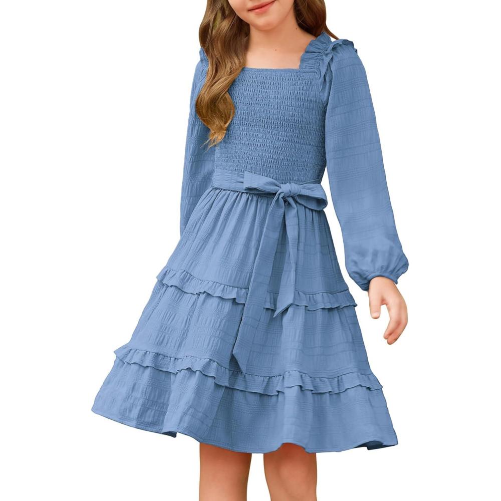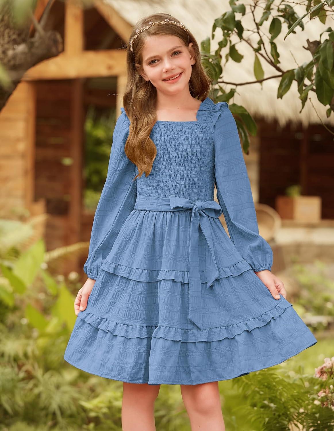 GRACE KARIN Girls Ruffled Dress 6-14Y Fall Long Sleeves Christmas Party Festive Dresses(Blue)