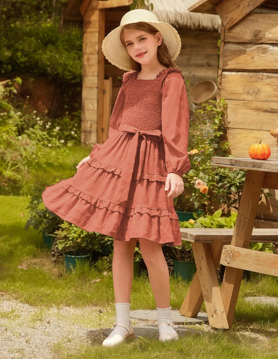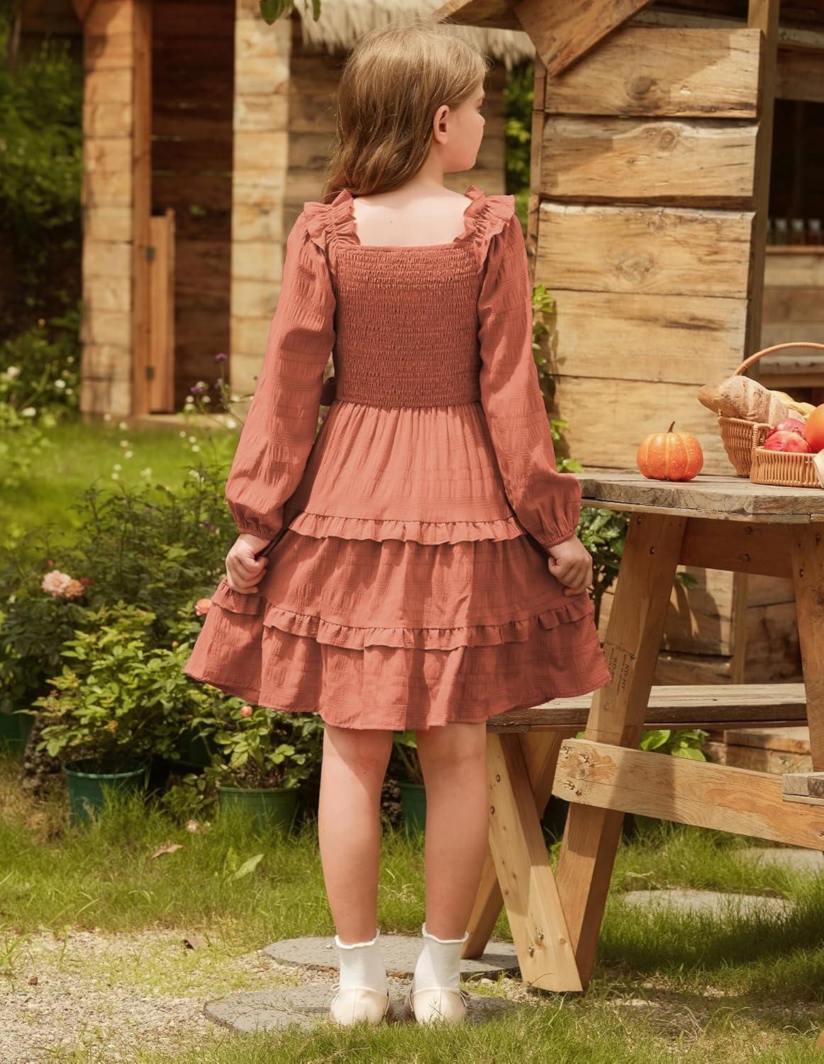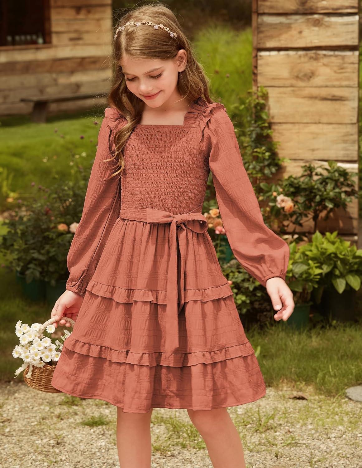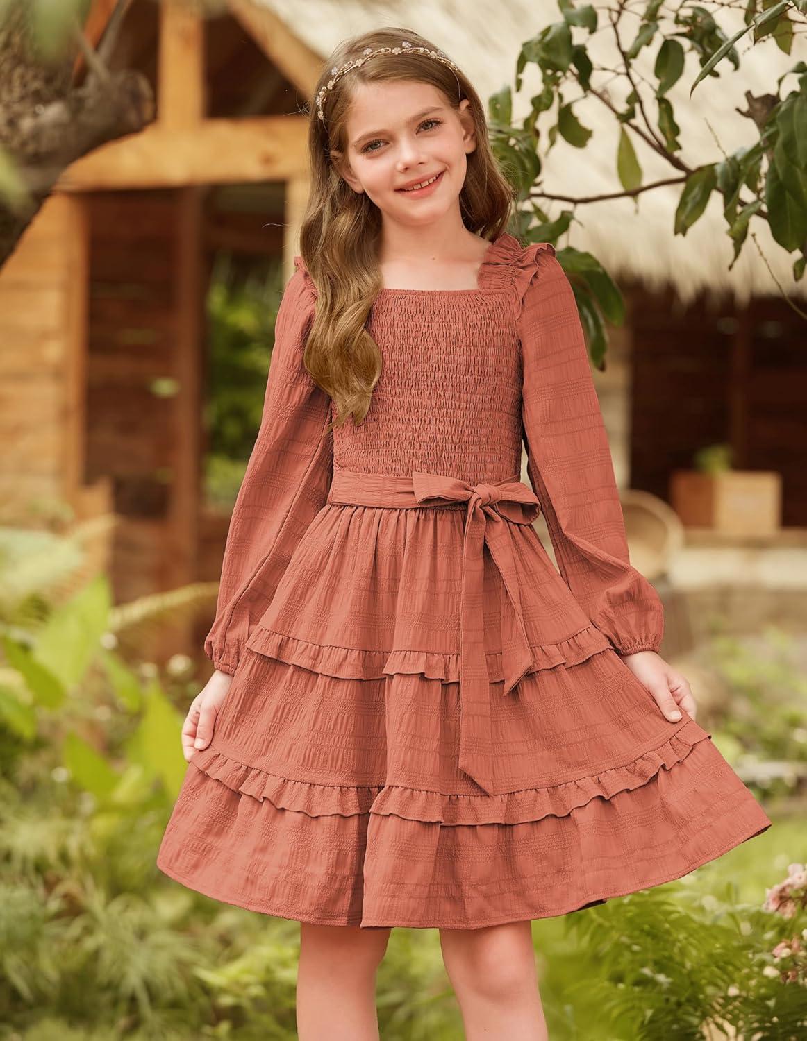 GRACE KARIN Girls Ruffled Dress 6-14Y Fall Long Sleeves Christmas Party Festive Dresses(Brown)