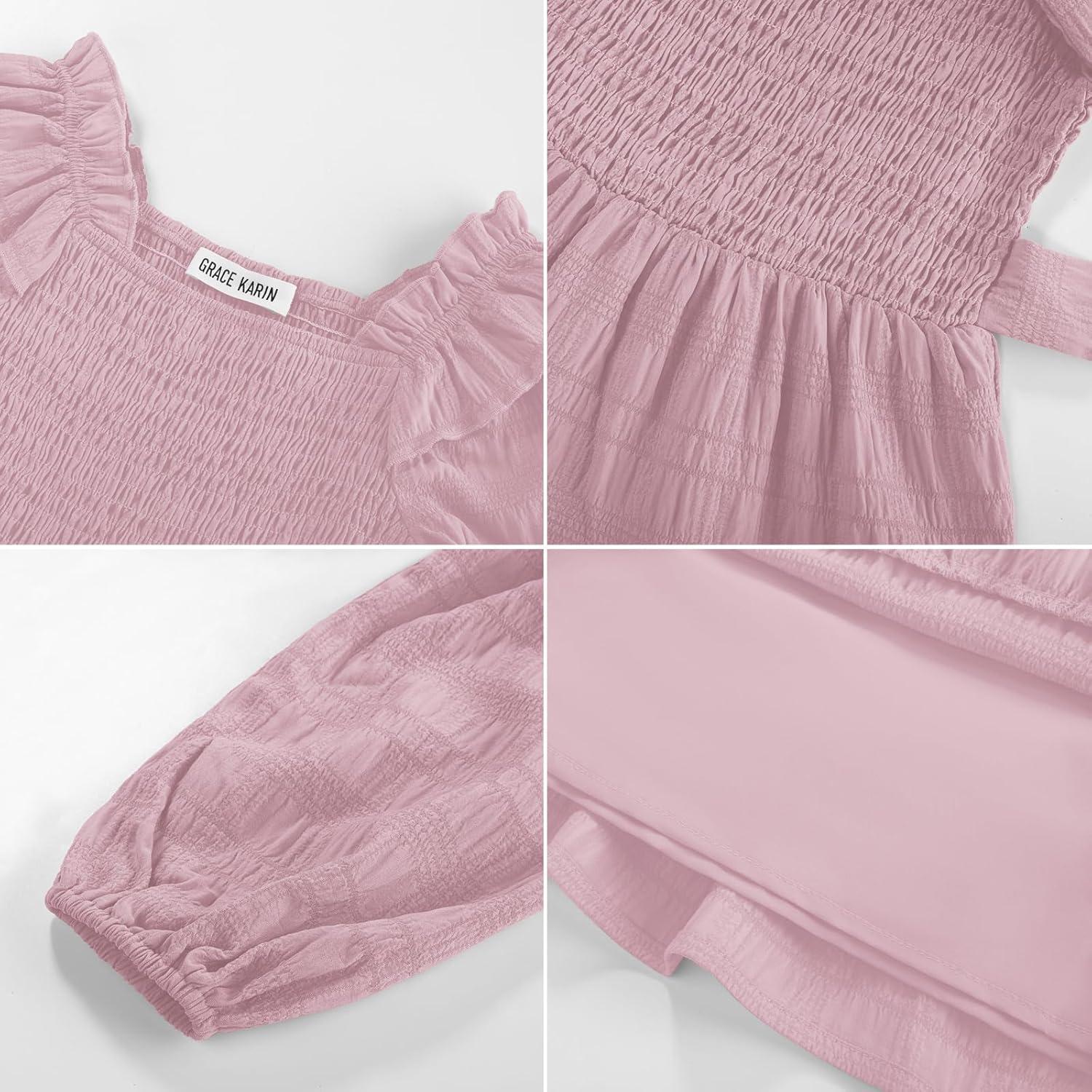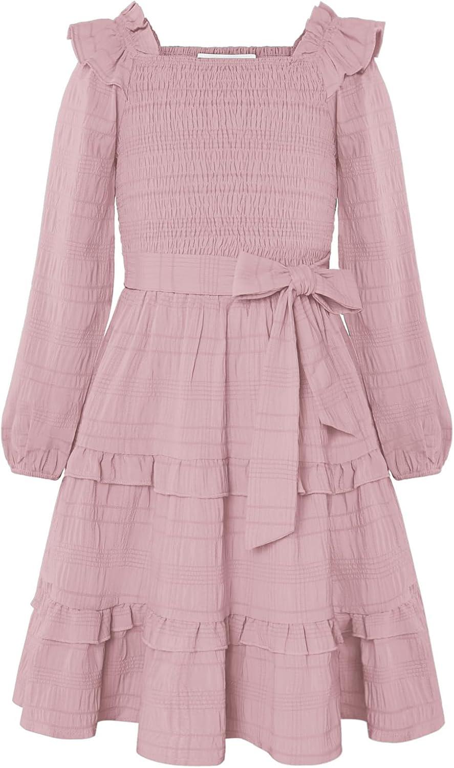 GRACE KARIN Girls Ruffled Dress 6-14Y Fall Long Sleeves Christmas Party Festive Dresses(Light Pink)
