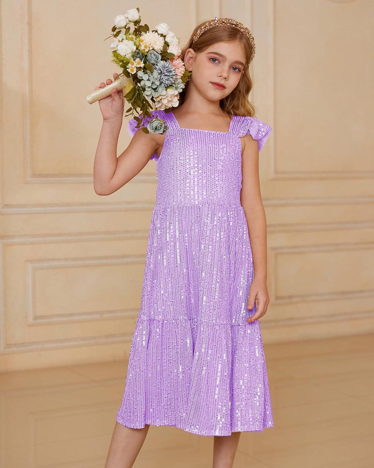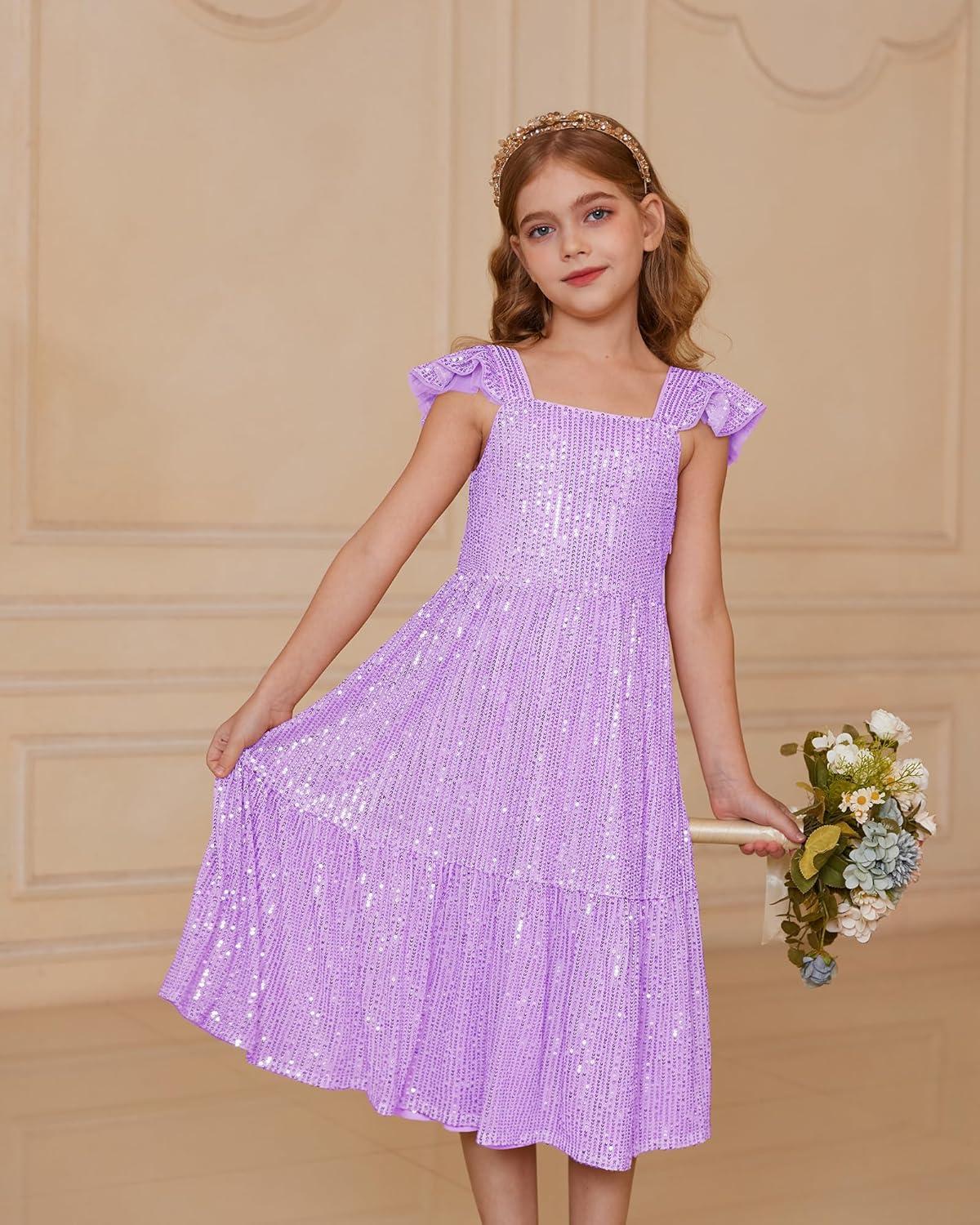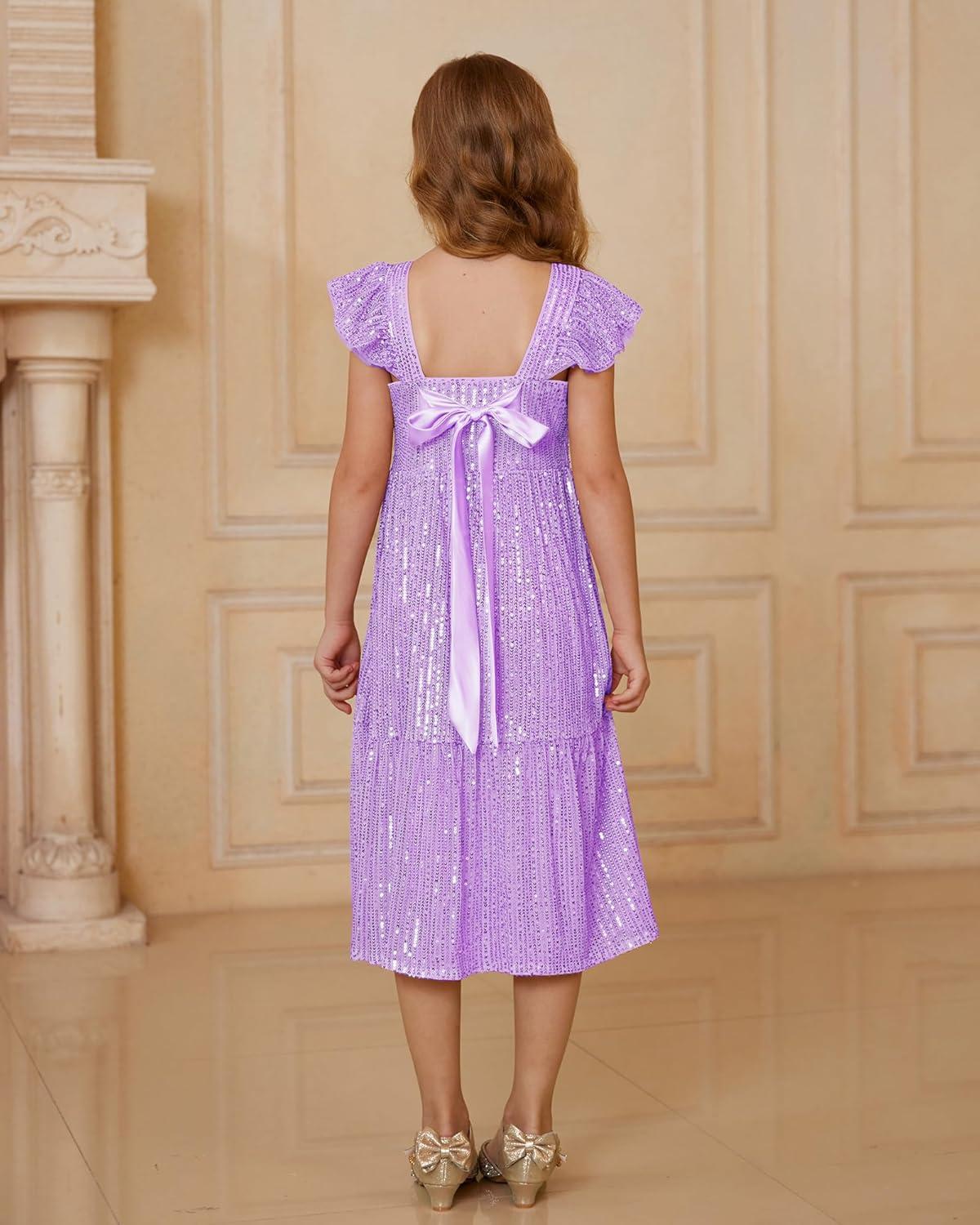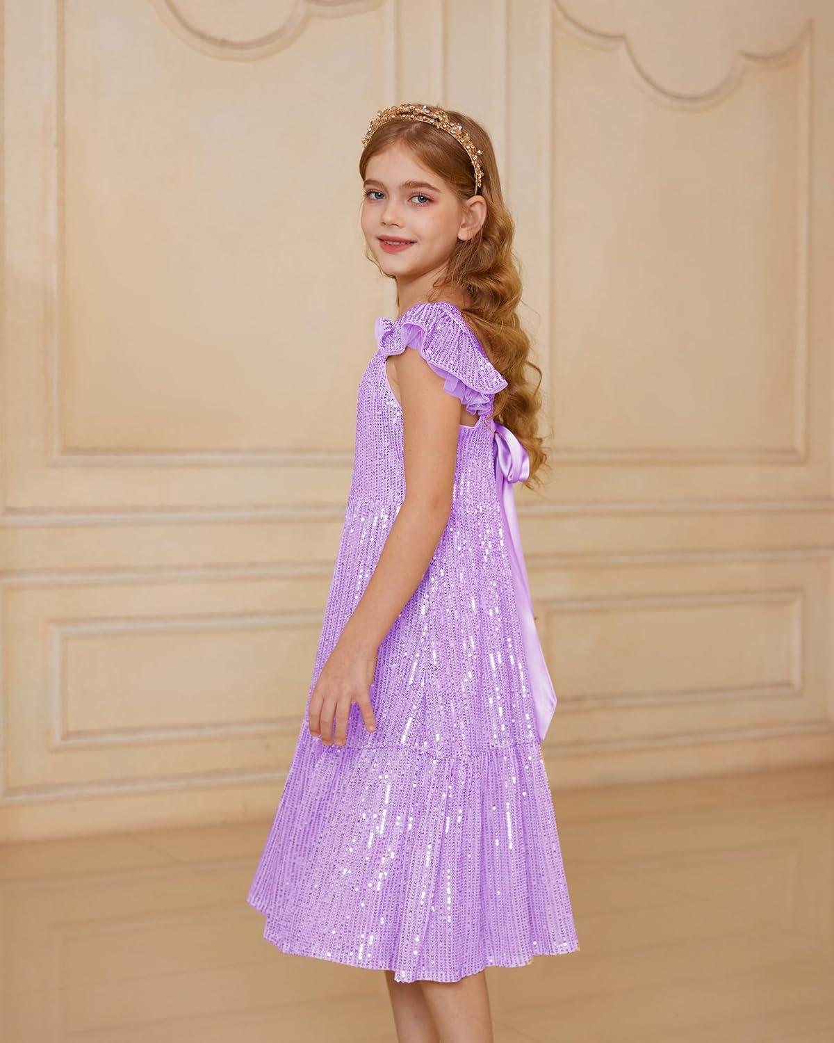 GRACE KARIN Girls Sequin Dress Flutter Sleeve A-Line Tie Back Sparkly Formal Party Dress for Girl 5-12Y(Purple)