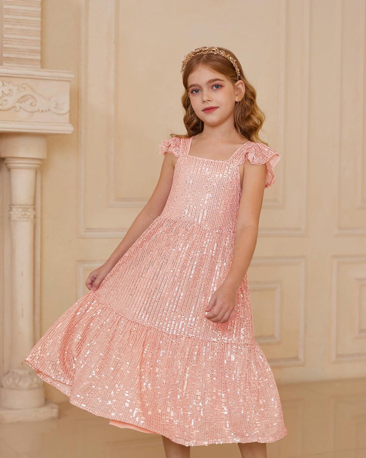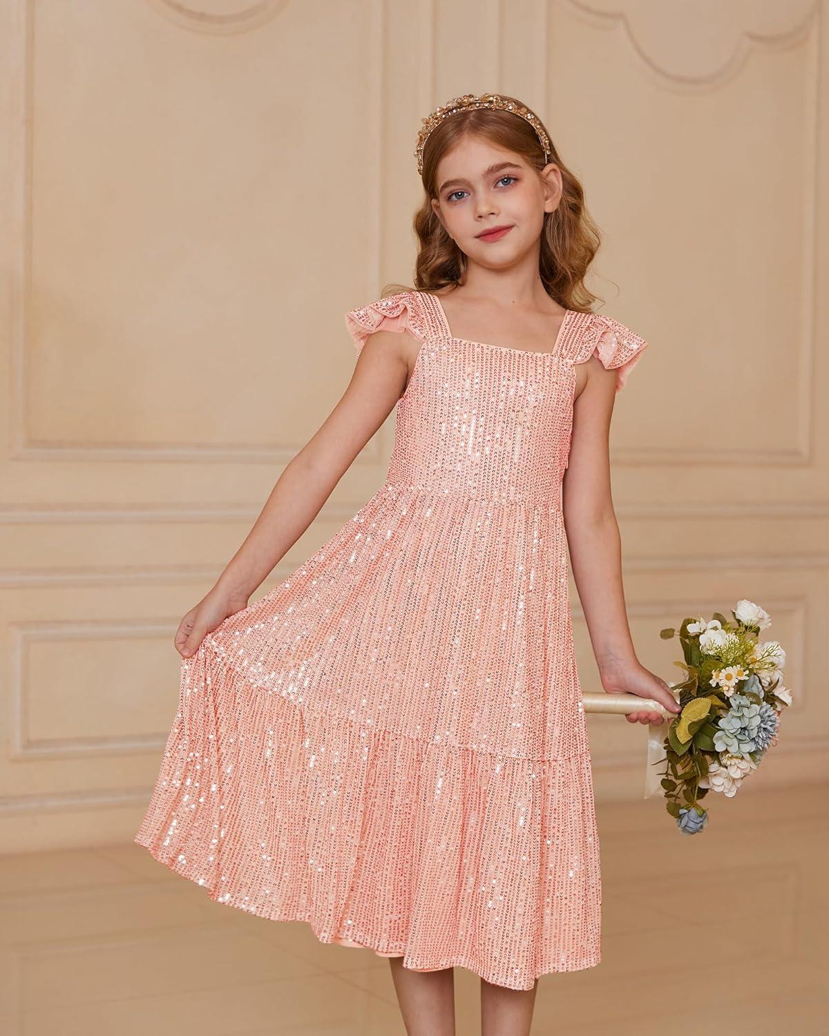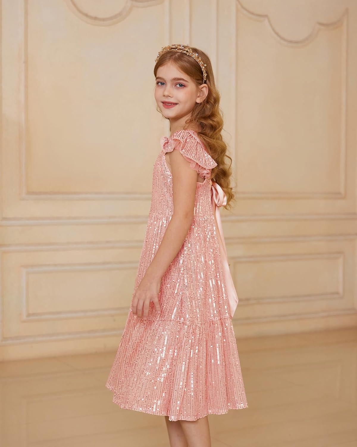 GRACE KARIN Girls Sequin Dress Flutter Sleeve A-Line Tie Back Sparkly Formal Party Dress for Girl 5-12Y(Rose Gold)