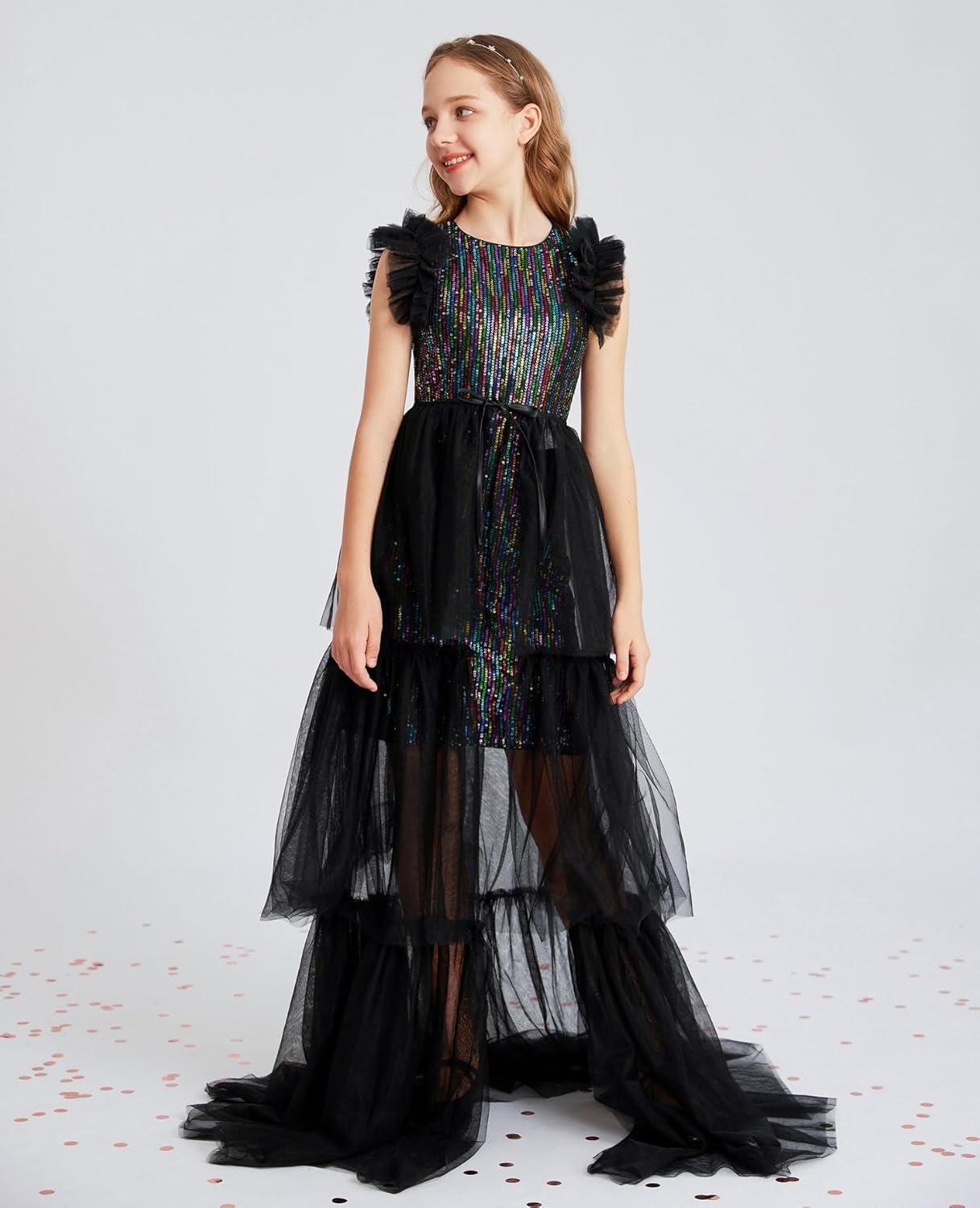 GRACE KARIN Girls Sequin Dress Formal Pageant Sparkle Party Ruffle Prom Maxi Dress Size 5-14Y(Black)