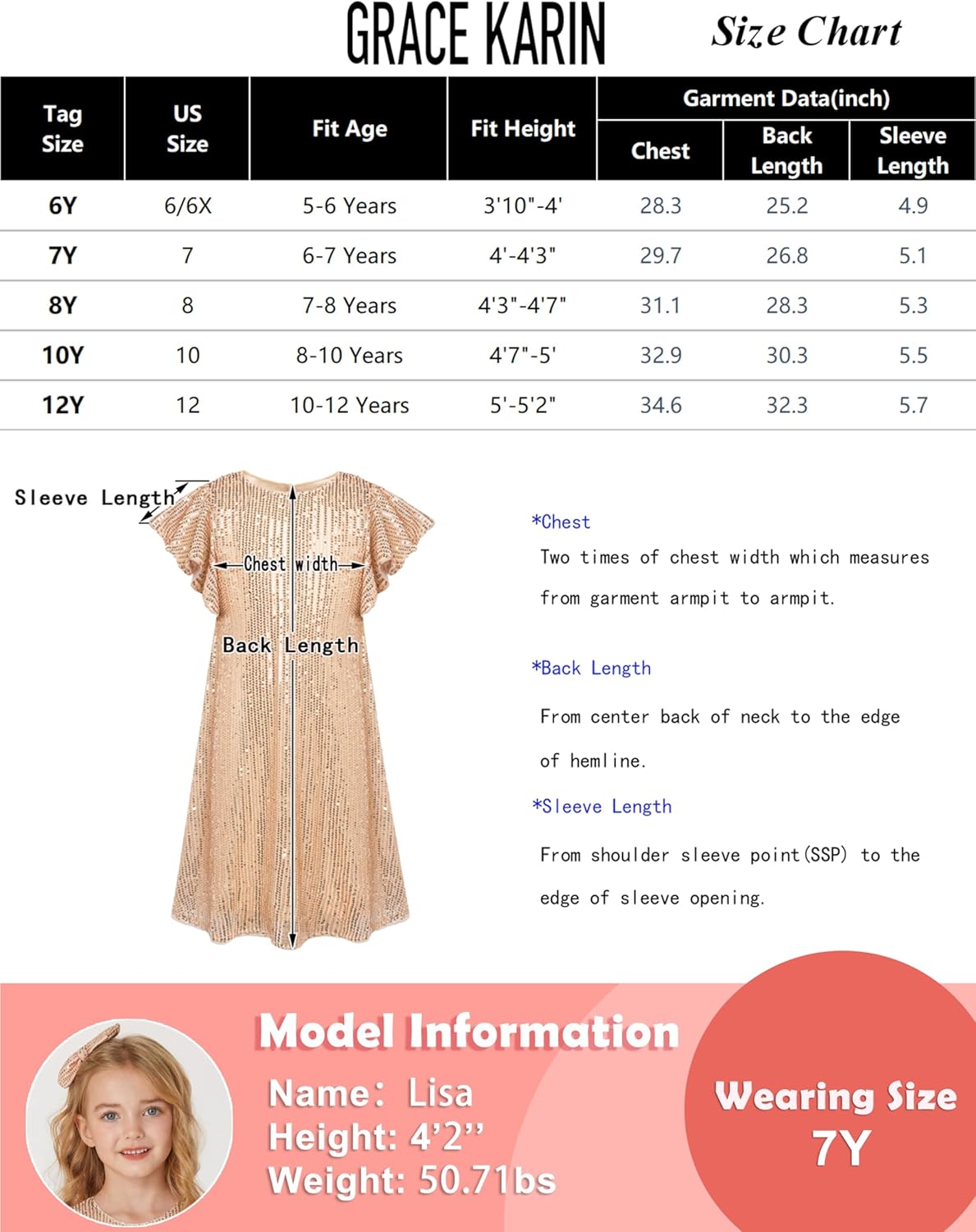 imageGRACE KARIN Girls Sequin Dress Short Flutter Sleeve Flare Silhouette Midi Dress with Hairbow 512YRainbow