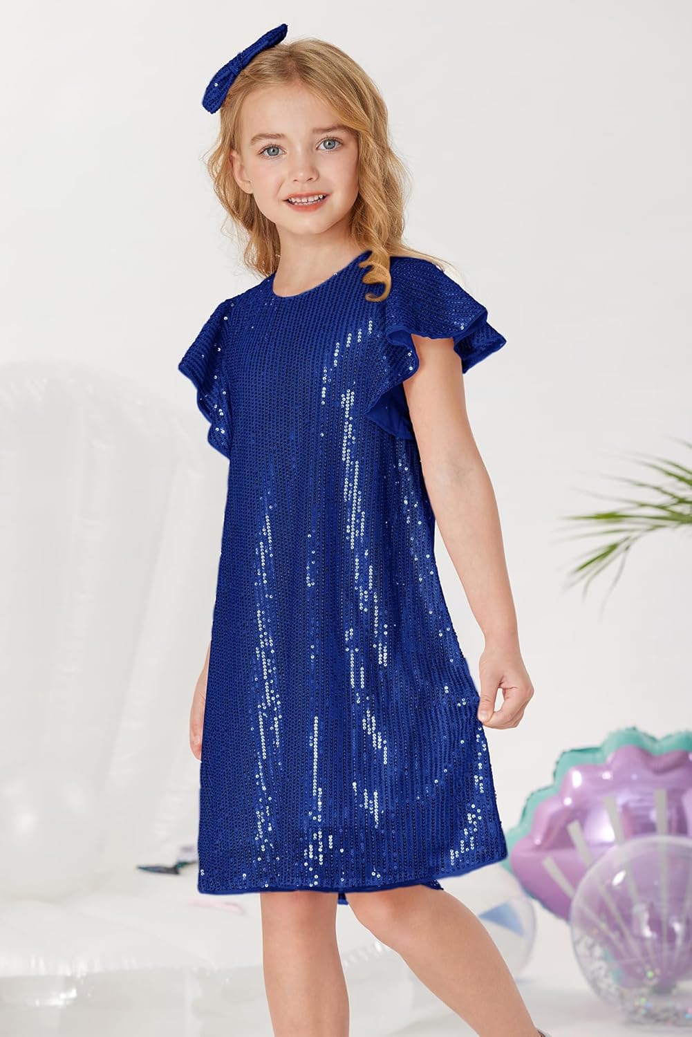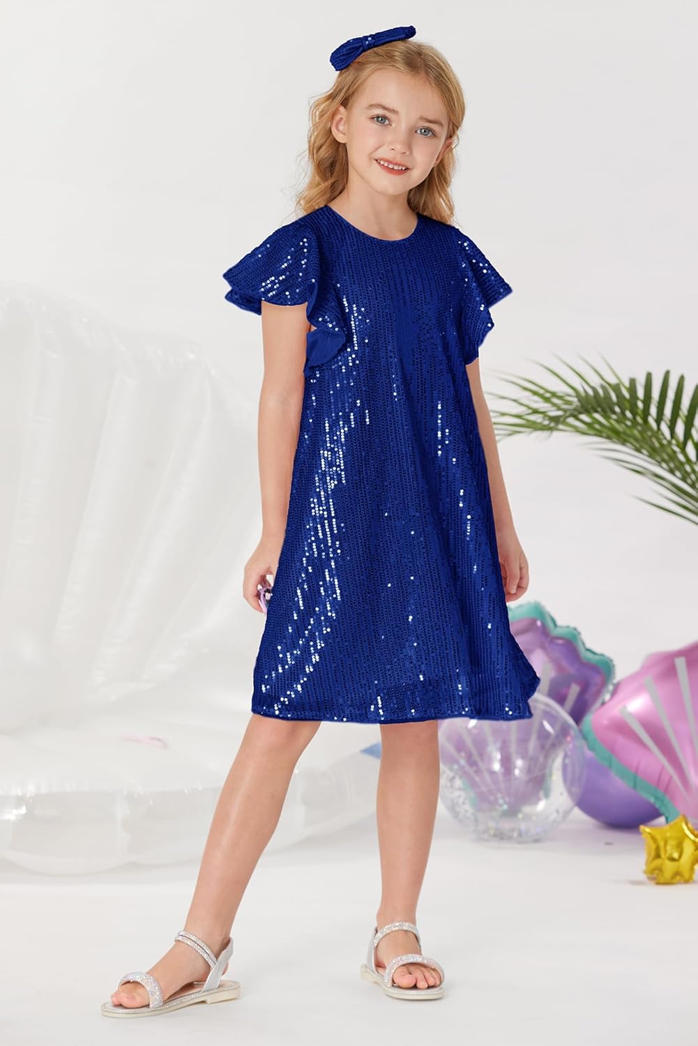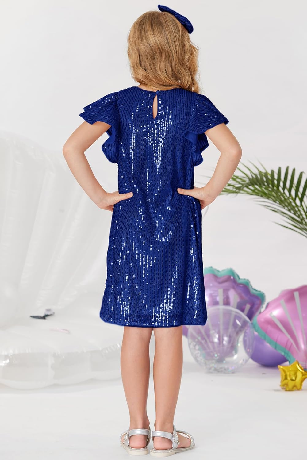 GRACE KARIN Girls Sequin Dress Short Flutter Sleeve Flare Silhouette Midi Dress with Hairbow 5-12Y(Royal Blue)